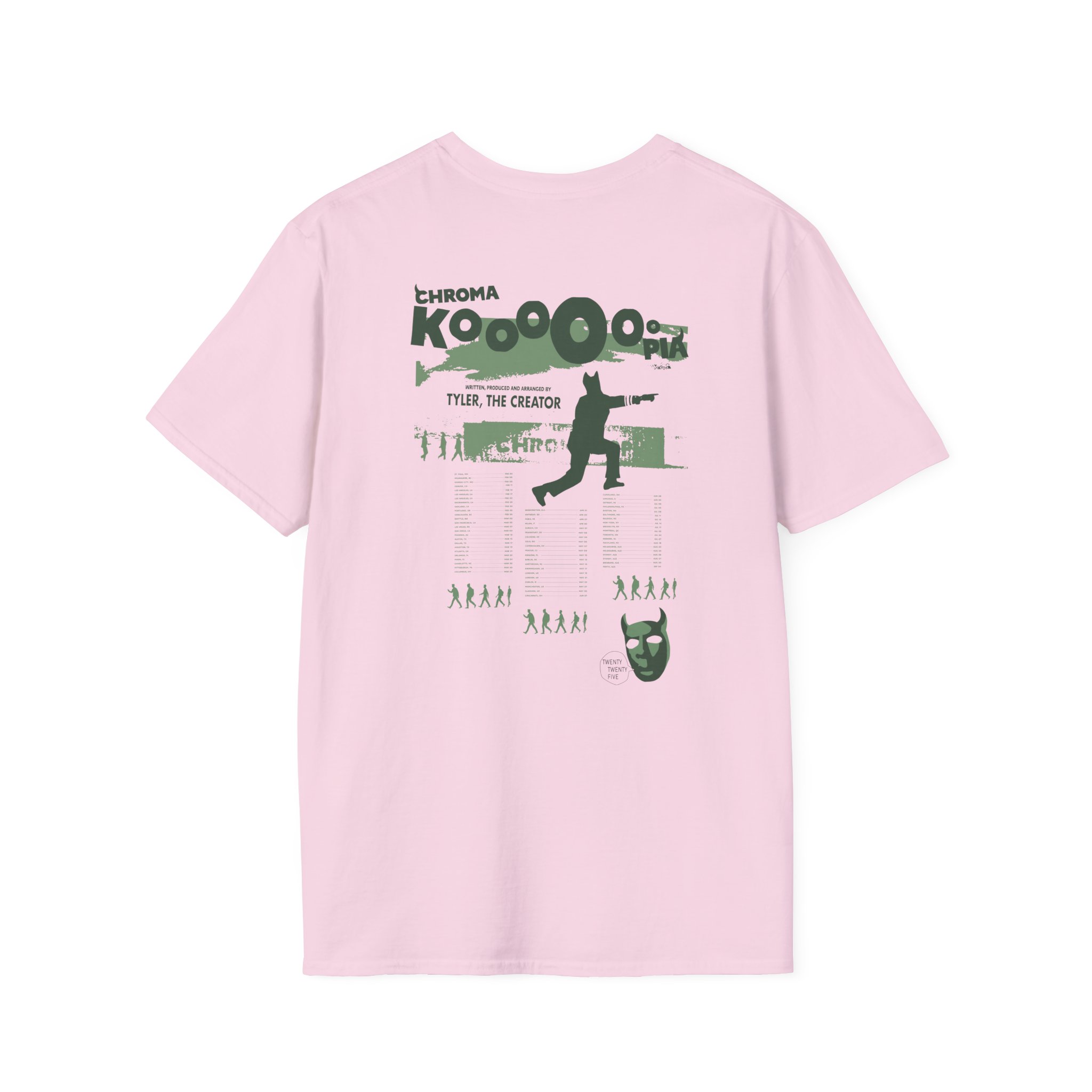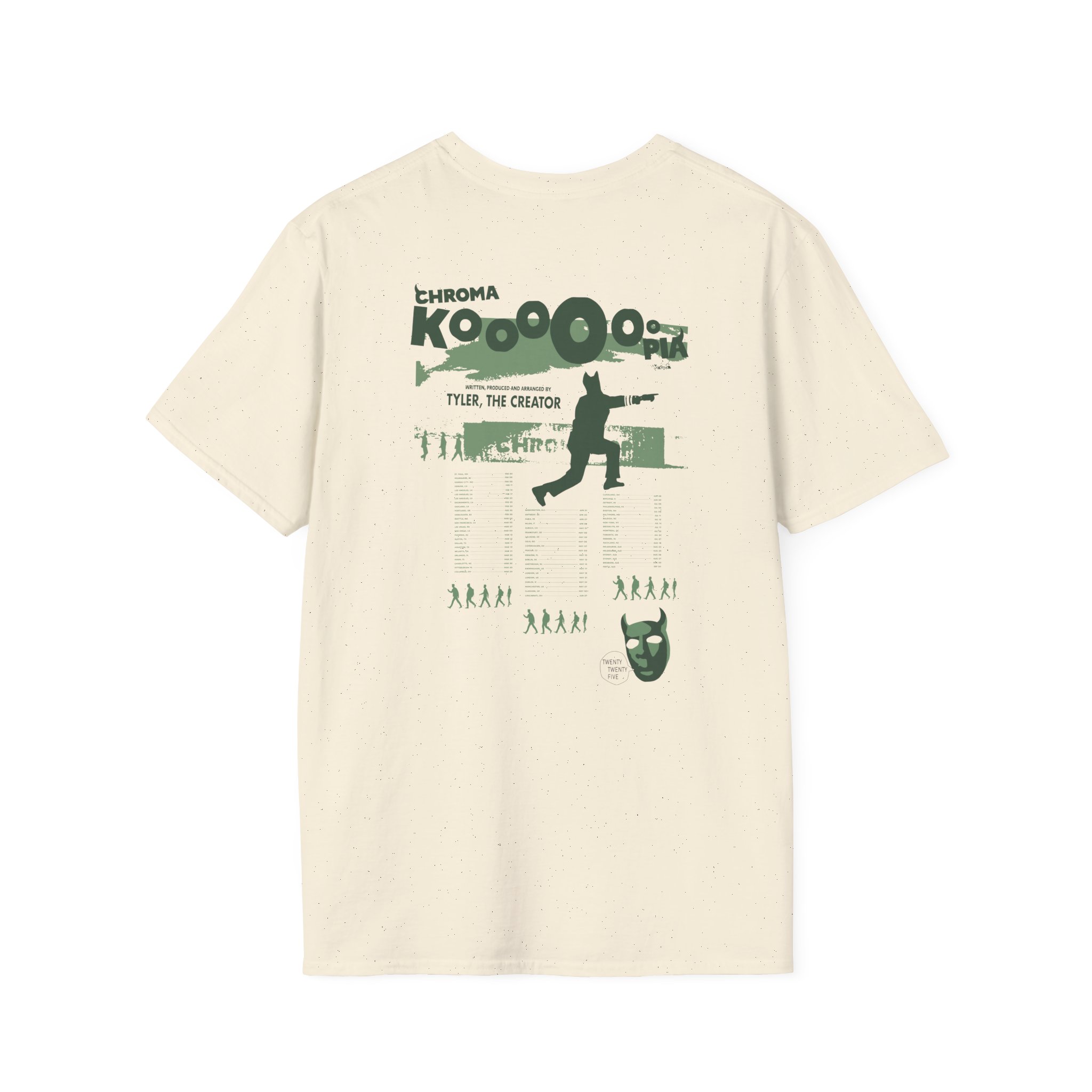 The Chromakopia Signature Tour Dates unisex soft-style t-shirt puts a new spin on casual comfort. Made from very soft materials, this tee is 100% cotton for solid colors. Heather colors and sports grey include polyester. The shoulders have twill tape for improved durability. There are no side seams. The collar is made with ribbed knitting to prevent curling damage.
