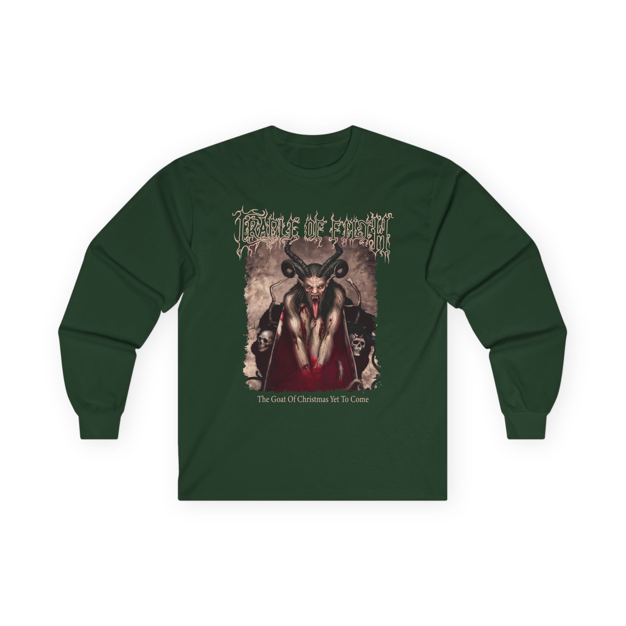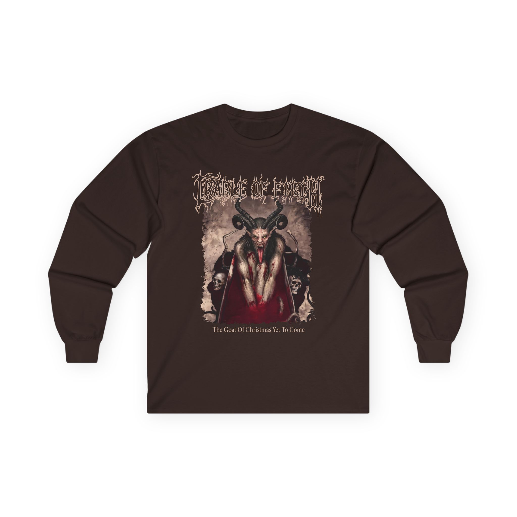 A bit more formal than a standard-issue t-shirt, the Cradle of Filth Krampus ultra cotton long sleeve tee is a clear comfort winner. The sleeves also act as a nice frame. There are no side seams. The shoulders are taped for improved durability. This makes for a good fitting around the shoulders and neck. The cotton used for these shirts is environmentally friendly.