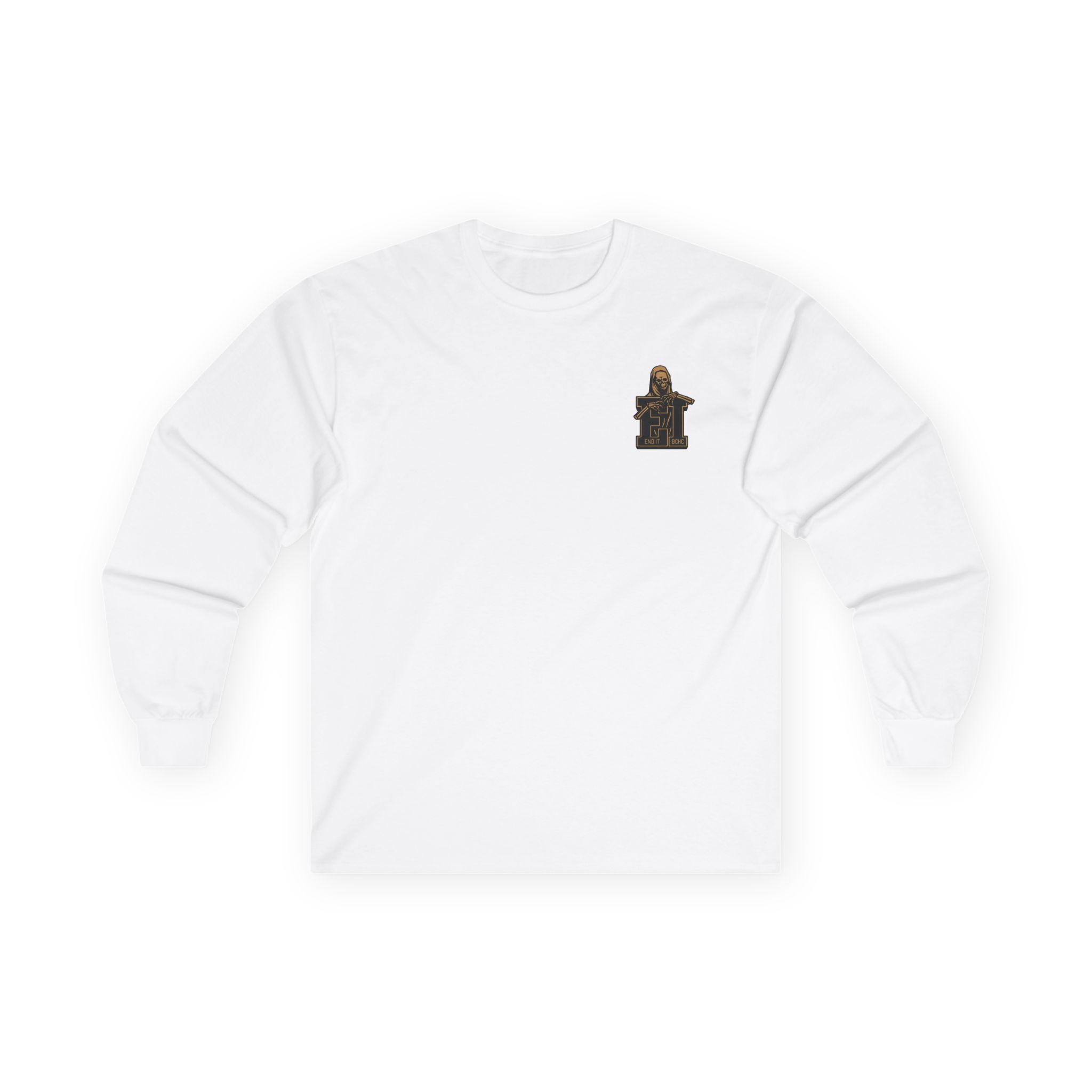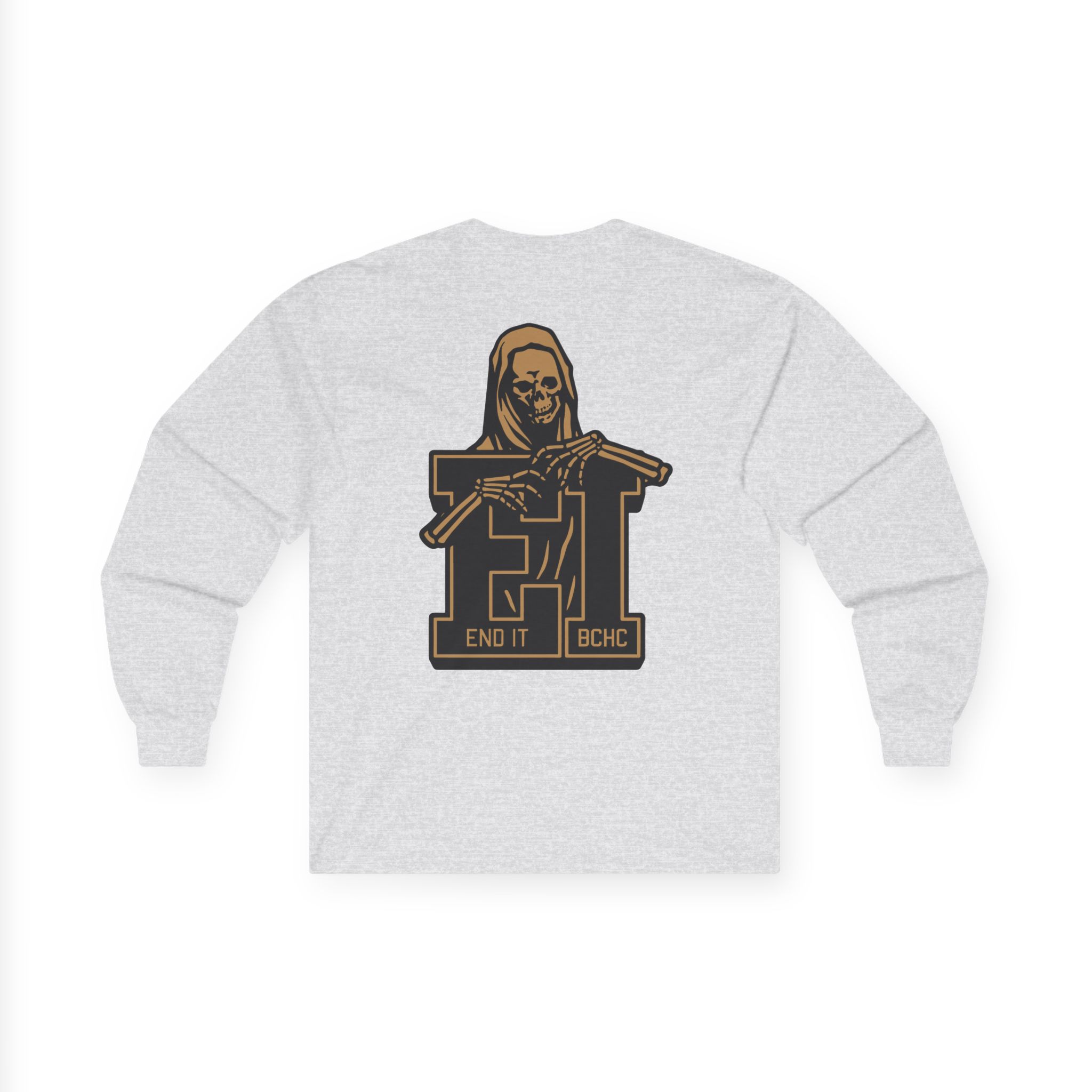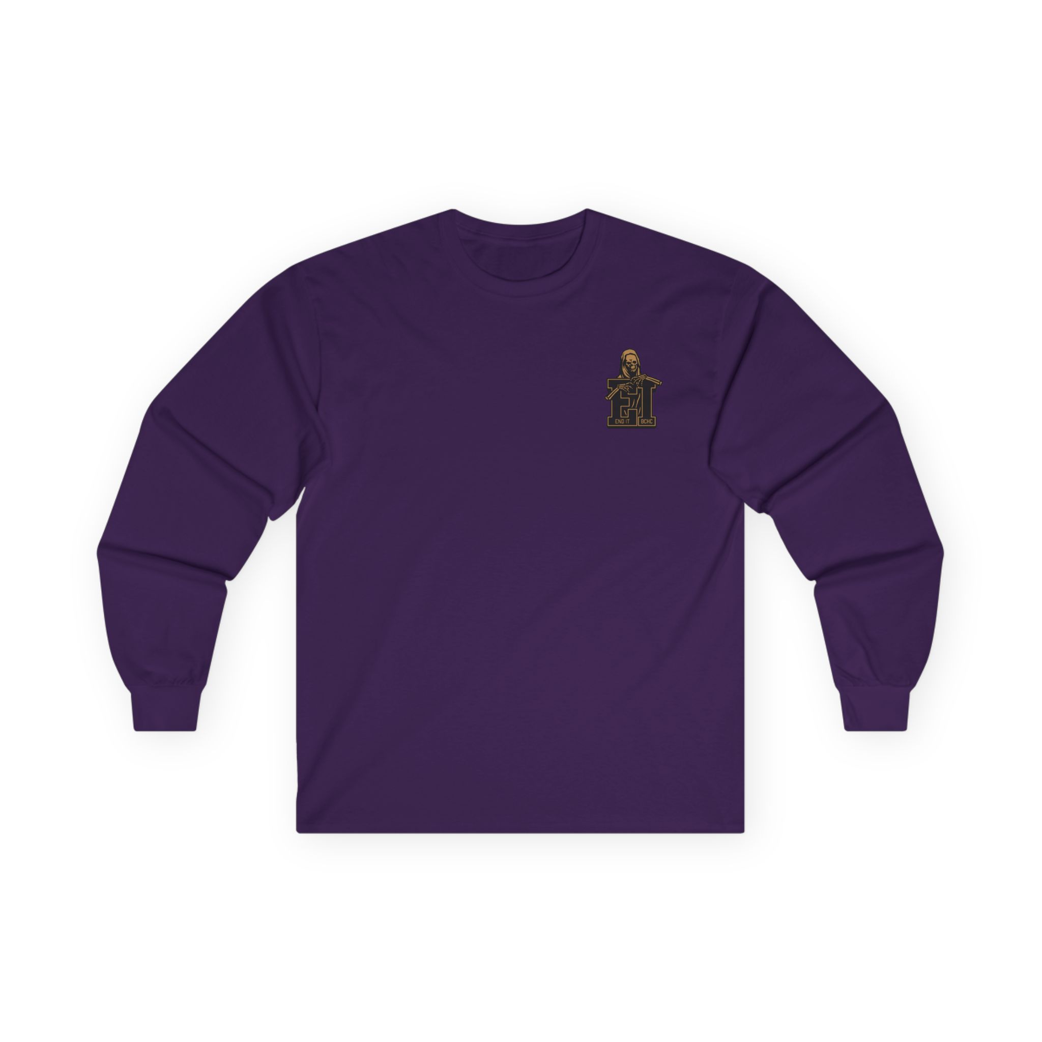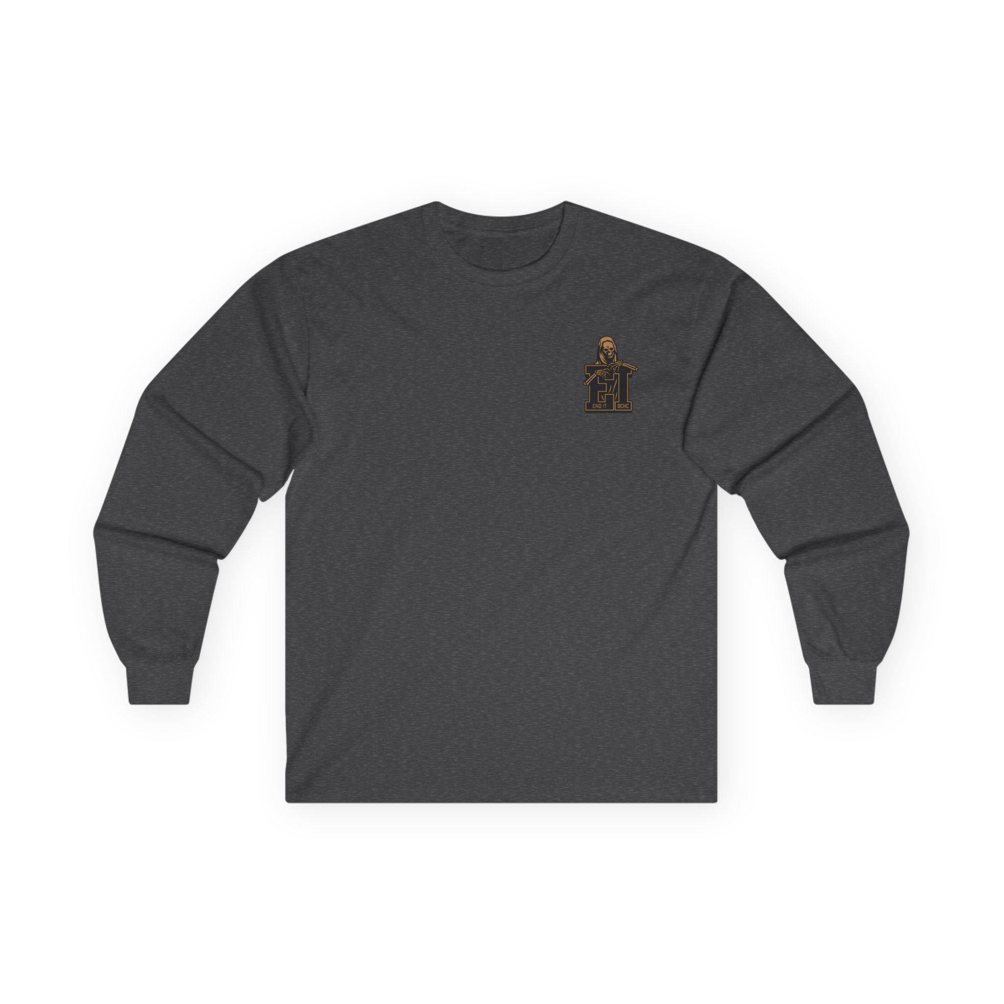 A bit more formal than a standard-issue t-shirt, the End It Bchc Reaper Emblem ultra cotton long sleeve tee is a clear comfort winner. The sleeves also act as a nice frame. There are no side seams. The shoulders are taped for improved durability. This makes for a good fitting around the shoulders and neck. The cotton used for these shirts is environmentally friendly.