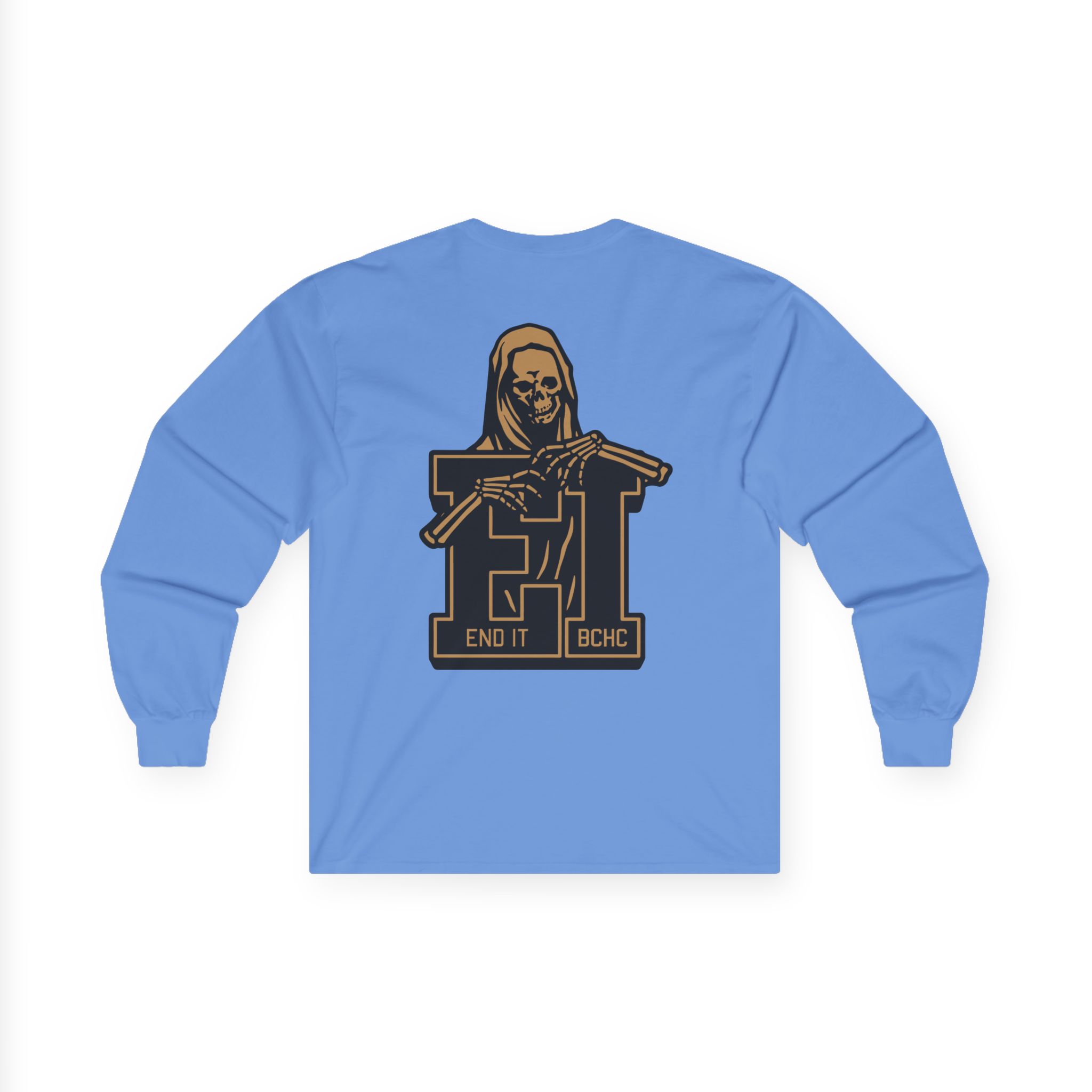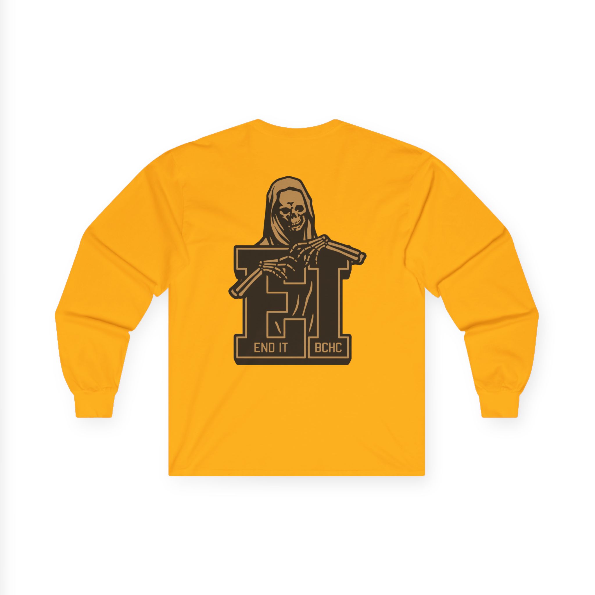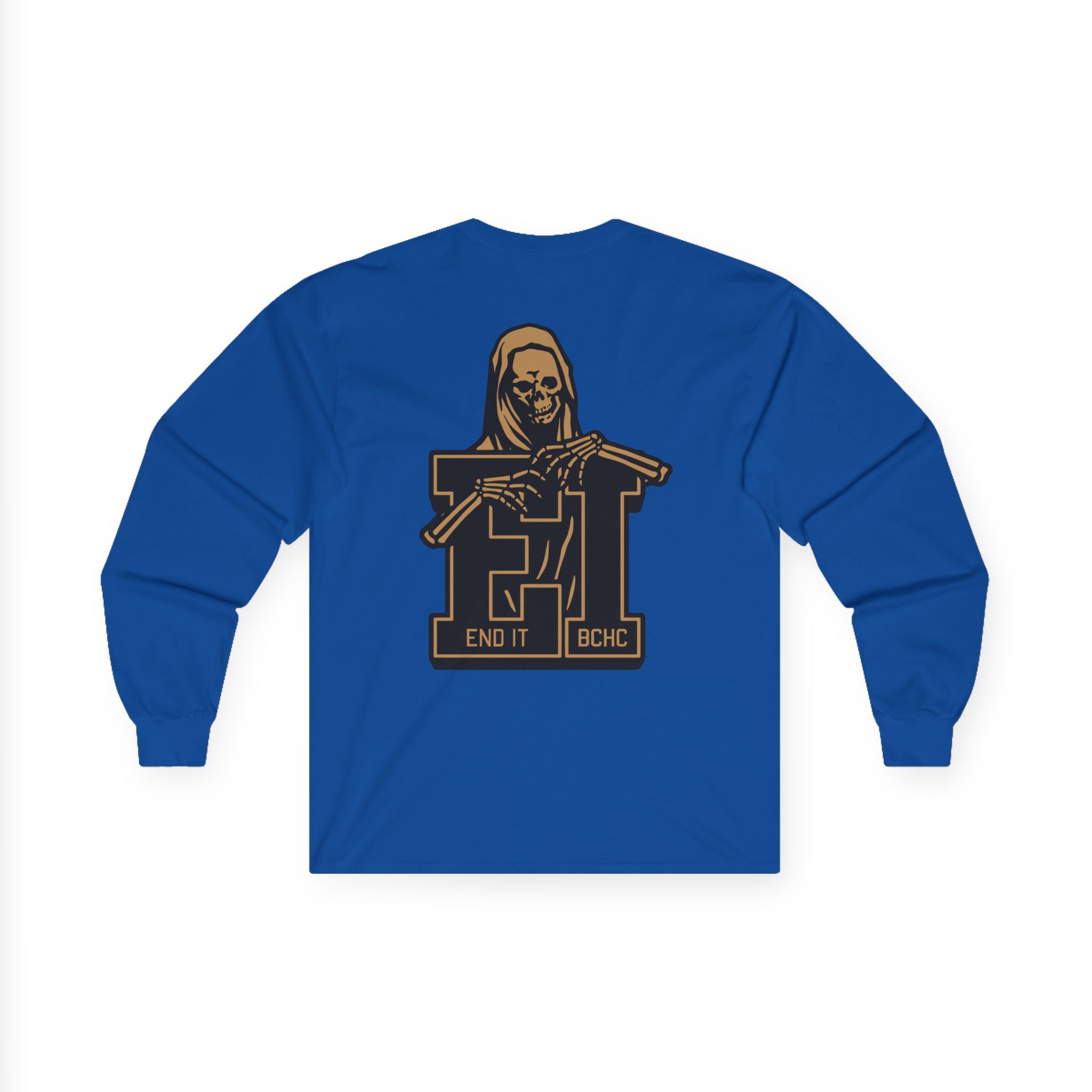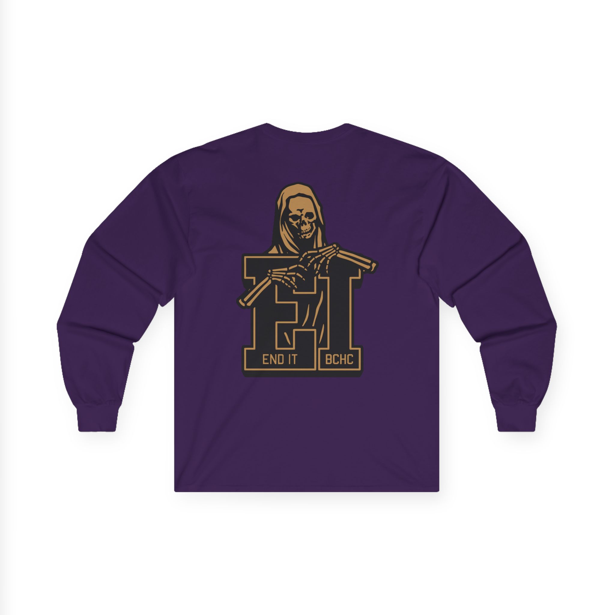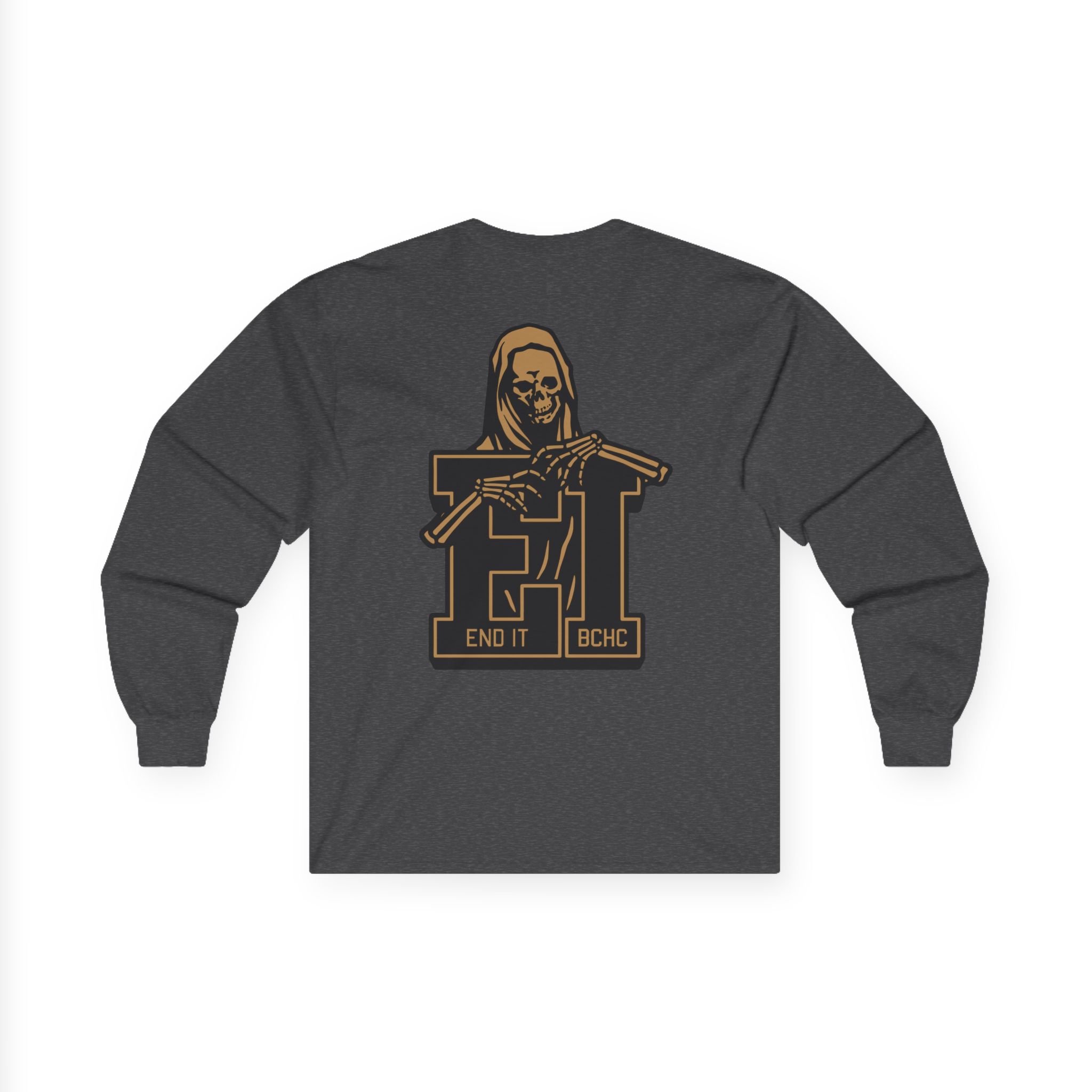 A bit more formal than a standard-issue t-shirt, the End It Bchc Reaper Emblem ultra cotton long sleeve tee is a clear comfort winner. The sleeves also act as a nice frame. There are no side seams. The shoulders are taped for improved durability. This makes for a good fitting around the shoulders and neck. The cotton used for these shirts is environmentally friendly.