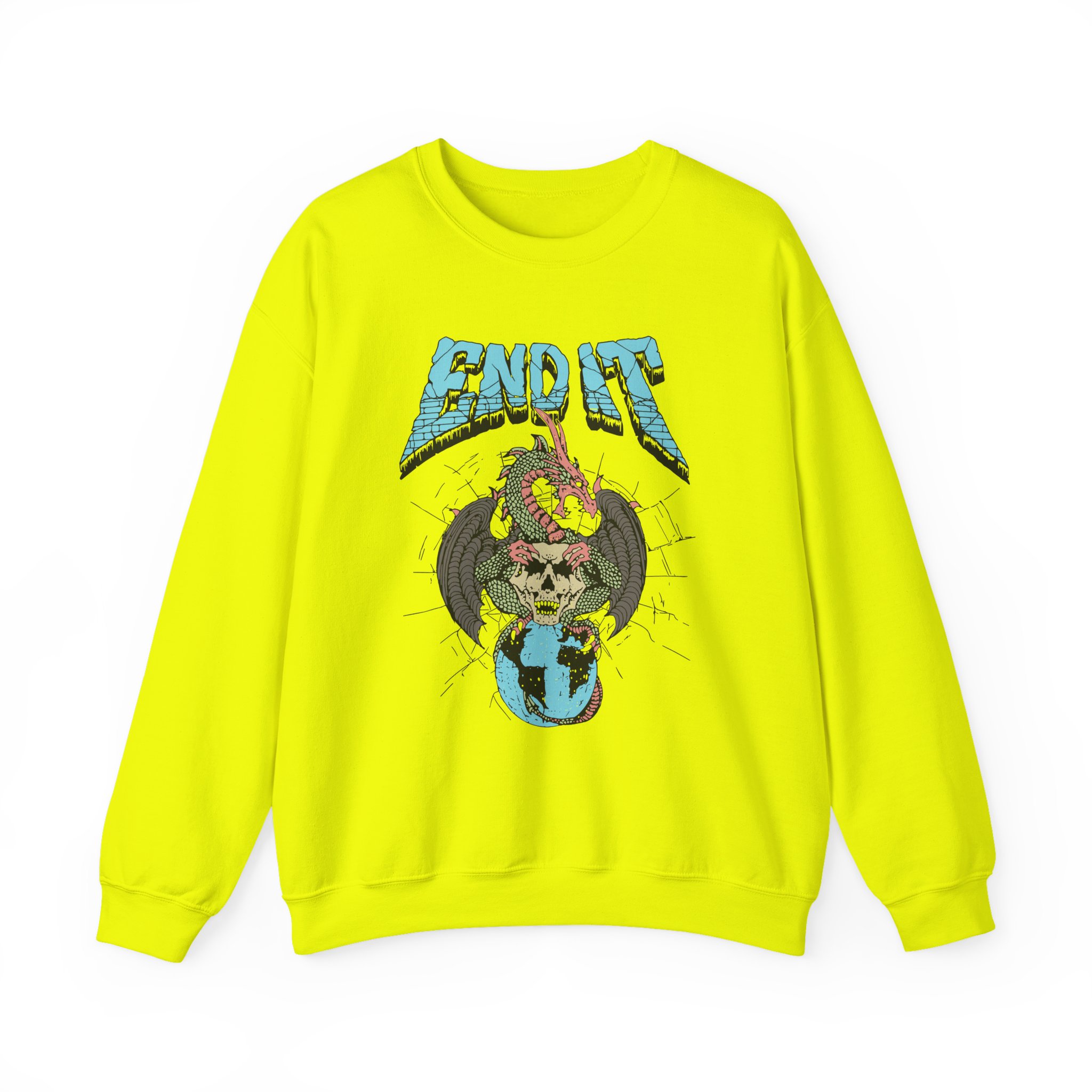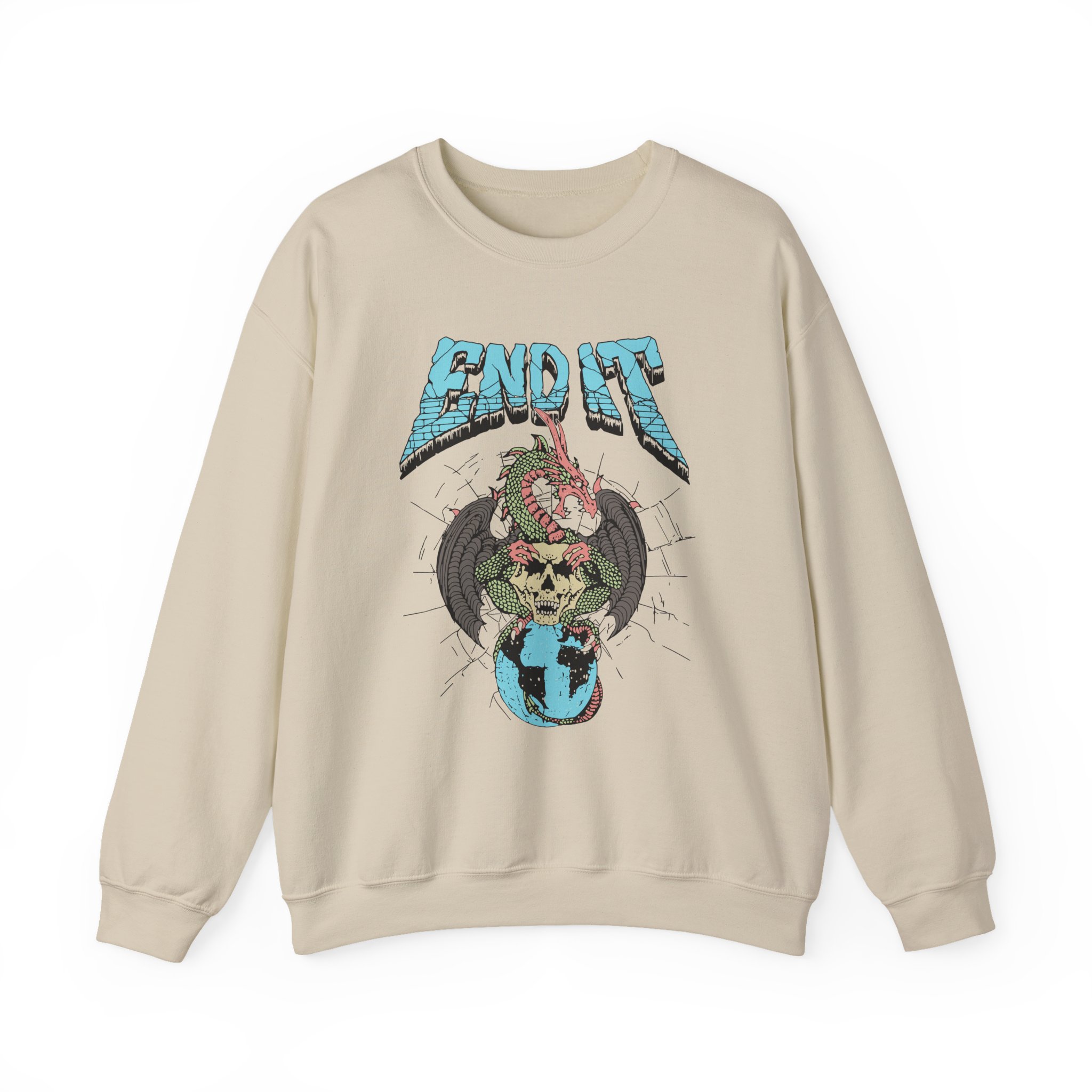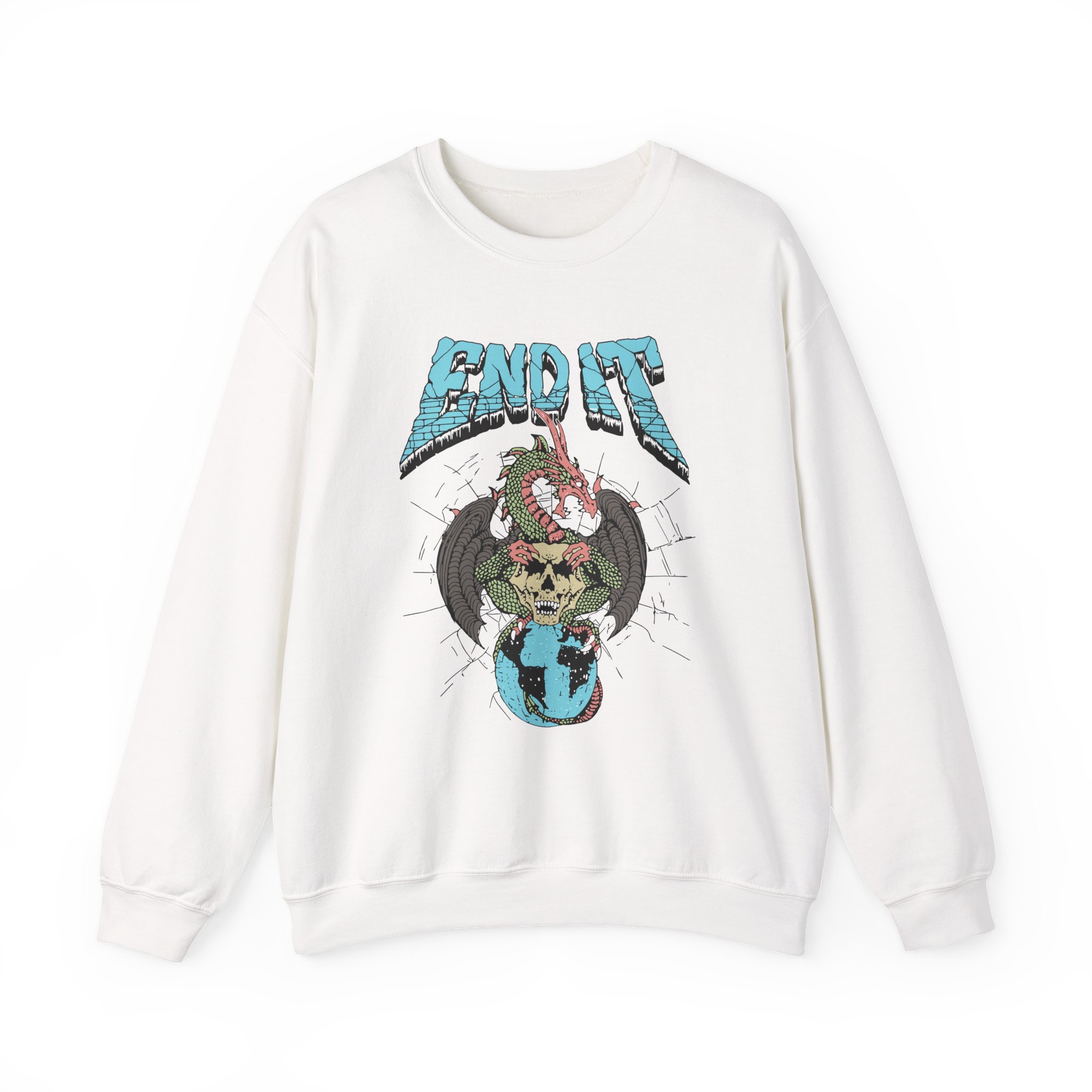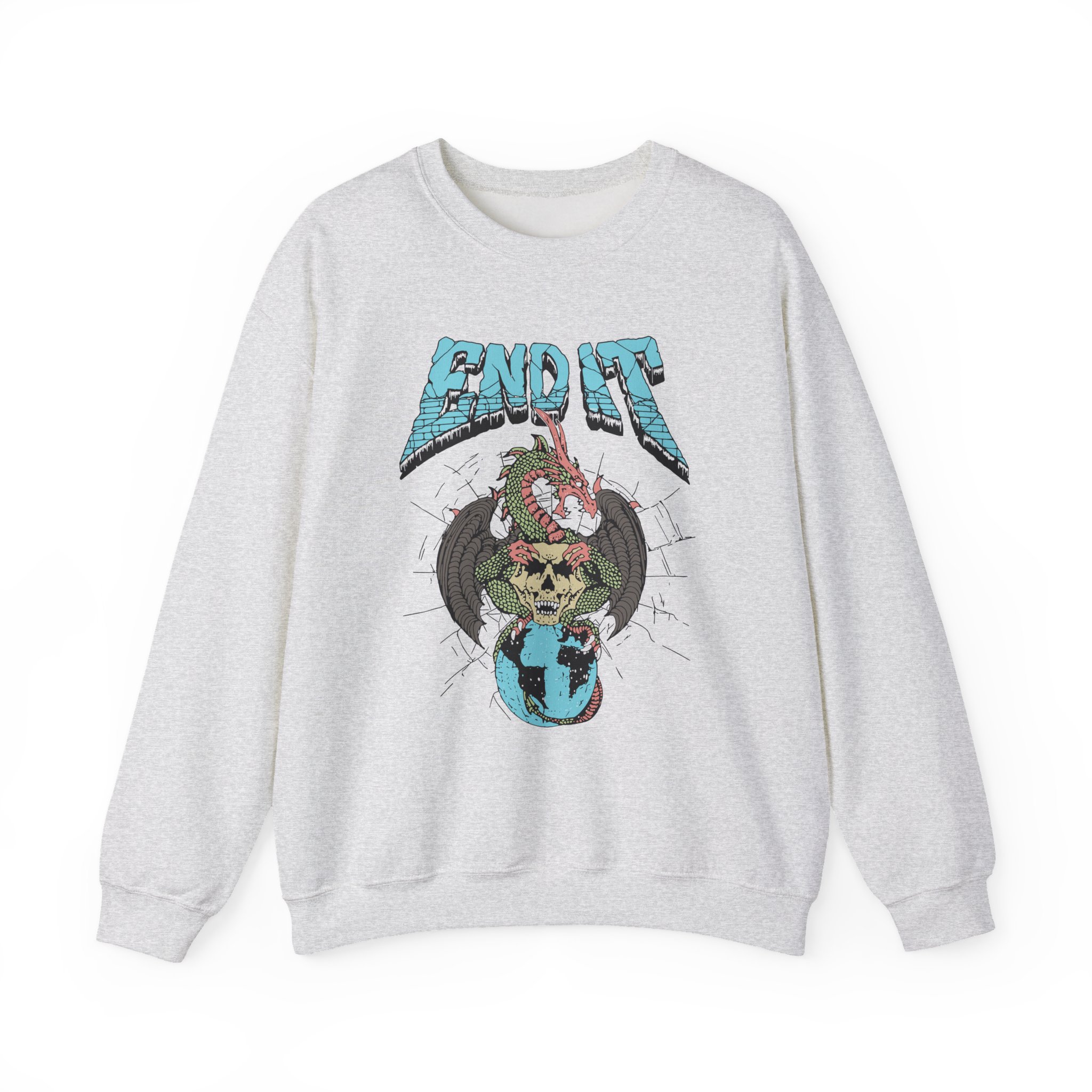 Ideal for any situation, a End It Dragon Skull unisex heavy blend crewneck sweatshirt is pure comfort. These garments are made from polyester and cotton. This combination helps designs come out looking fresh and beautiful. The collar is ribbed knit, so it retains its shape even after washing. There are no itchy side seams on these sweaters.