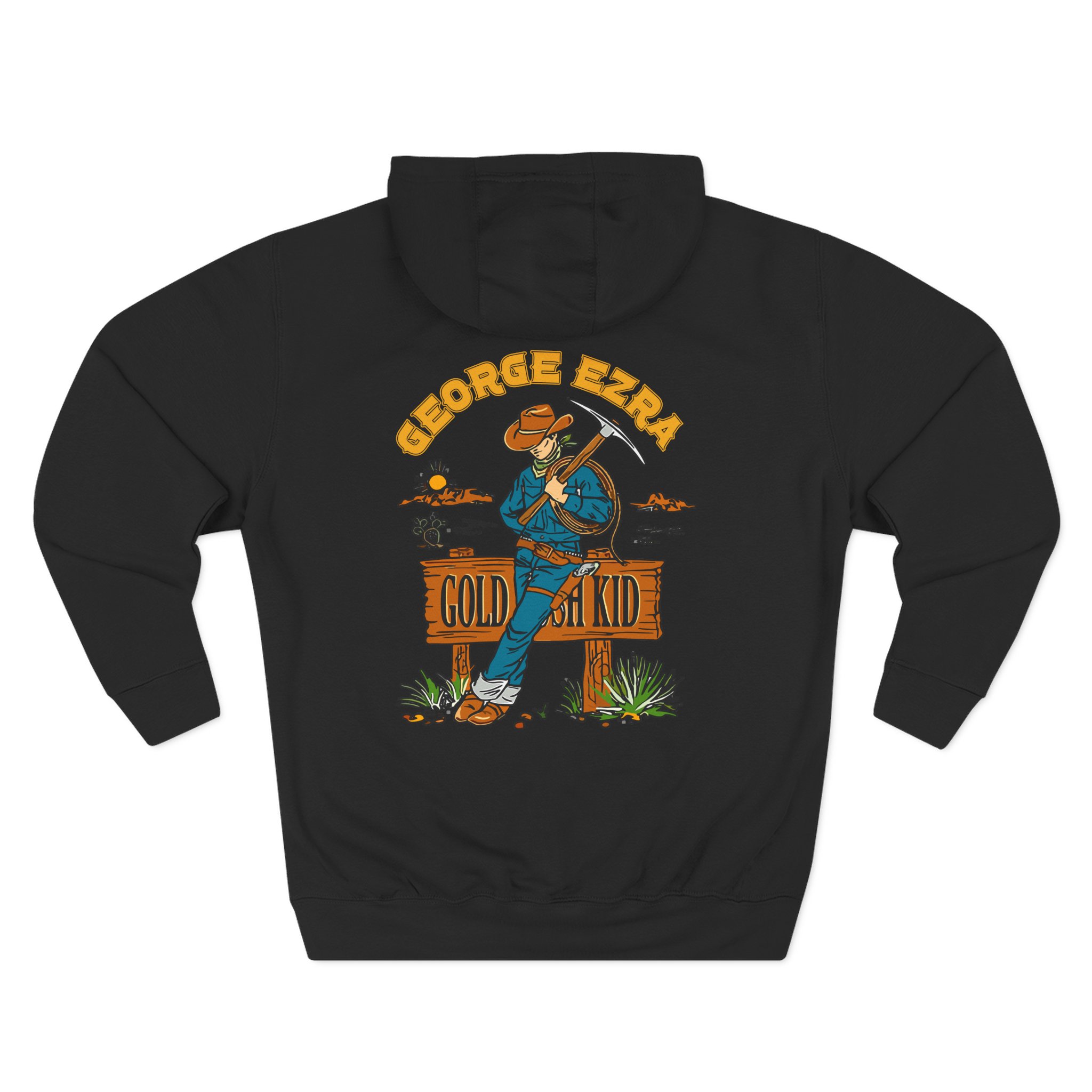 Beat the cold with this George Ezra Leaning Gold Rush Kid premium pullover hoodie that’s just the right layer of warm and cozy. Made with three-panel fleece lining, this pullover is double stitched for durability and roomy. Pick one in your favorite color to match your style.