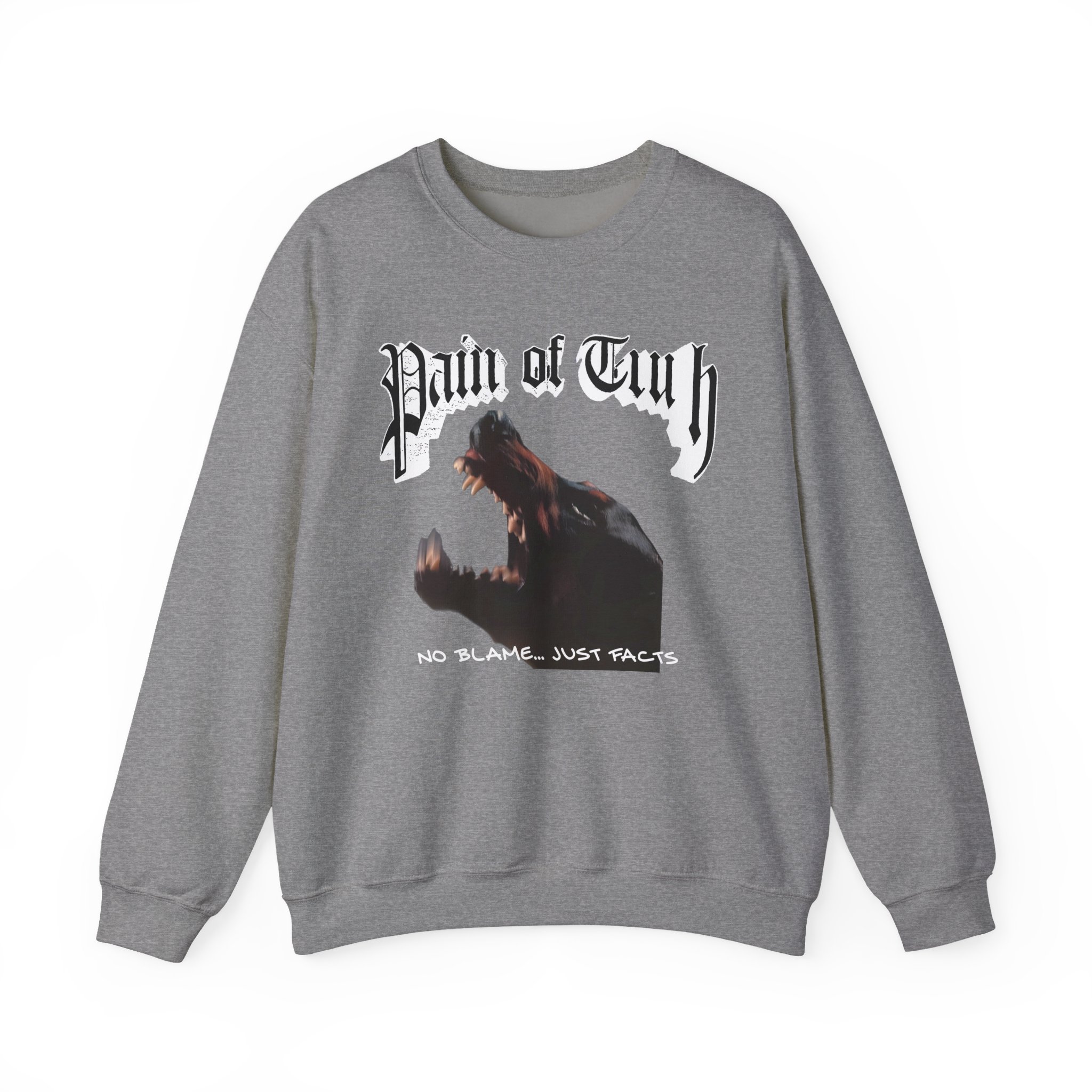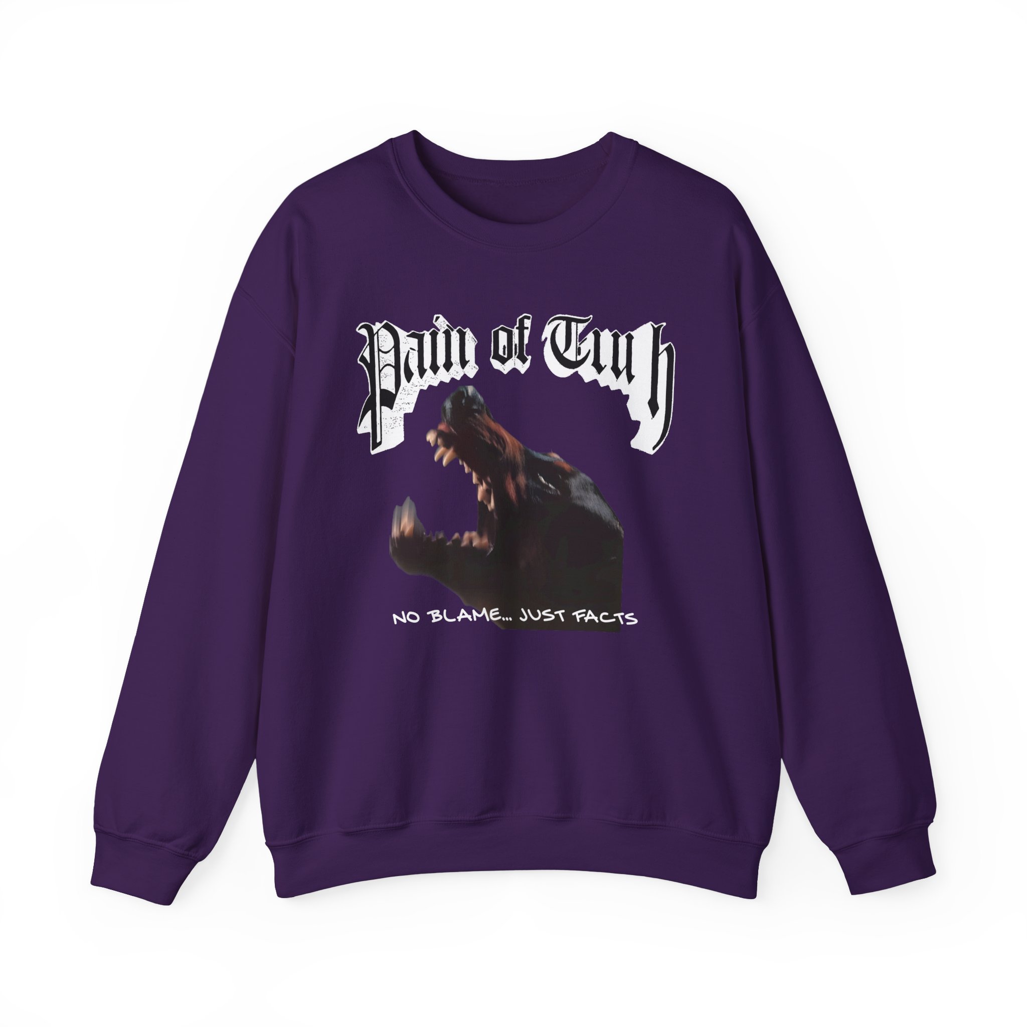 Ideal for any situation, a Pain of Truth No Blame…just Facts unisex heavy blend crewneck sweatshirt is pure comfort. These garments are made from polyester and cotton. This combination helps designs come out looking fresh and beautiful. The collar is ribbed knit, so it retains its shape even after washing. There are no itchy side seams on these sweaters.