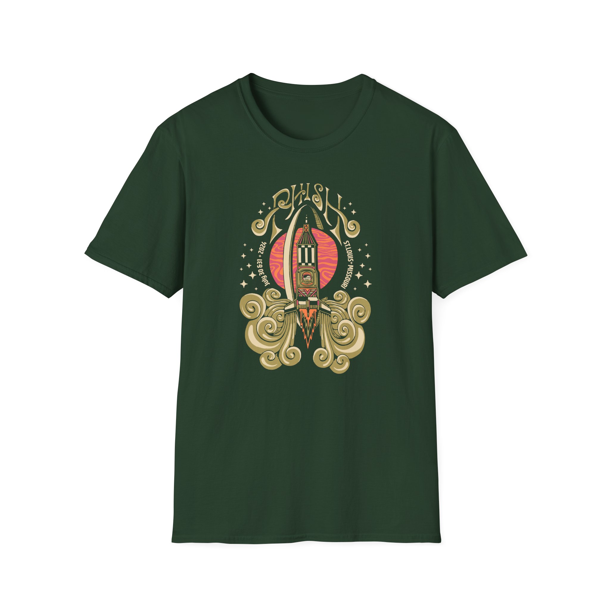 The Phish St Louis Event unisex soft-style t-shirt puts a new spin on casual comfort. Made from very soft materials, this tee is 100% cotton for solid colors. Heather colors and sports grey include polyester. The shoulders have twill tape for improved durability. There are no side seams. The collar is made with ribbed knitting to prevent curling damage.