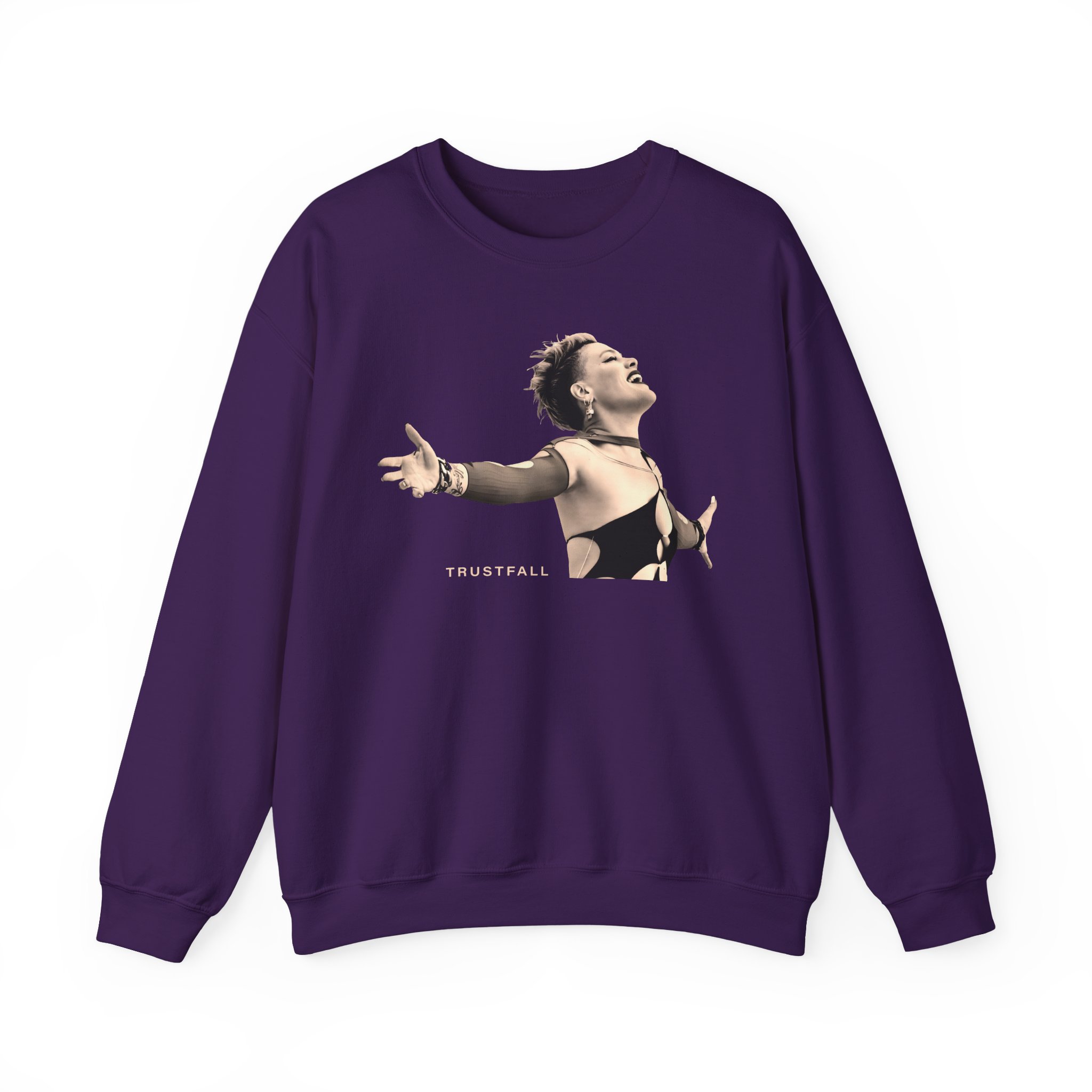Ideal for any situation, a Pink Trustfall Praise unisex heavy blend crewneck sweatshirt is pure comfort. These garments are made from polyester and cotton. This combination helps designs come out looking fresh and beautiful. The collar is ribbed knit, so it retains its shape even after washing. There are no itchy side seams on these sweaters.
