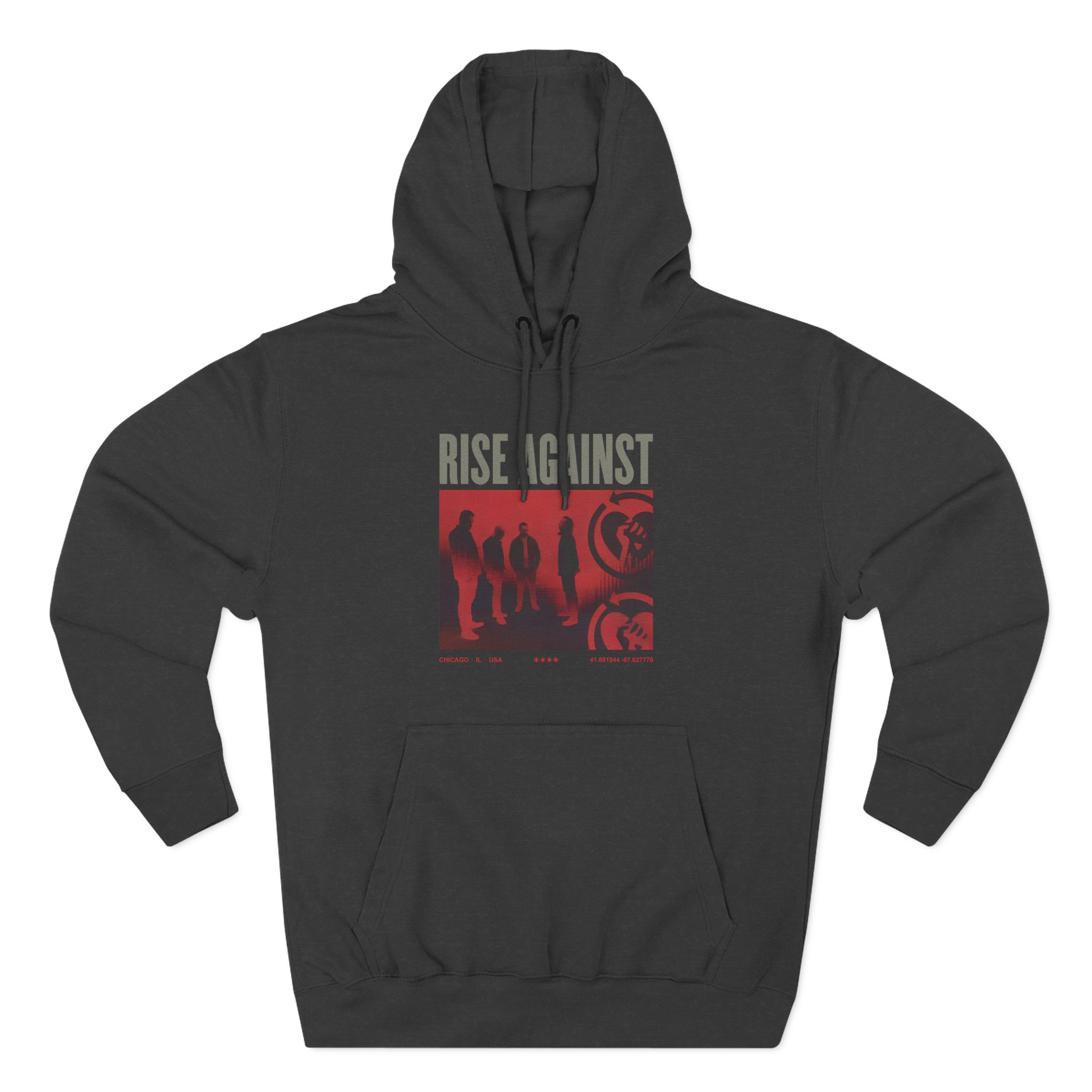 Beat the cold with this Rise Against Group Photo premium pullover hoodie that’s just the right layer of warm and cozy. Made with three-panel fleece lining, this pullover is double stitched for durability and roomy. Pick one in your favorite color to match your style.