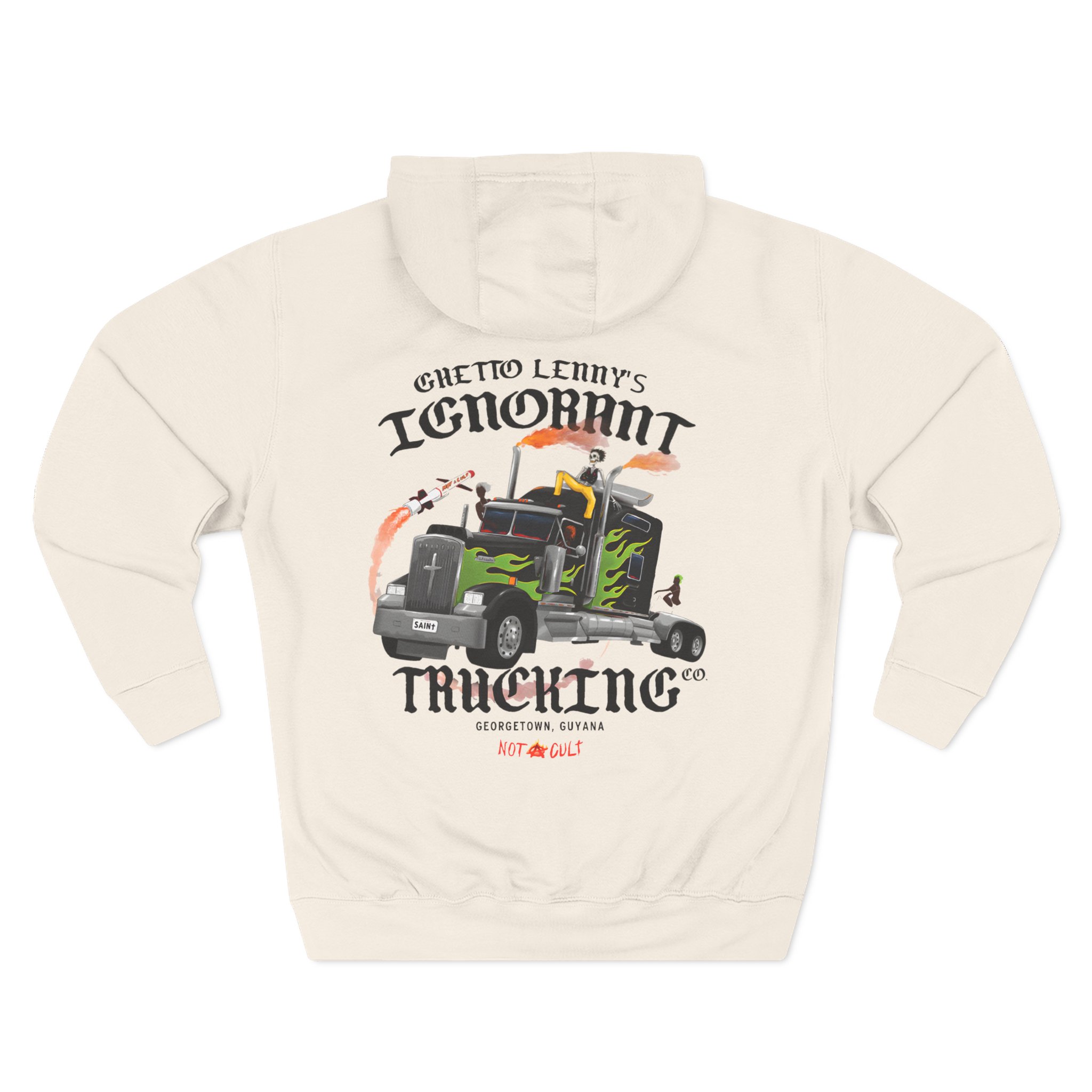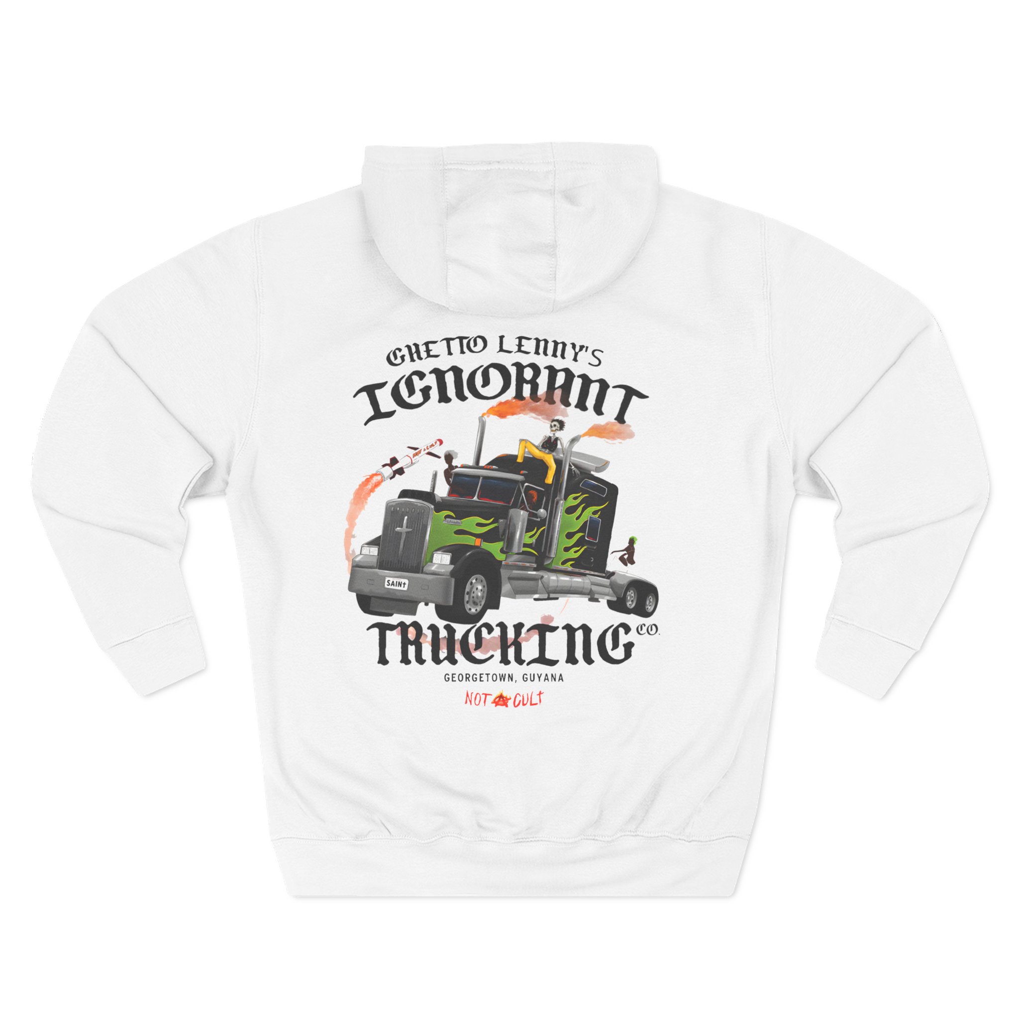 Beat the cold with this Saint Jhn Ghetto Lenny’s Trucking Co. premium pullover hoodie that’s just the right layer of warm and cozy. Made with three-panel fleece lining, this pullover is double stitched for durability and roomy. Pick one in your favorite color to match your style.