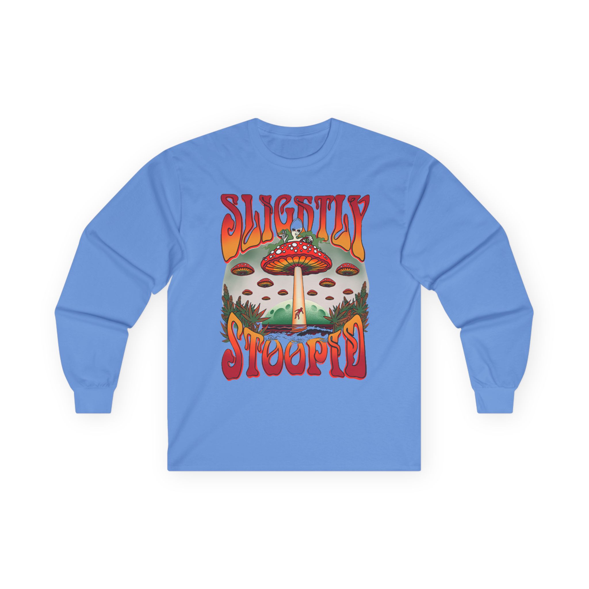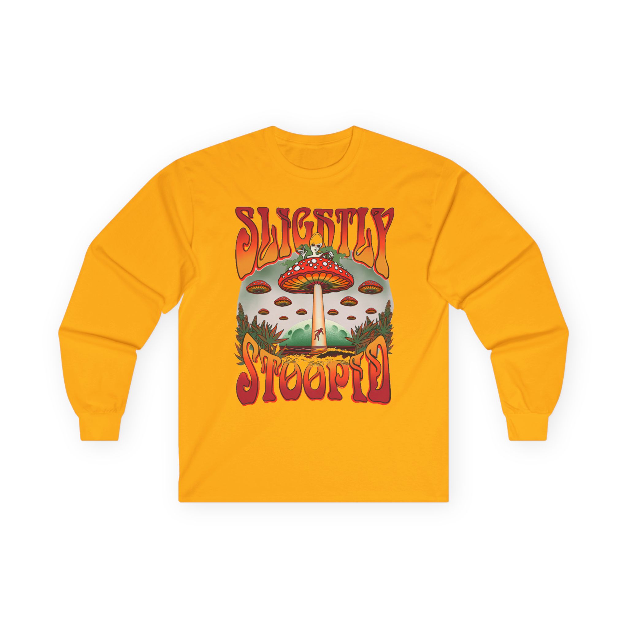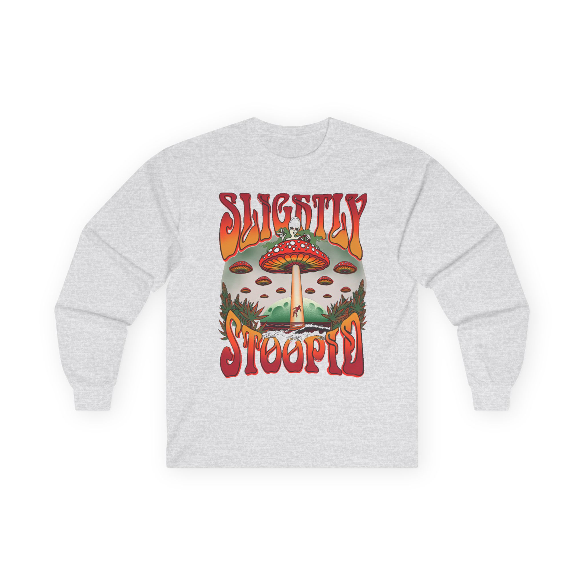 A bit more formal than a standard-issue t-shirt, the Slightly Stoopid Mushroom Ufo ultra cotton long sleeve tee is a clear comfort winner. The sleeves also act as a nice frame. There are no side seams. The shoulders are taped for improved durability. This makes for a good fitting around the shoulders and neck. The cotton used for these shirts is environmentally friendly.
