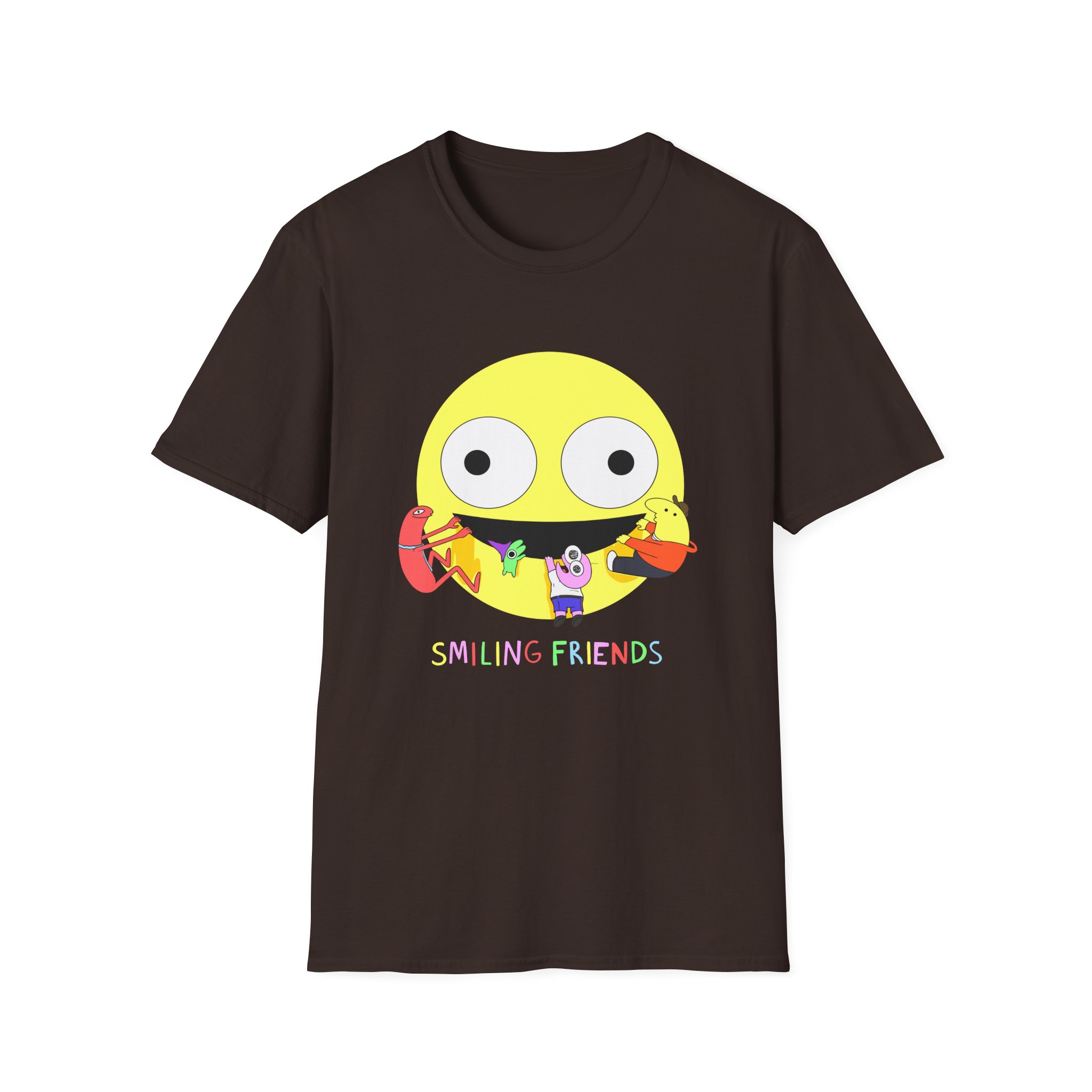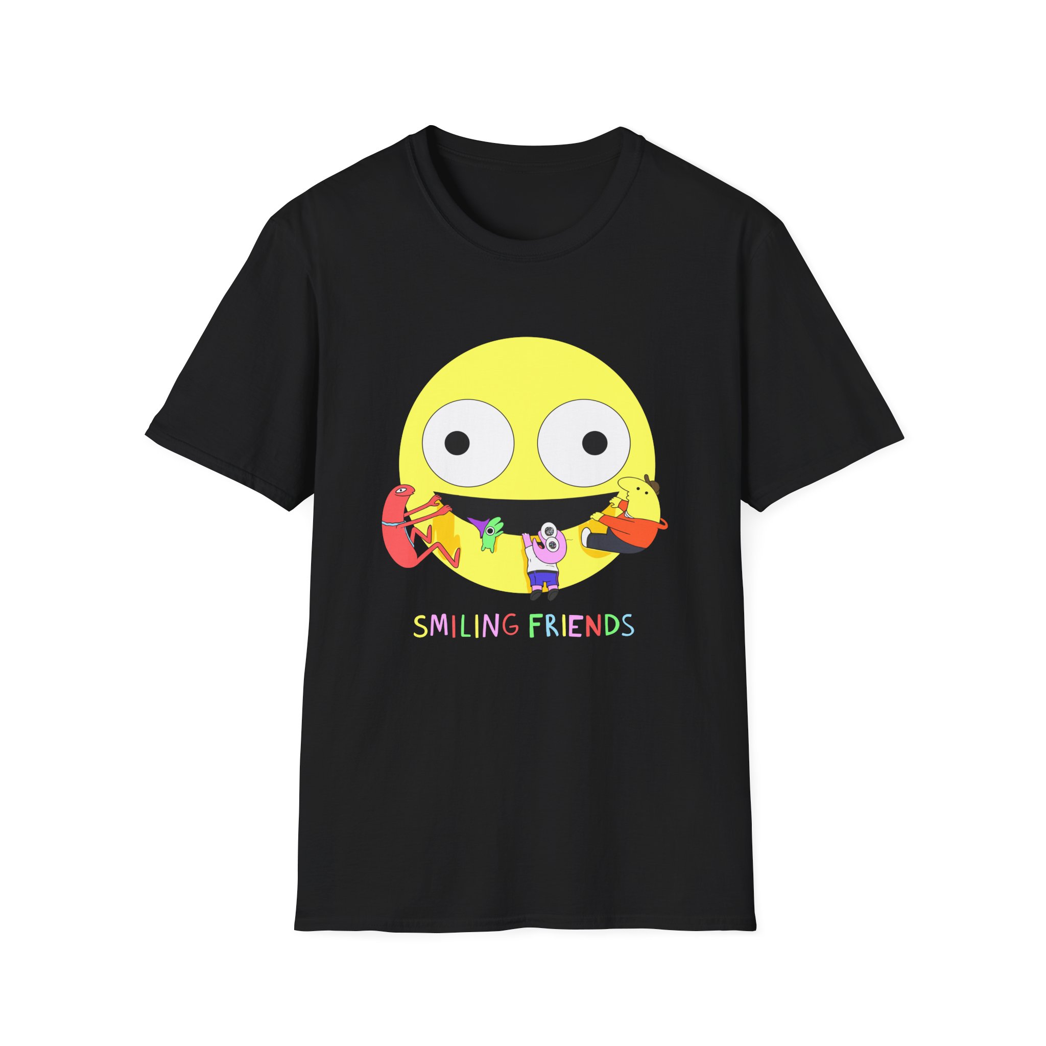 The Smiling Friends unisex soft-style t-shirt puts a new spin on casual comfort. Made from very soft materials, this tee is 100% cotton for solid colors. Heather colors and sports grey include polyester. The shoulders have twill tape for improved durability. There are no side seams. The collar is made with ribbed knitting to prevent curling damage.