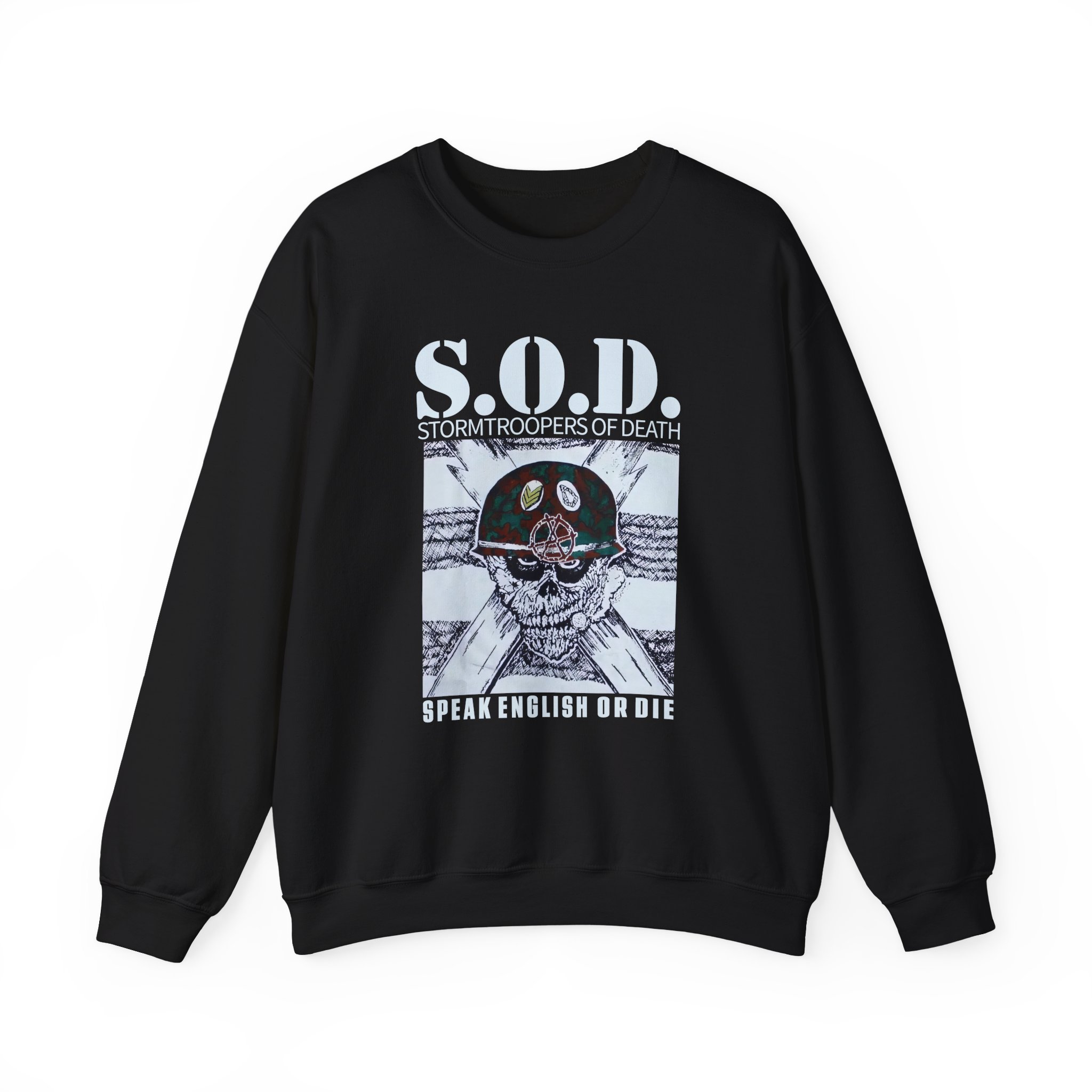 Ideal for any situation, a Stormtroopers of Death S.o.d. Band unisex heavy blend crewneck sweatshirt is pure comfort. These garments are made from polyester and cotton. This combination helps designs come out looking fresh and beautiful. The collar is ribbed knit, so it retains its shape even after washing. There are no itchy side seams on these sweaters.