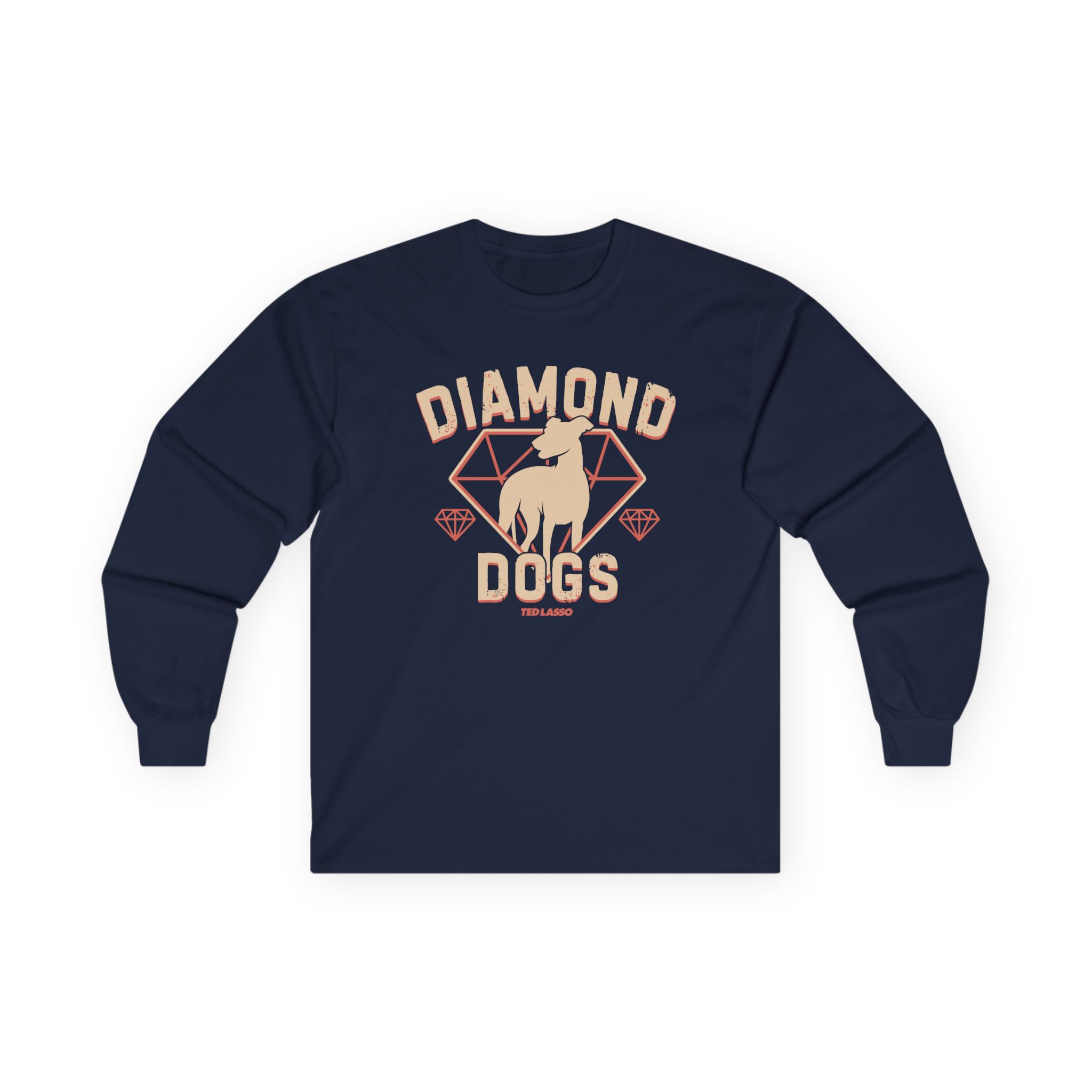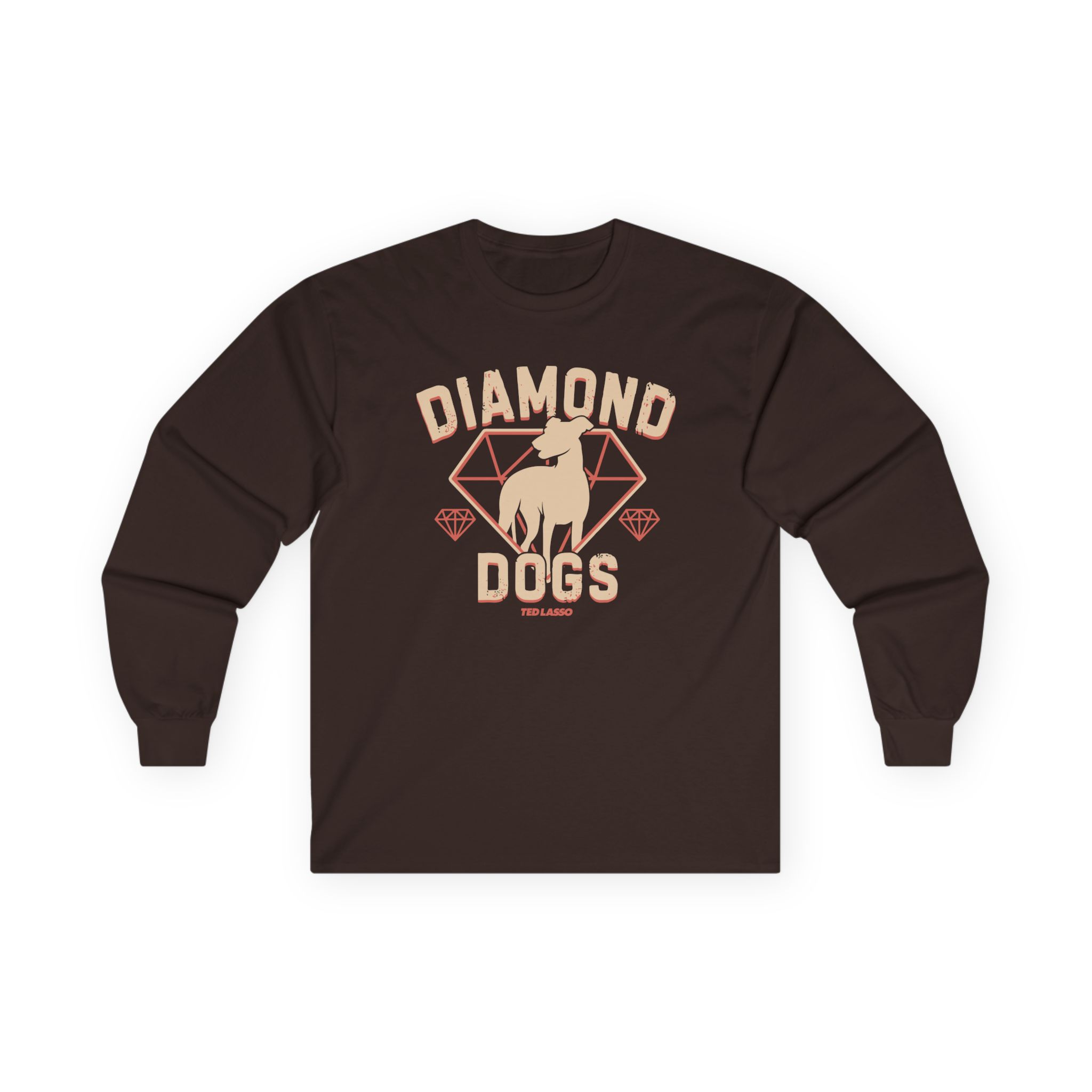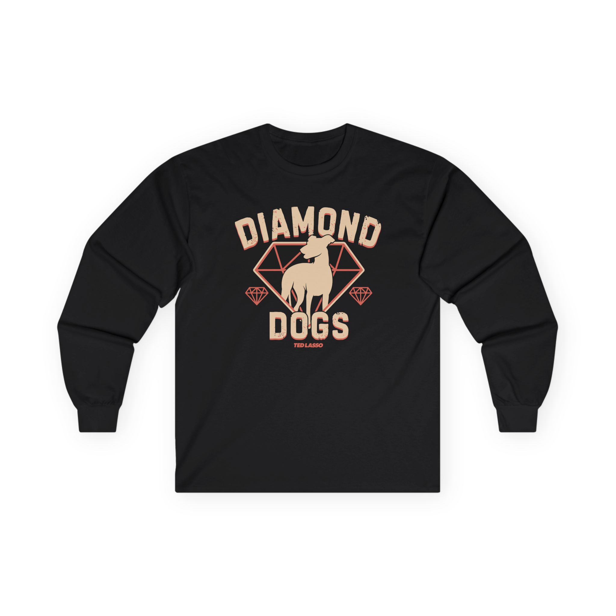 A bit more formal than a standard-issue t-shirt, the Ted Lasso Diamond Dogs ultra cotton long sleeve tee is a clear comfort winner. The sleeves also act as a nice frame. There are no side seams. The shoulders are taped for improved durability. This makes for a good fitting around the shoulders and neck. The cotton used for these shirts is environmentally friendly.