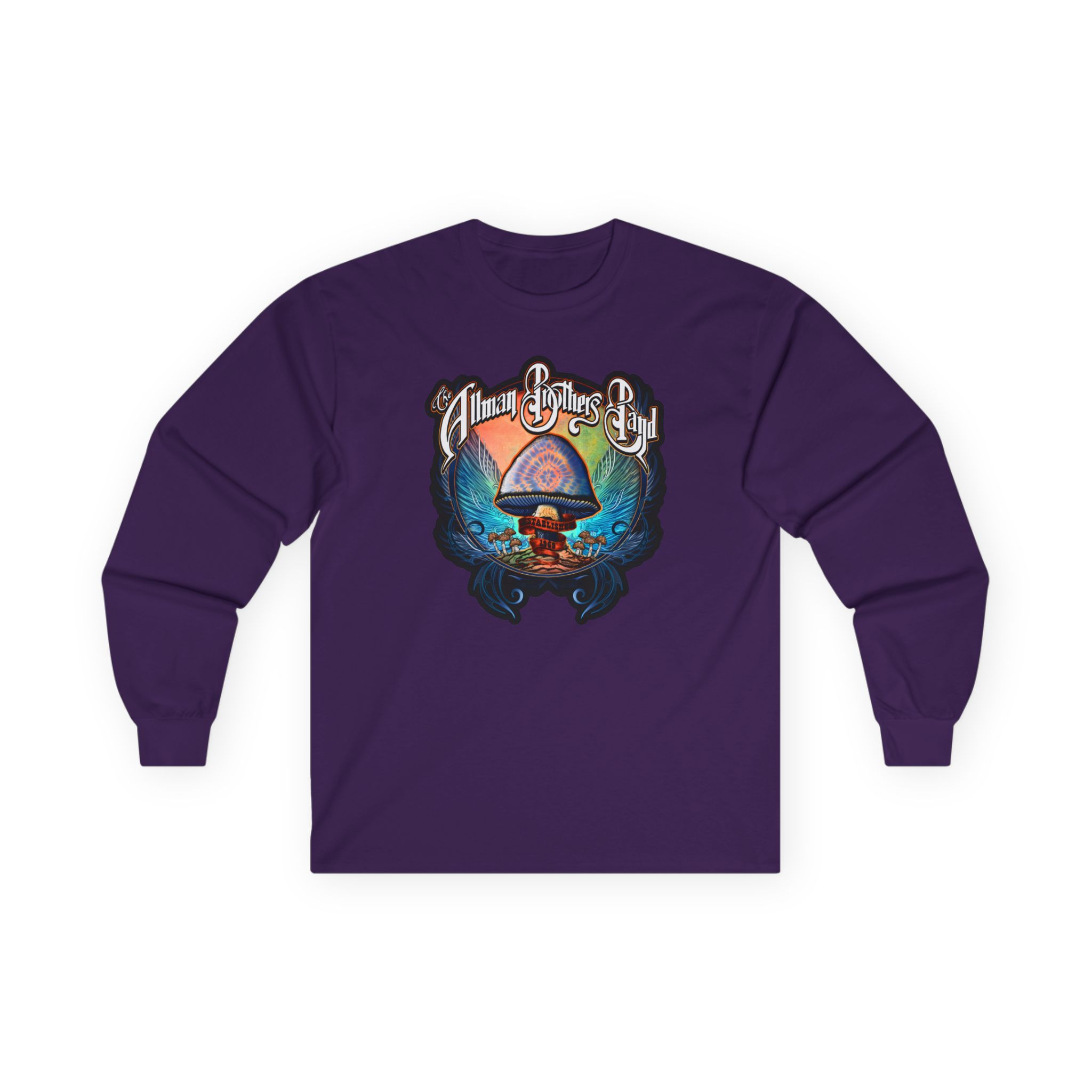 A bit more formal than a standard-issue t-shirt, the The Allman Brothers Psychedelic Mushroom ultra cotton long sleeve tee is a clear comfort winner. The sleeves also act as a nice frame. There are no side seams. The shoulders are taped for improved durability. This makes for a good fitting around the shoulders and neck. The cotton used for these shirts is environmentally friendly.