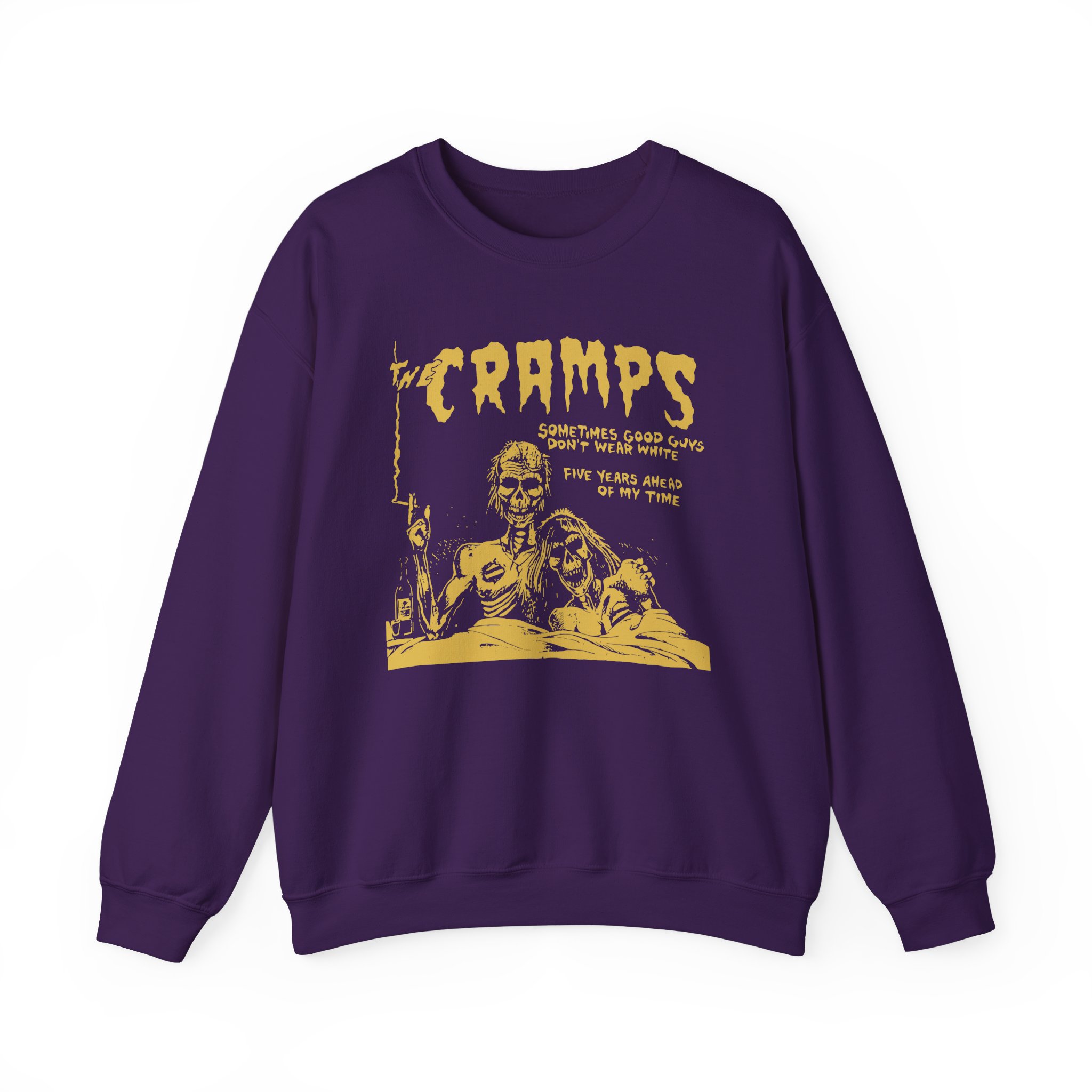 Ideal for any situation, a The Cramps Sometimes Good Guys Don’t Wear White unisex heavy blend crewneck sweatshirt is pure comfort. These garments are made from polyester and cotton. This combination helps designs come out looking fresh and beautiful. The collar is ribbed knit, so it retains its shape even after washing. There are no itchy side seams on these sweaters.