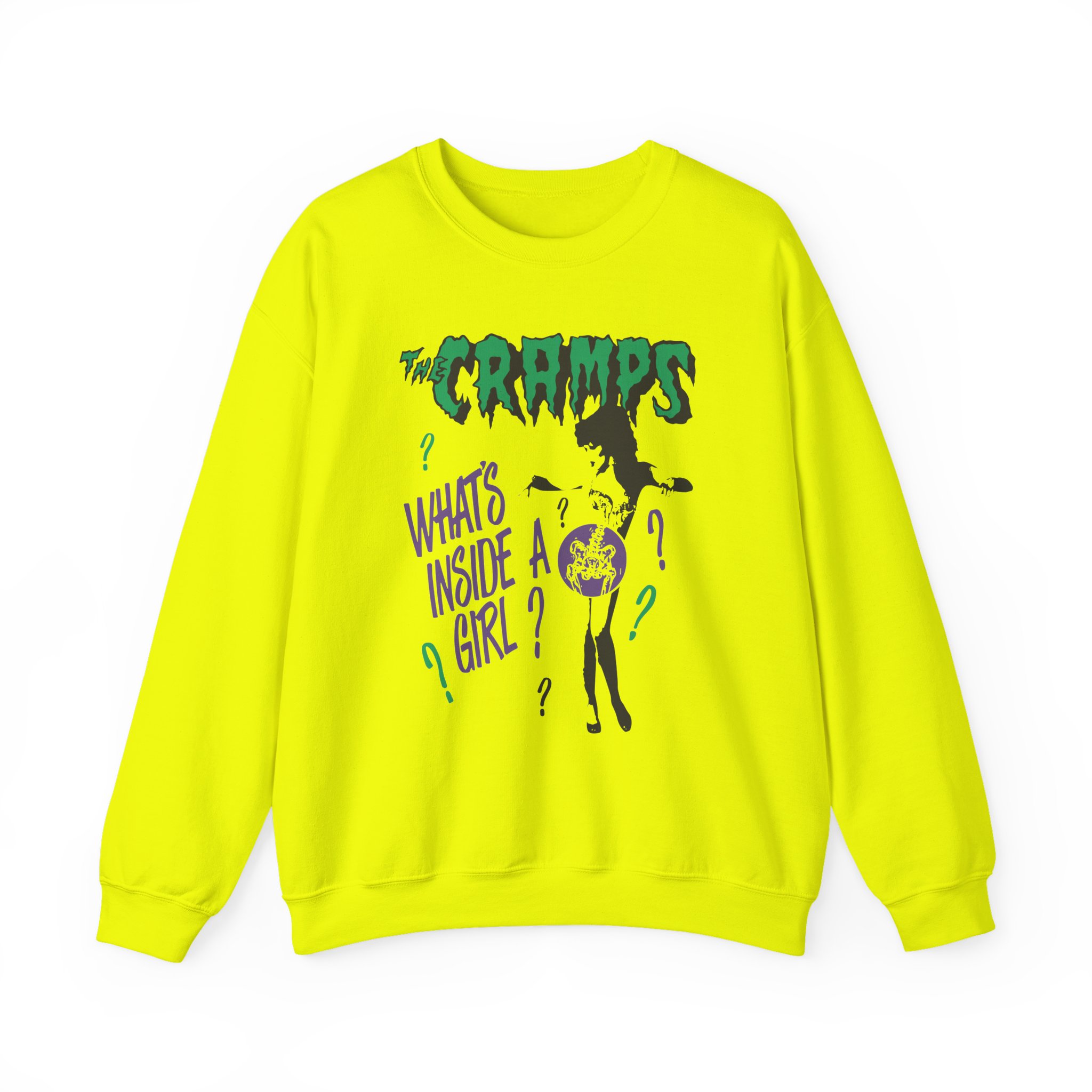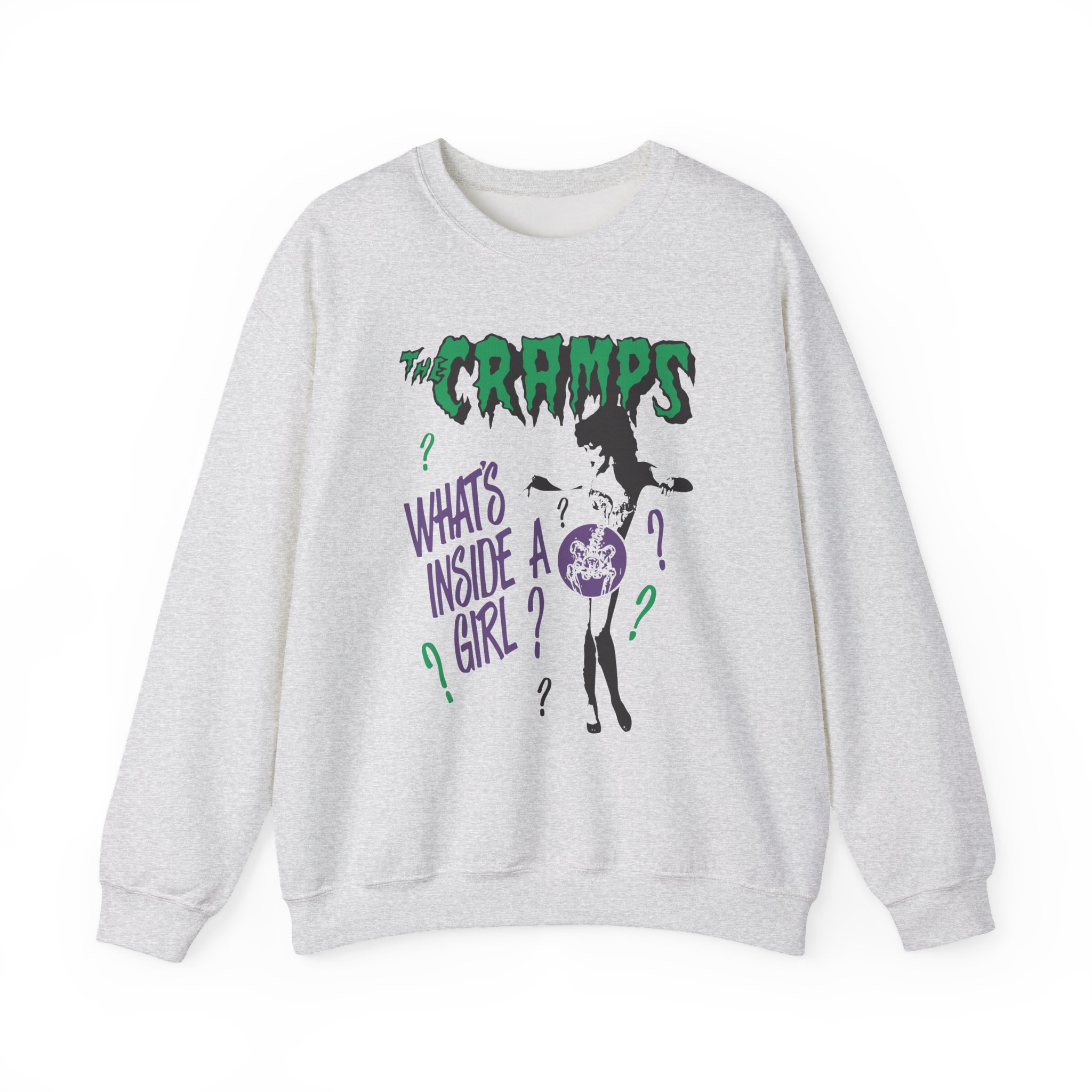 Ideal for any situation, a The Cramps What’s Inside a Girl unisex heavy blend crewneck sweatshirt is pure comfort. These garments are made from polyester and cotton. This combination helps designs come out looking fresh and beautiful. The collar is ribbed knit, so it retains its shape even after washing. There are no itchy side seams on these sweaters.