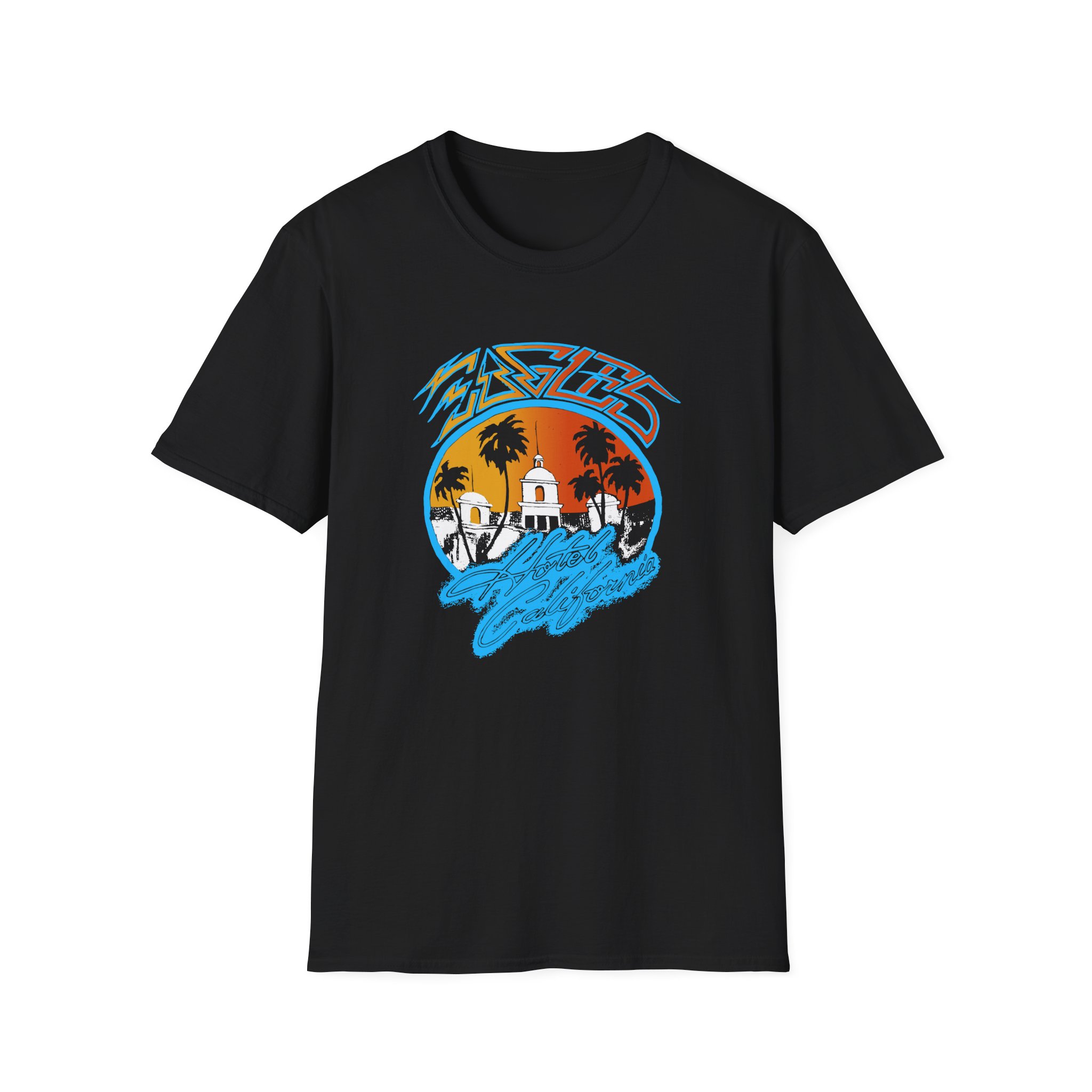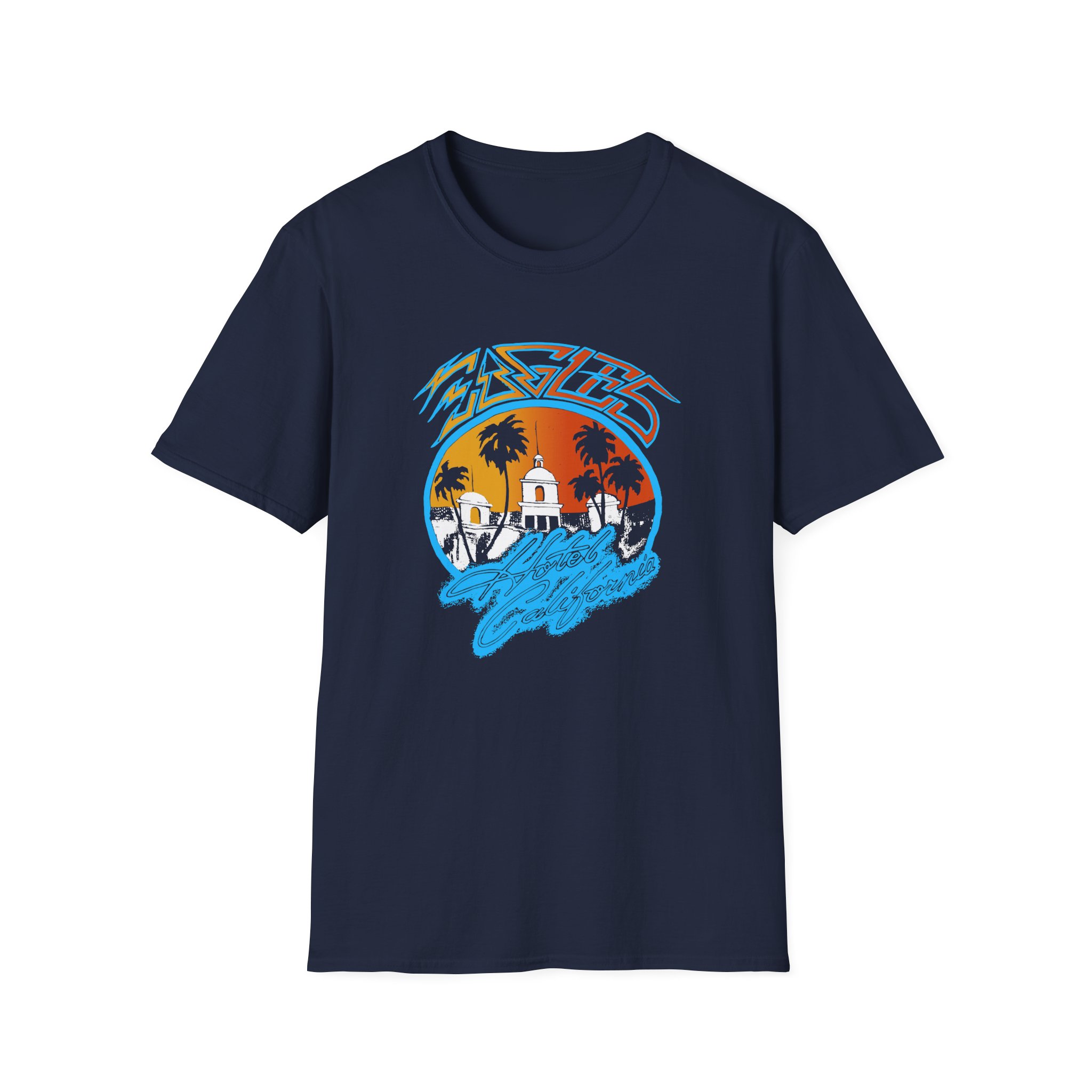 The Eagles Hotel California unisex soft-style t-shirt puts a new spin on casual comfort. Made from very soft materials, this tee is 100% cotton for solid colors. Heather colors and sports grey include polyester. The shoulders have twill tape for improved durability. There are no side seams. The collar is made with ribbed knitting to prevent curling damage.