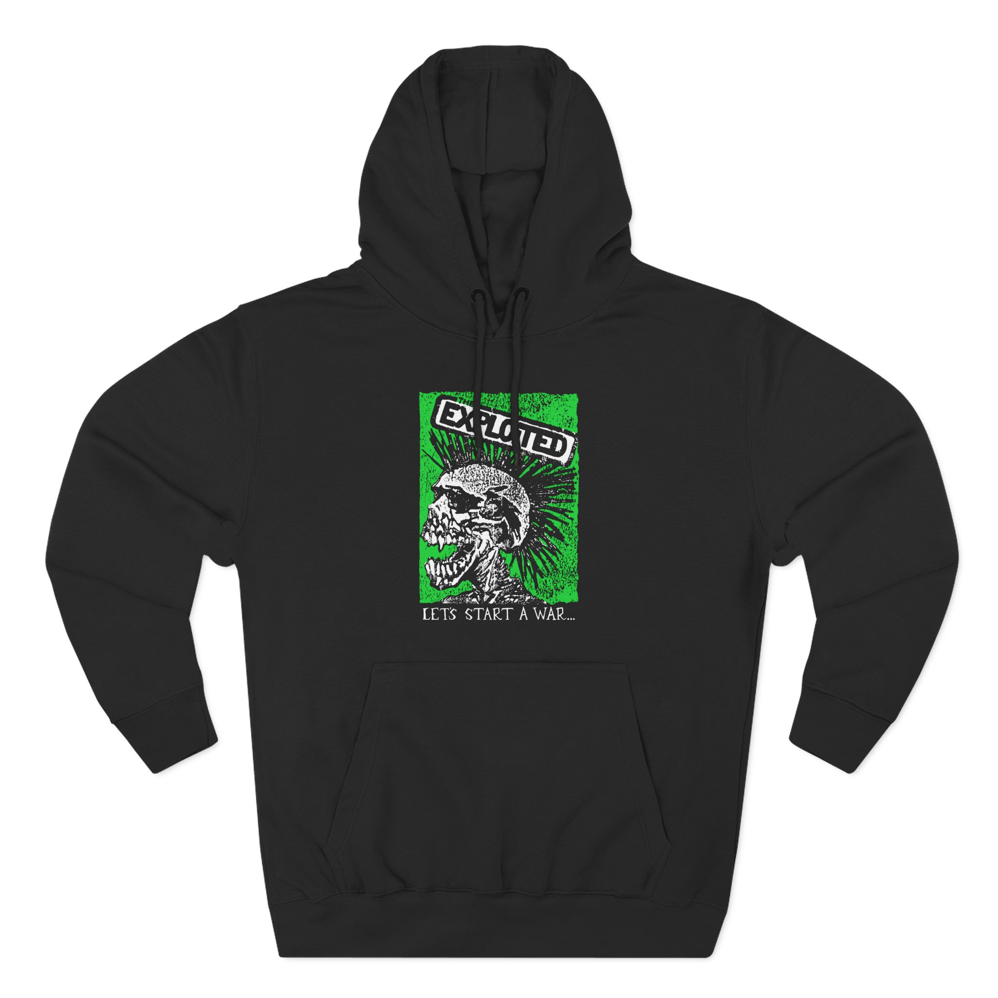 Beat the cold with The Exploited Let’s Start a War Skull premium pullover hoodie that’s just the right layer of warm and cozy. Made with three-panel fleece lining, this pullover is double stitched for durability and roomy. Pick one in your favorite color to match your style.