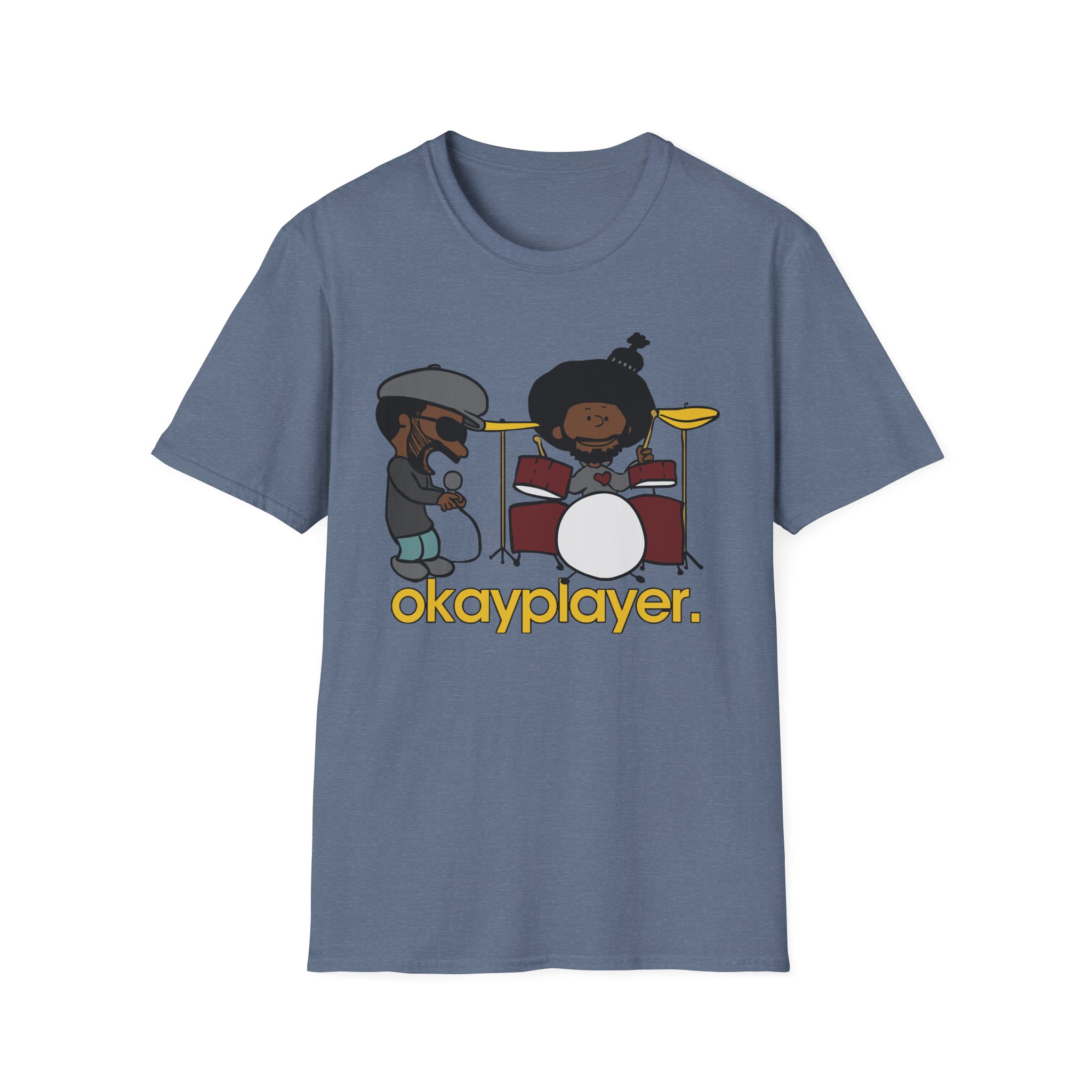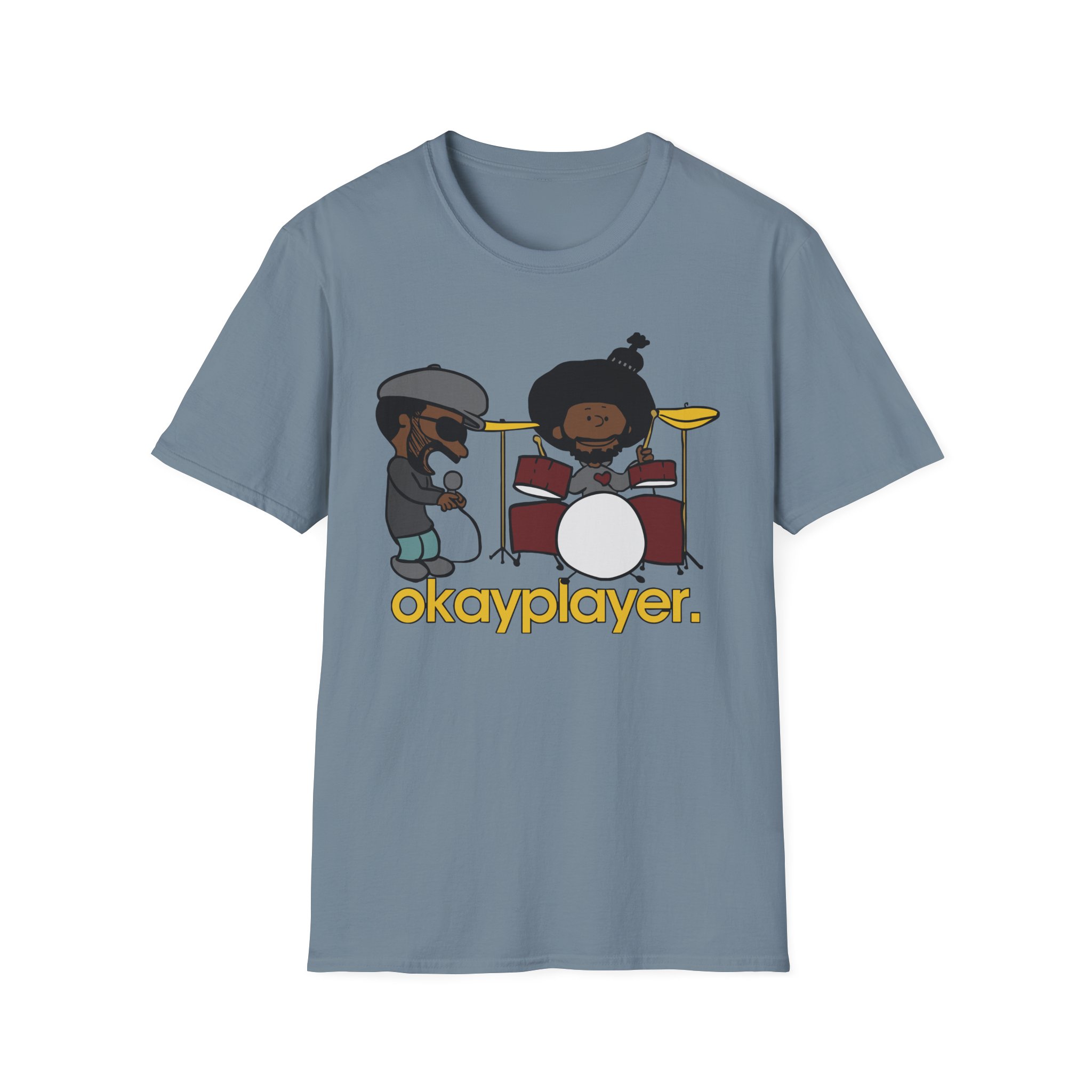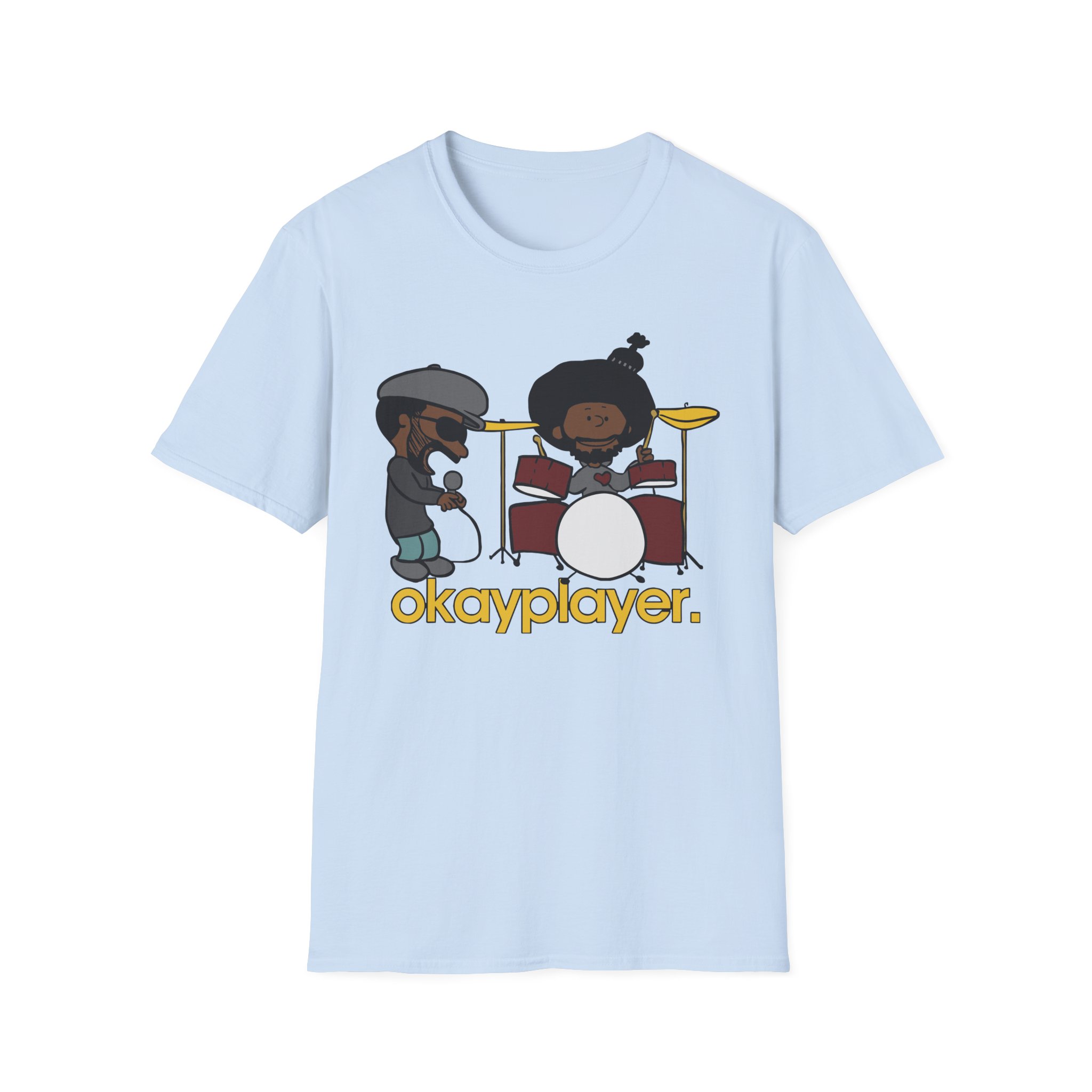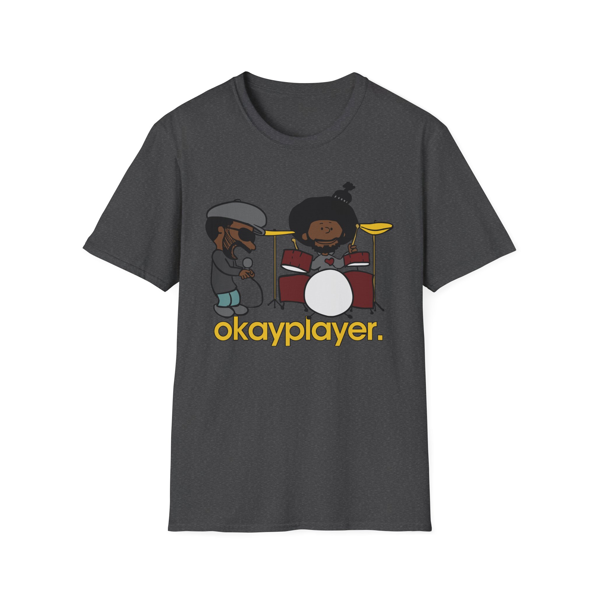 The Roots Black Thought & Questlove Okayplayer unisex soft-style t-shirt puts a new spin on casual comfort. Made from very soft materials, this tee is 100% cotton for solid colors. Heather colors and sports grey include polyester. The shoulders have twill tape for improved durability. There are no side seams. The collar is made with ribbed knitting to prevent curling damage.