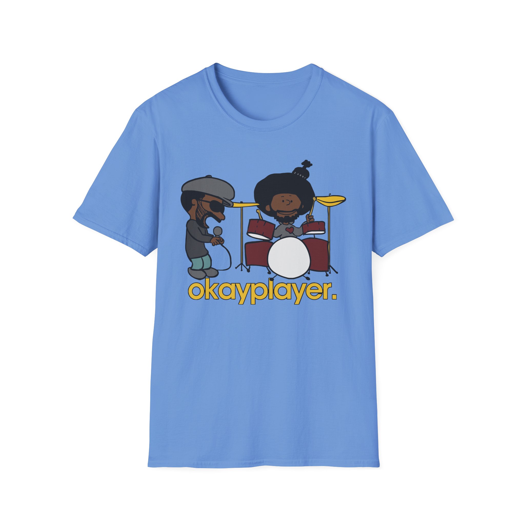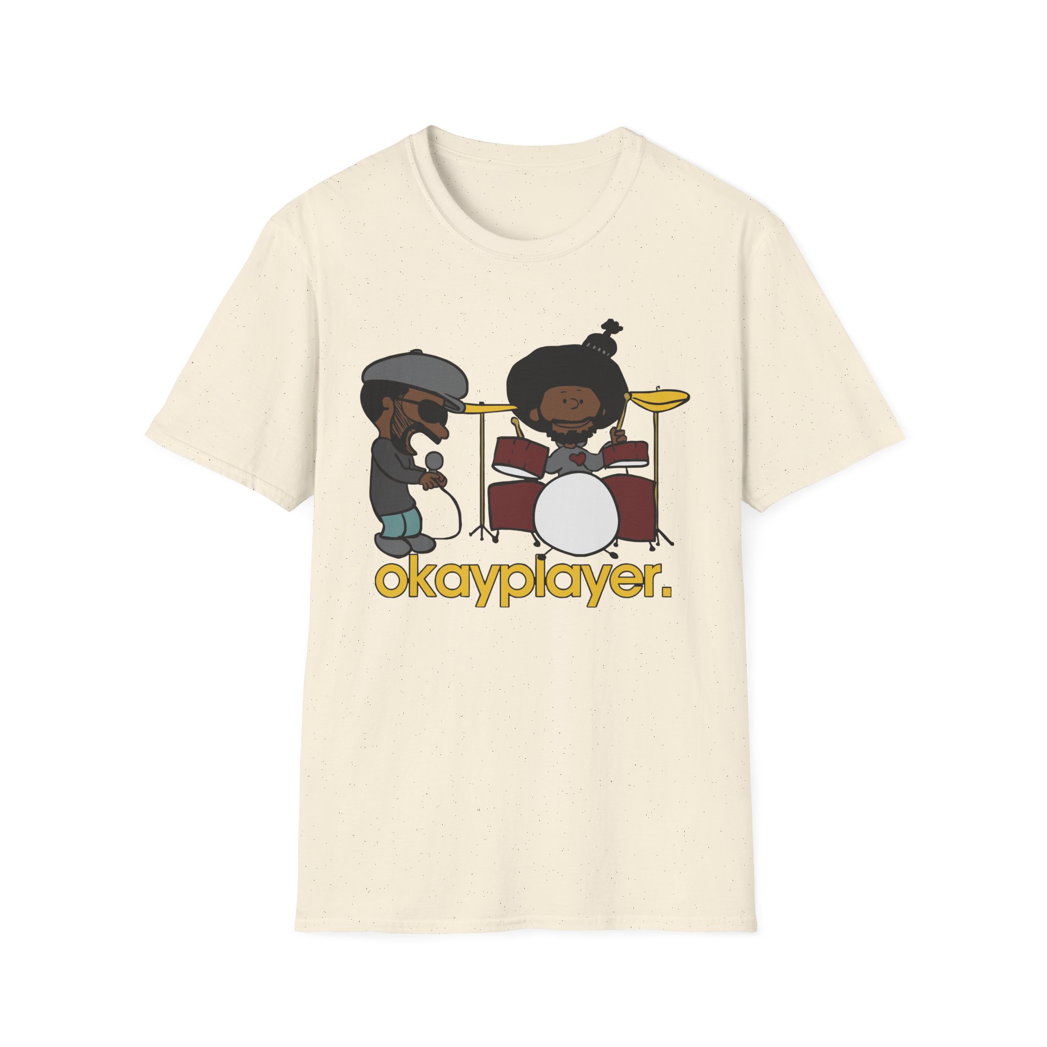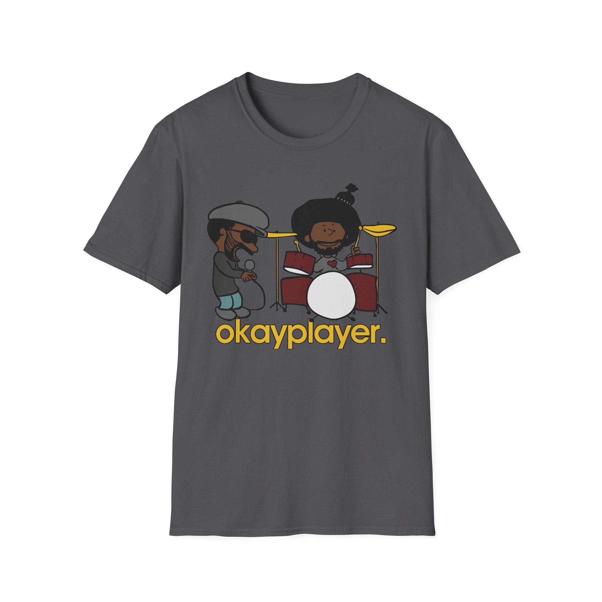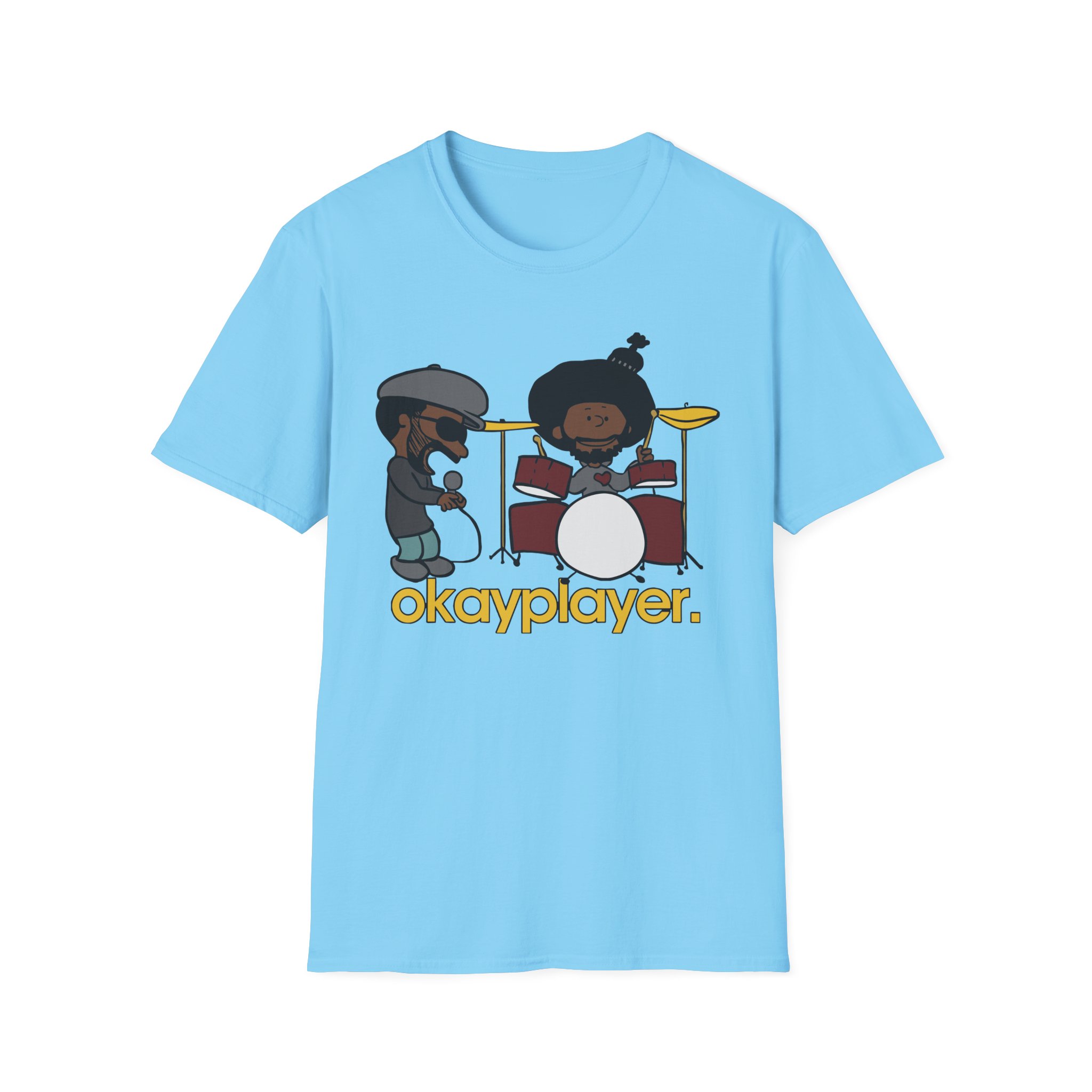 The Roots Black Thought & Questlove Okayplayer unisex soft-style t-shirt puts a new spin on casual comfort. Made from very soft materials, this tee is 100% cotton for solid colors. Heather colors and sports grey include polyester. The shoulders have twill tape for improved durability. There are no side seams. The collar is made with ribbed knitting to prevent curling damage.