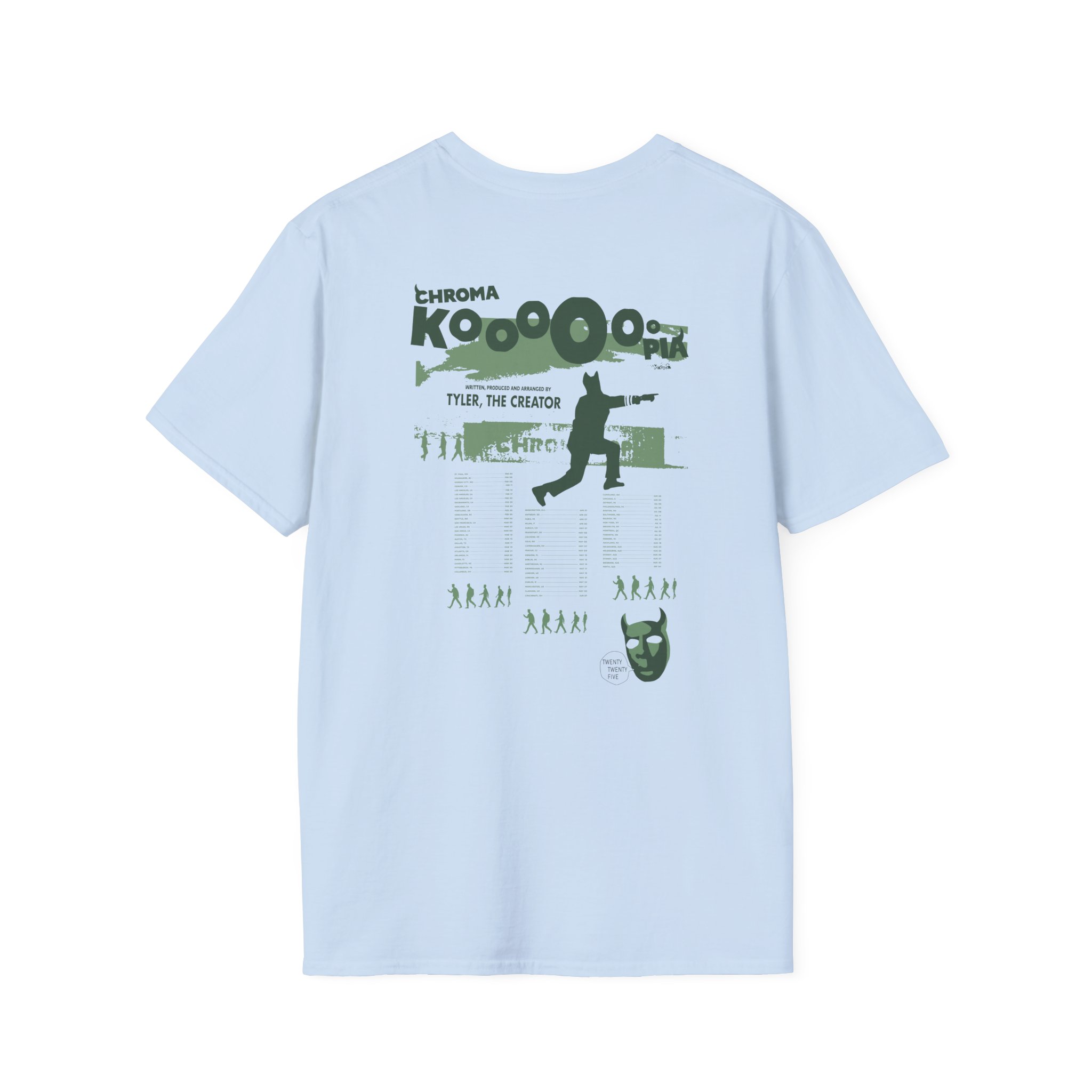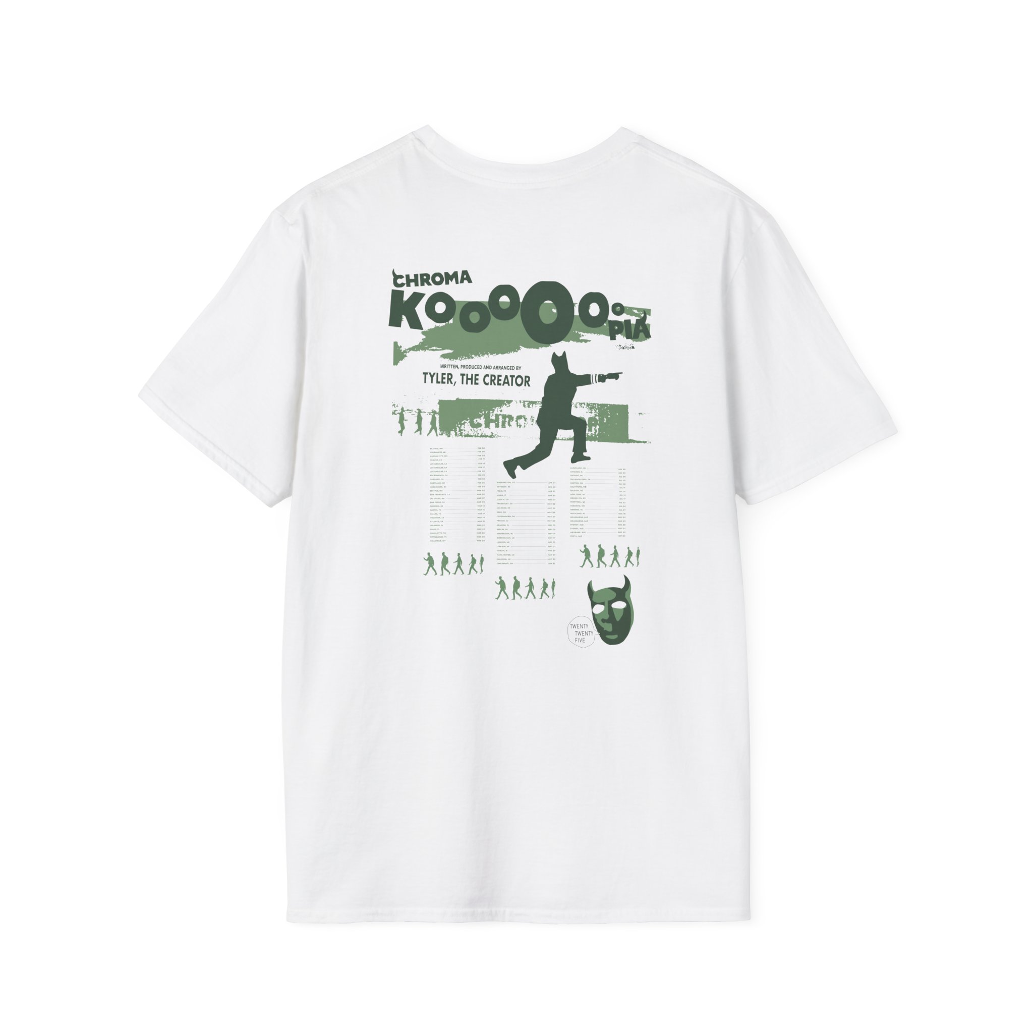 The Chromakopia Signature Tour Dates unisex soft-style t-shirt puts a new spin on casual comfort. Made from very soft materials, this tee is 100% cotton for solid colors. Heather colors and sports grey include polyester. The shoulders have twill tape for improved durability. There are no side seams. The collar is made with ribbed knitting to prevent curling damage.