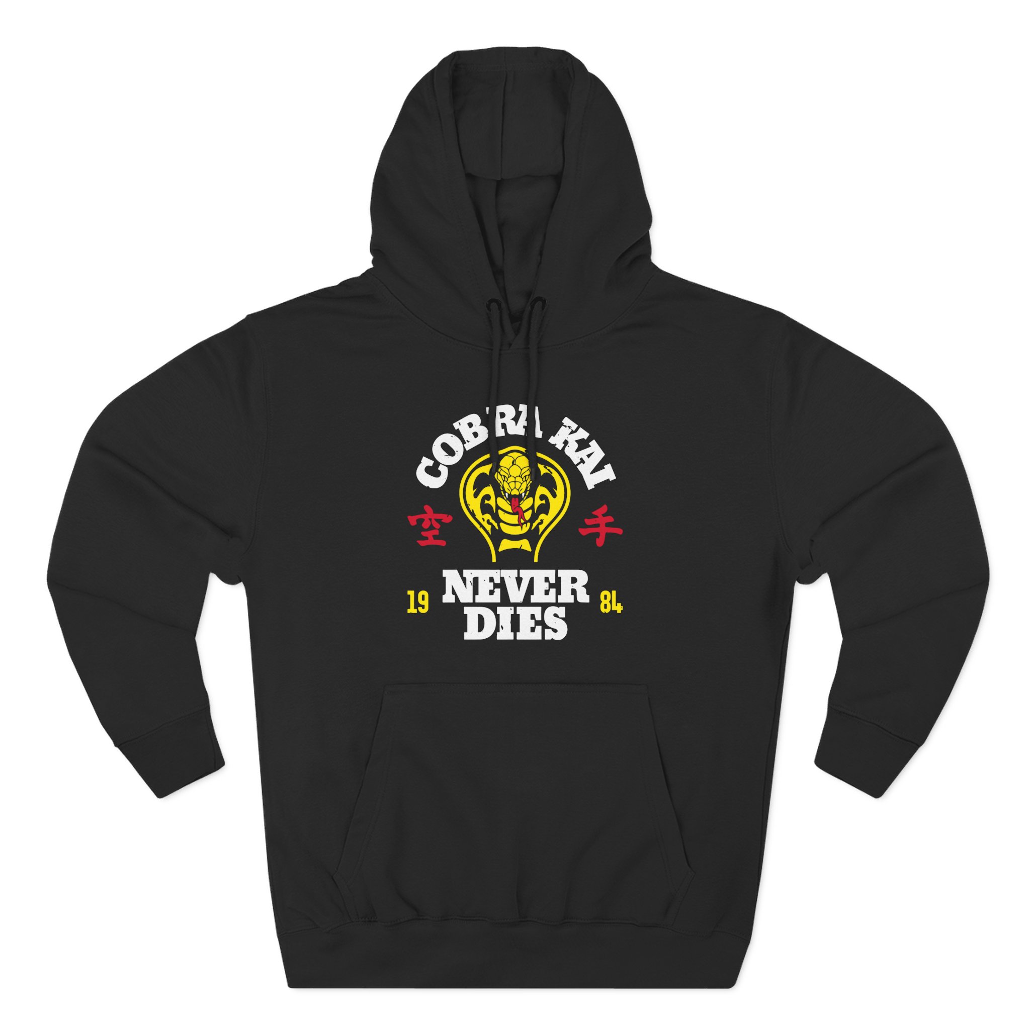Beat the cold with this Cobra Kai Never Dies premium pullover hoodie that’s just the right layer of warm and cozy. Made with three-panel fleece lining, this pullover is double stitched for durability and roomy. Pick one in your favorite color to match your style.