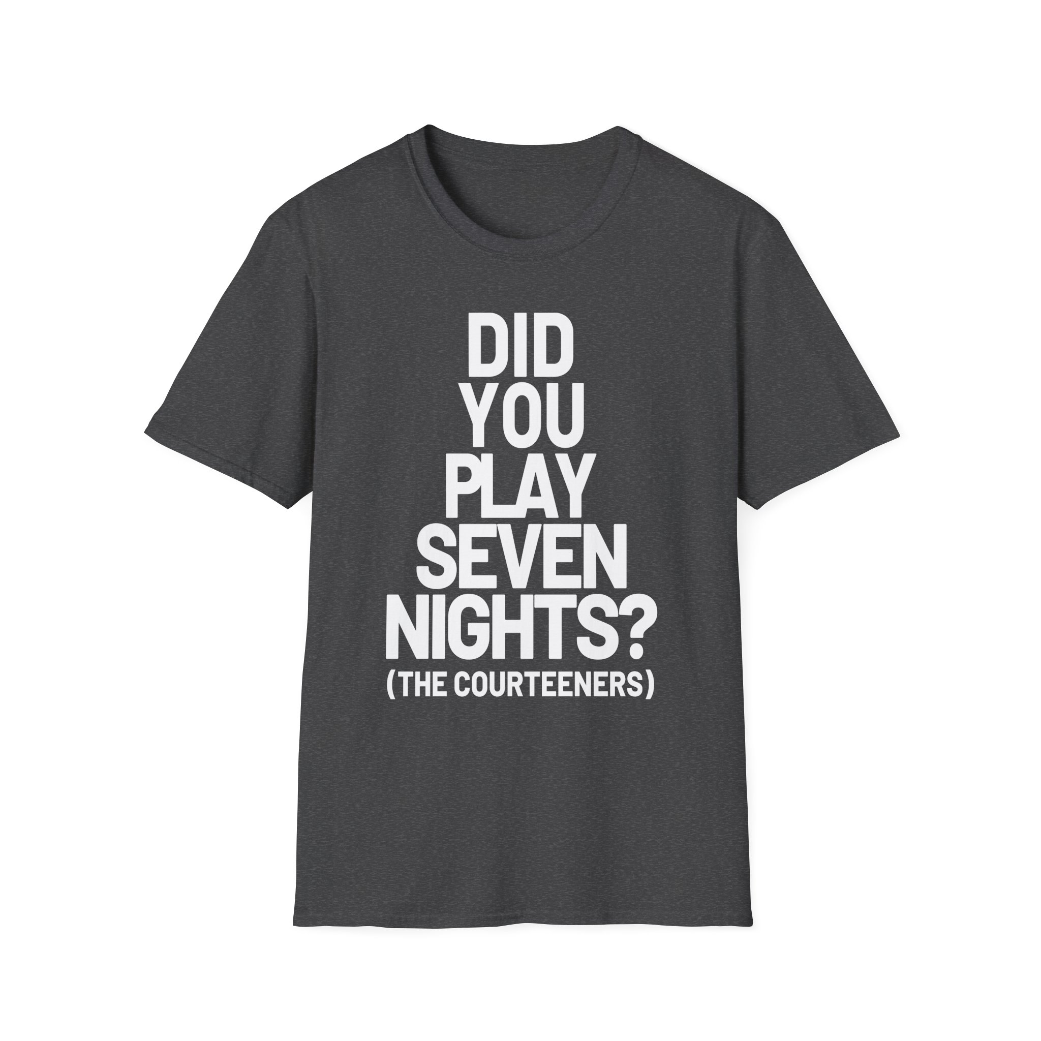 The Courteeners Did You Play Seven Nights unisex soft-style t-shirt puts a new spin on casual comfort. Made from very soft materials, this tee is 100% cotton for solid colors. Heather colors and sports grey include polyester. The shoulders have twill tape for improved durability. There are no side seams. The collar is made with ribbed knitting to prevent curling damage.