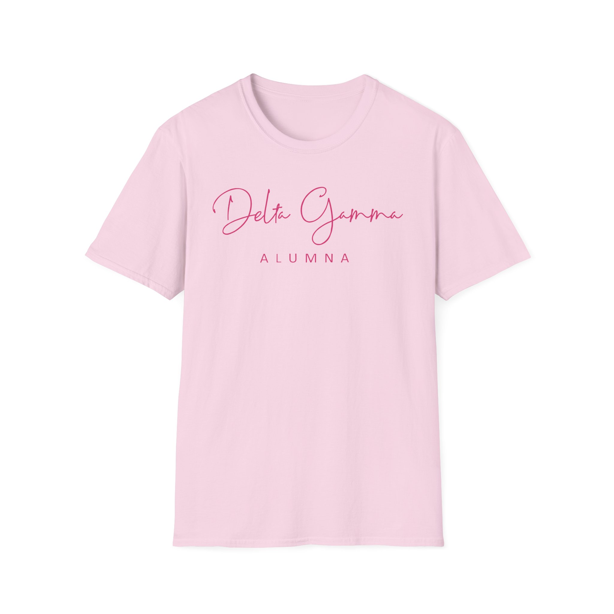 The Delta Gamma Alumna unisex soft-style t-shirt puts a new spin on casual comfort. Made from very soft materials, this tee is 100% cotton for solid colors. Heather colors and sports grey include polyester. The shoulders have twill tape for improved durability. There are no side seams. The collar is made with ribbed knitting to prevent curling damage.