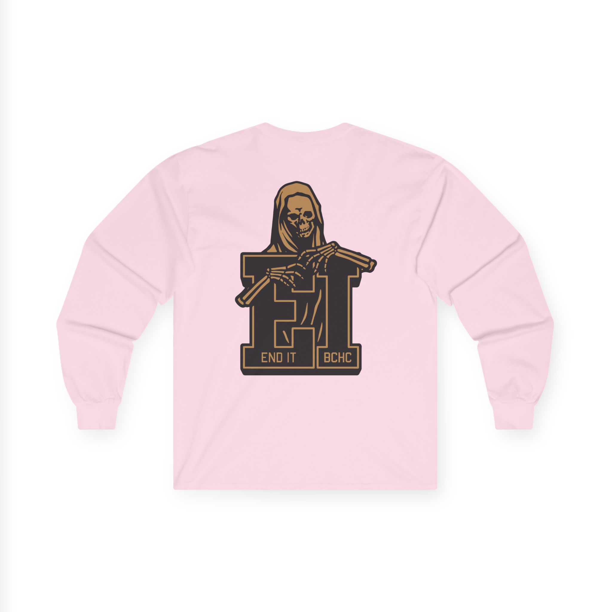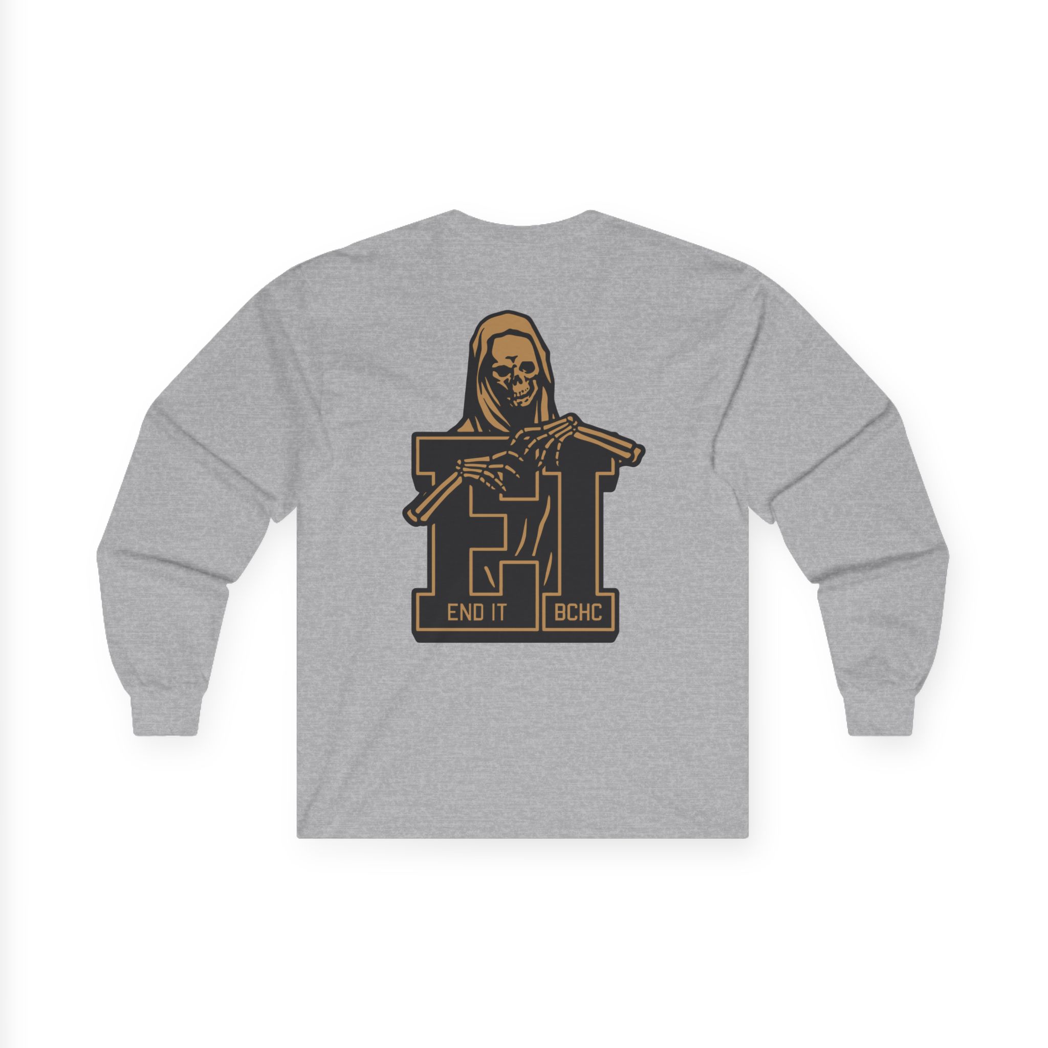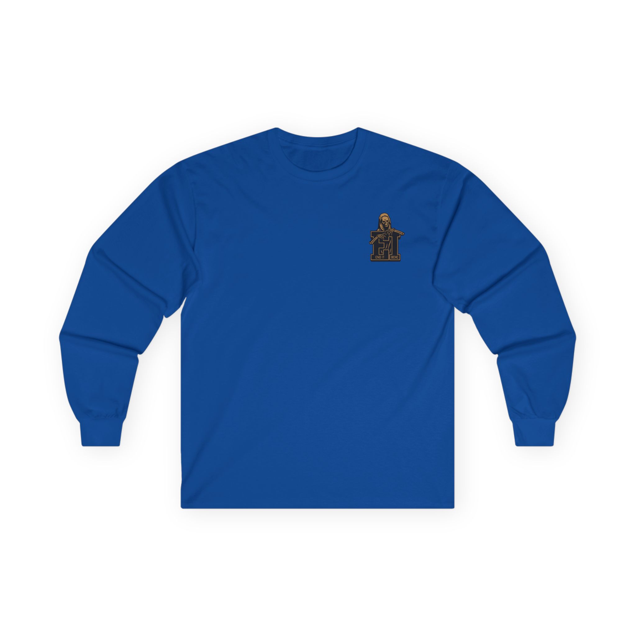 A bit more formal than a standard-issue t-shirt, the End It Bchc Reaper Emblem ultra cotton long sleeve tee is a clear comfort winner. The sleeves also act as a nice frame. There are no side seams. The shoulders are taped for improved durability. This makes for a good fitting around the shoulders and neck. The cotton used for these shirts is environmentally friendly.