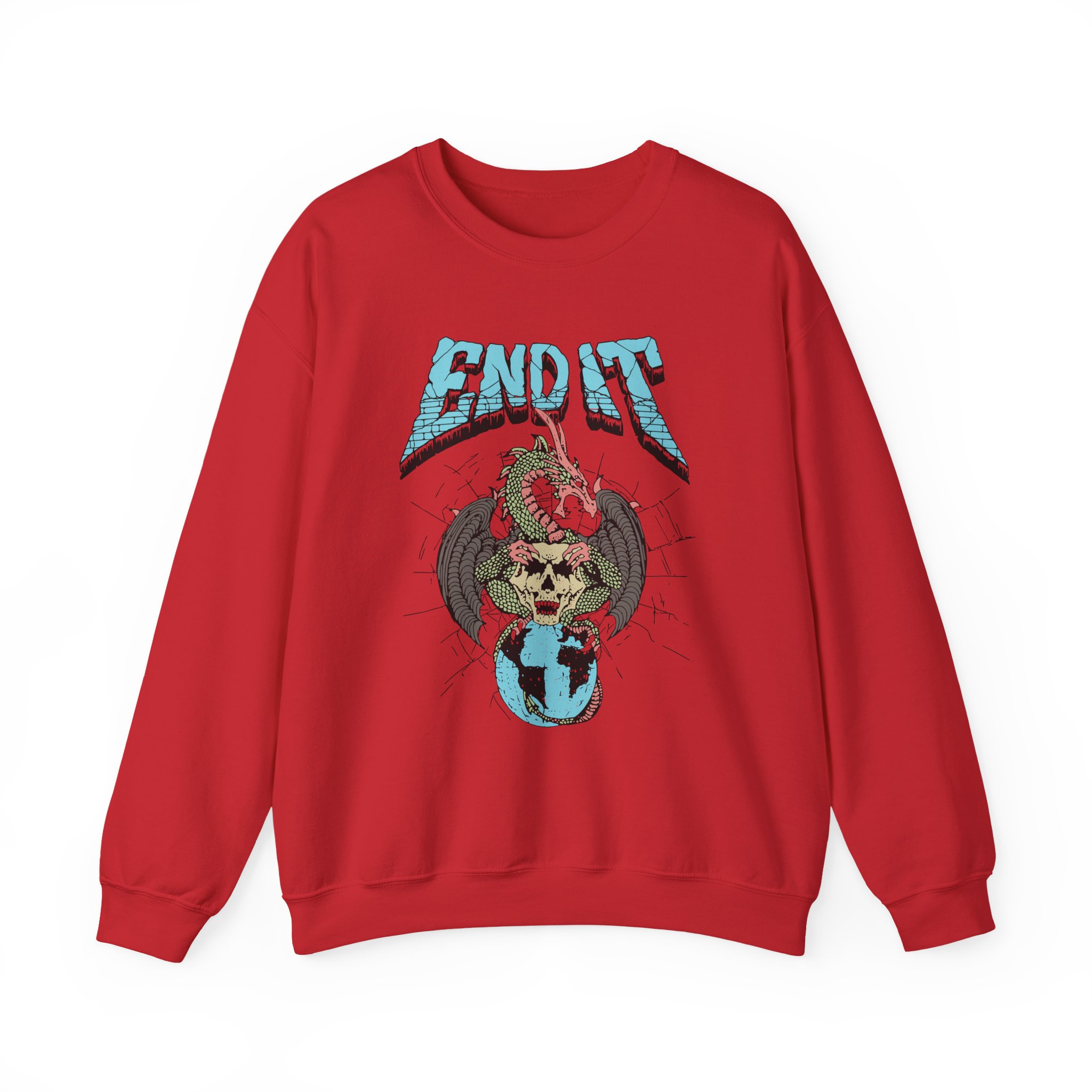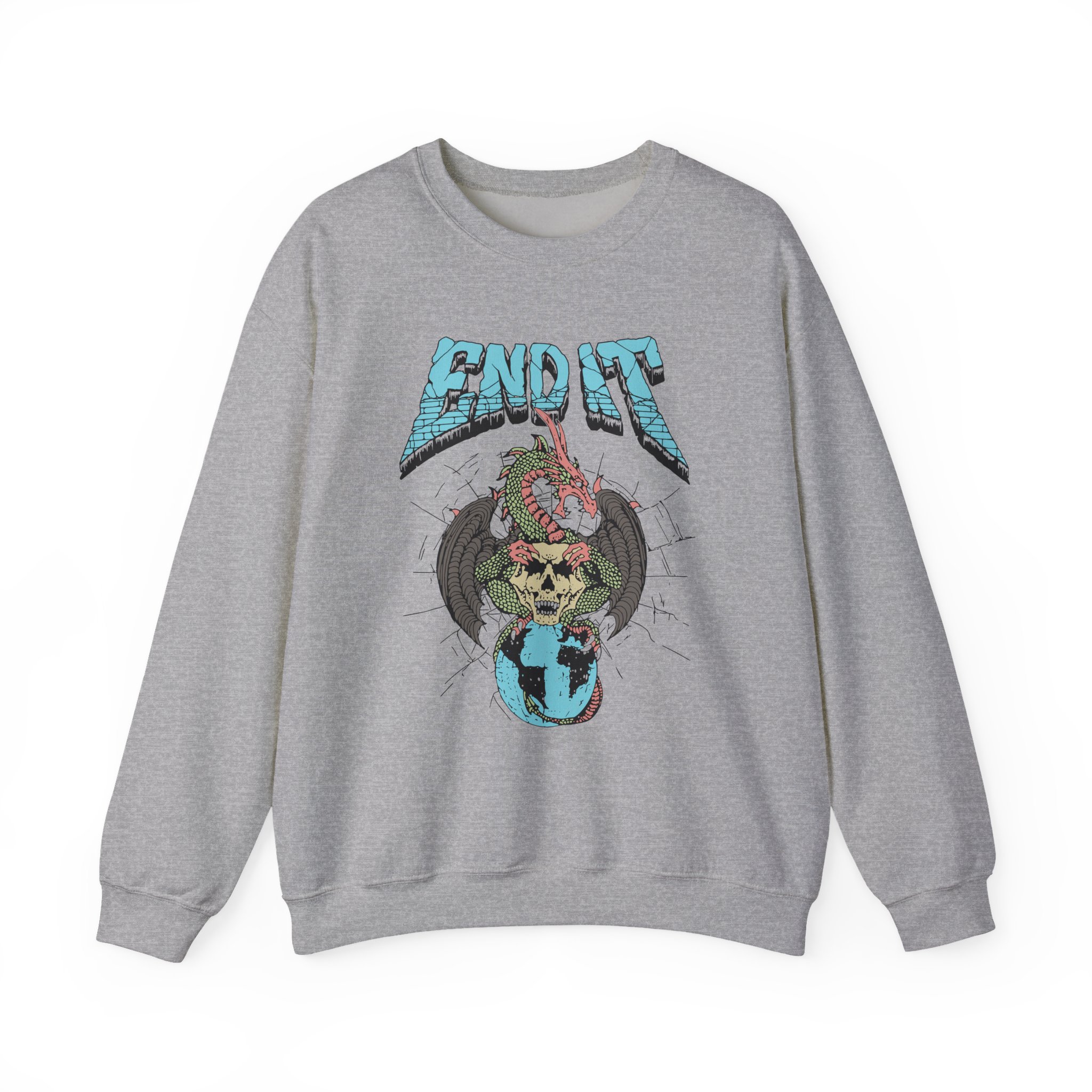Ideal for any situation, a End It Dragon Skull unisex heavy blend crewneck sweatshirt is pure comfort. These garments are made from polyester and cotton. This combination helps designs come out looking fresh and beautiful. The collar is ribbed knit, so it retains its shape even after washing. There are no itchy side seams on these sweaters.