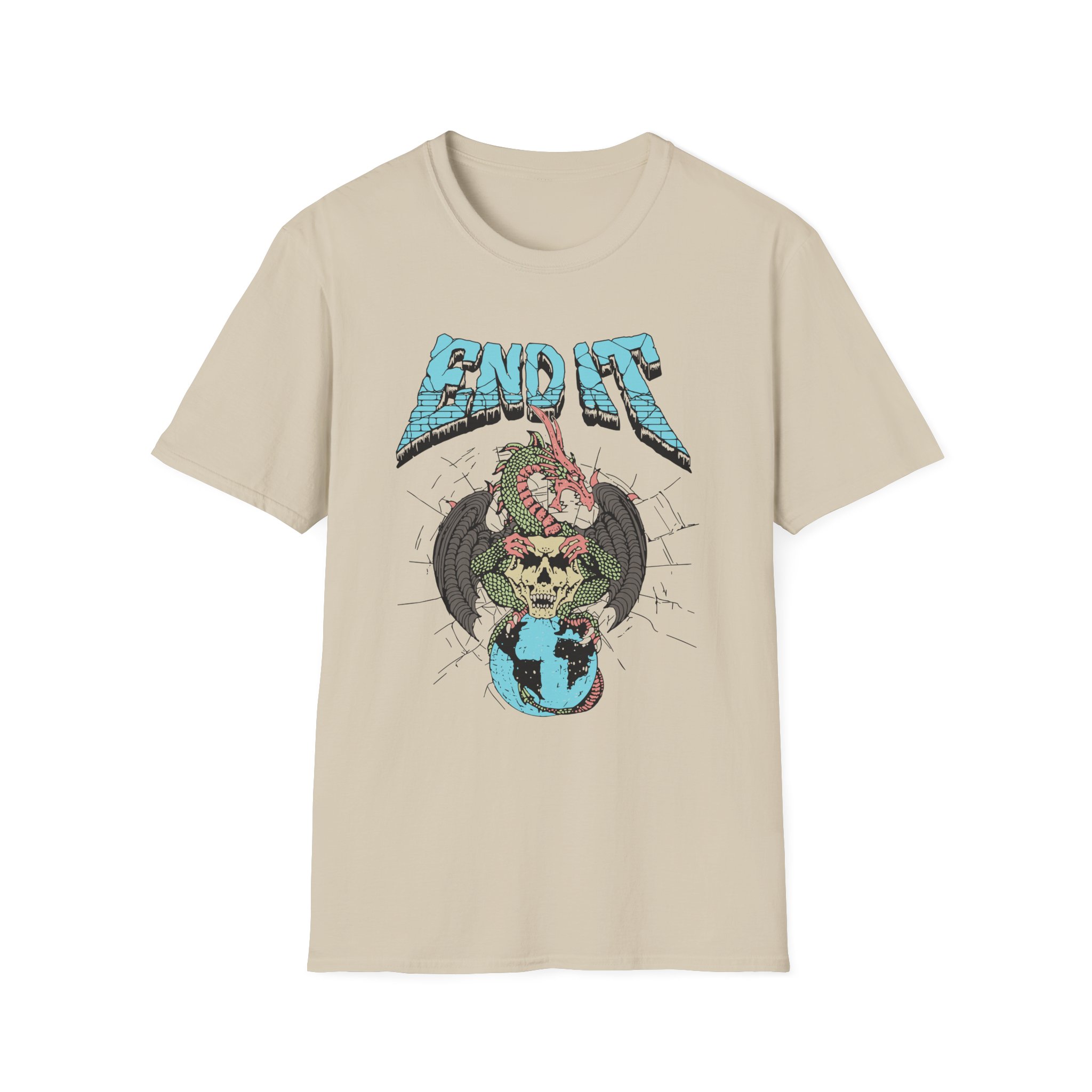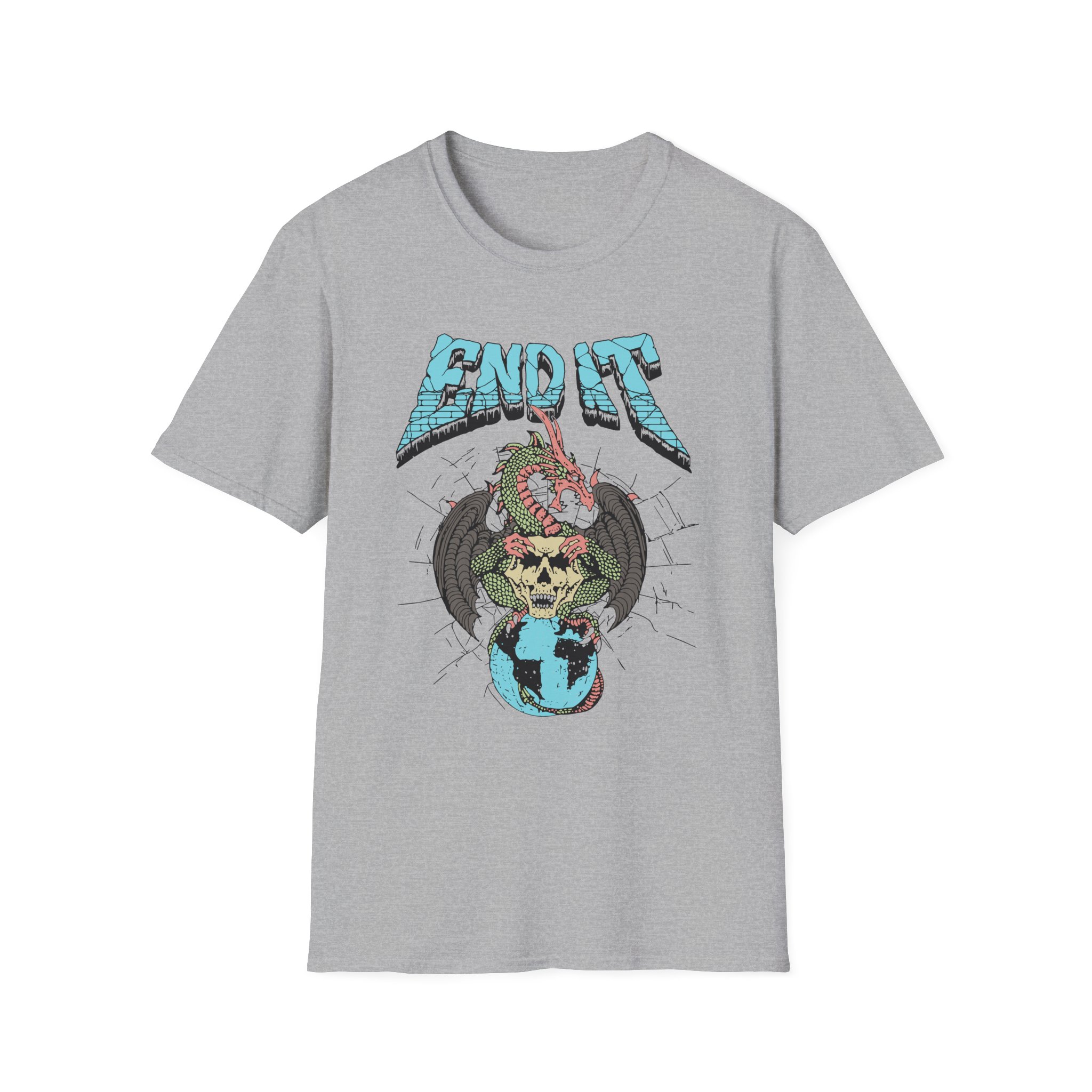 The End It Dragon Skull unisex soft-style t-shirt puts a new spin on casual comfort. Made from very soft materials, this tee is 100% cotton for solid colors. Heather colors and sports grey include polyester. The shoulders have twill tape for improved durability. There are no side seams. The collar is made with ribbed knitting to prevent curling damage.