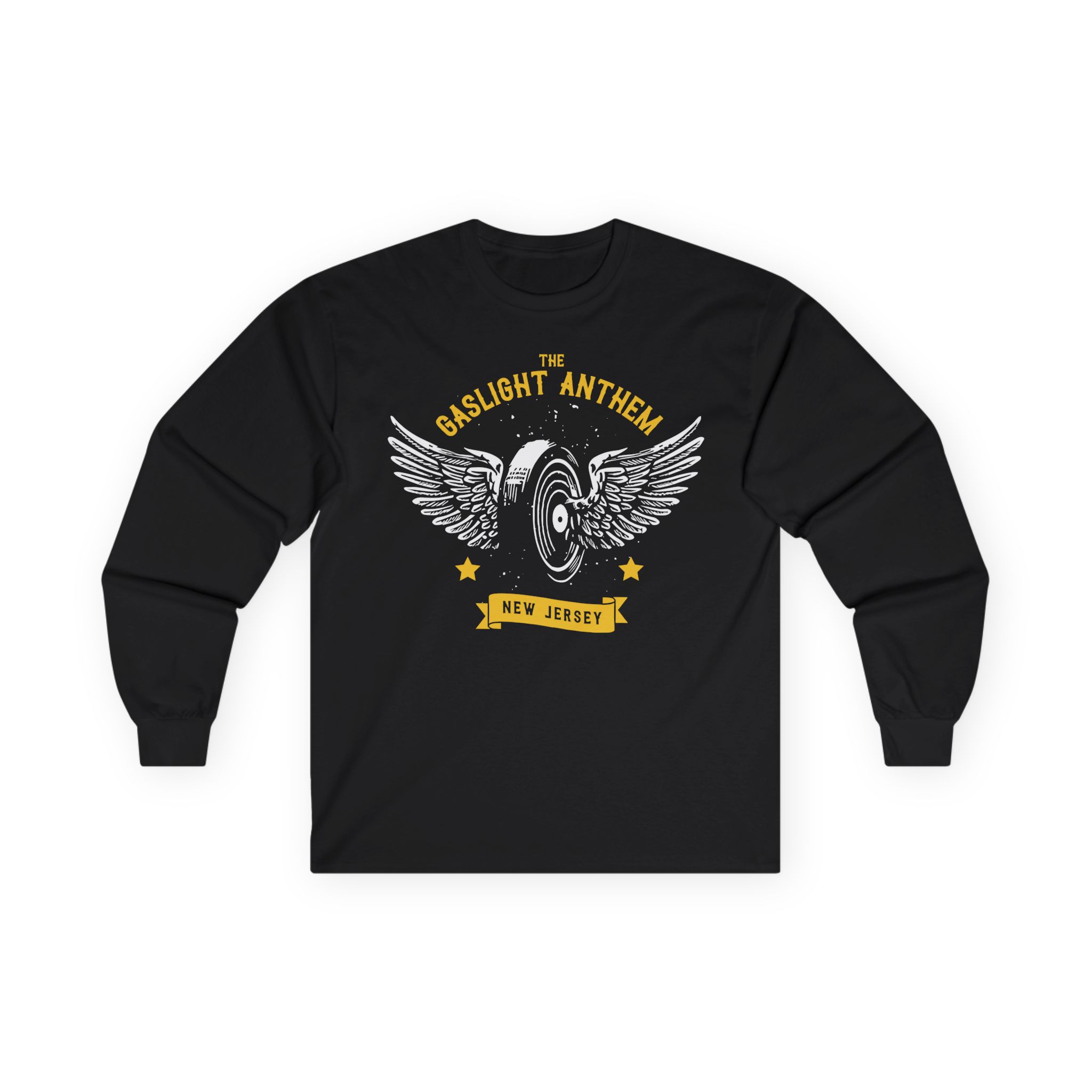 A bit more formal than a standard-issue t-shirt, the Gaslight Anthem Flying Wheel ultra cotton long sleeve tee is a clear comfort winner. The sleeves also act as a nice frame. There are no side seams. The shoulders are taped for improved durability. This makes for a good fitting around the shoulders and neck. The cotton used for these shirts is environmentally friendly.