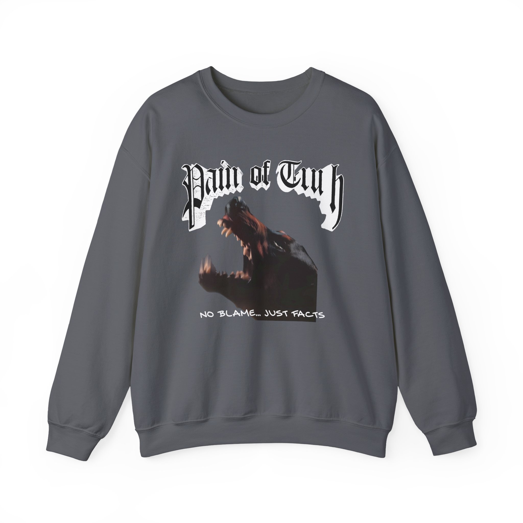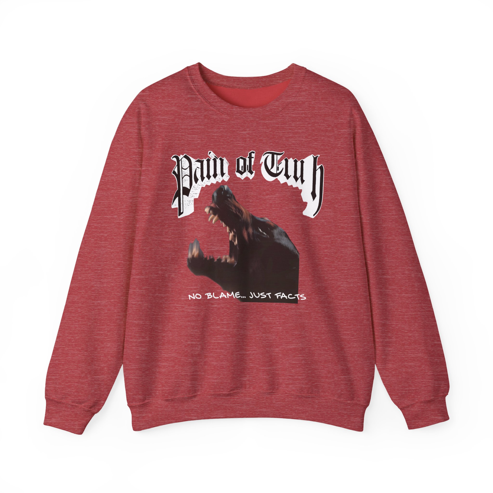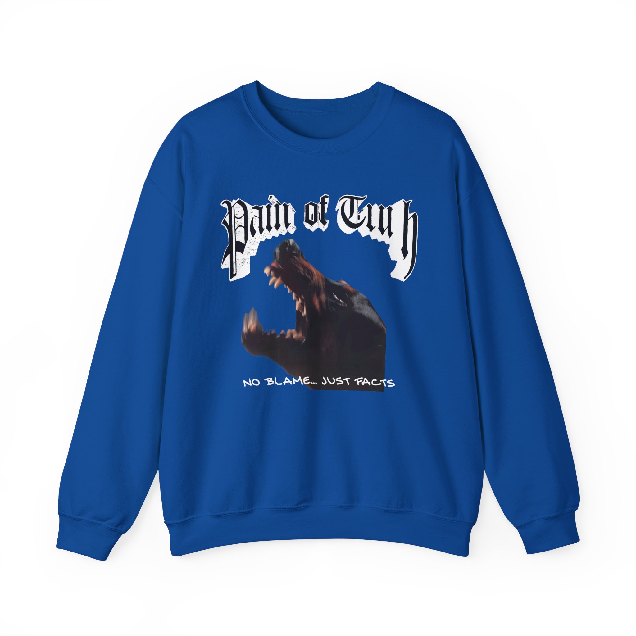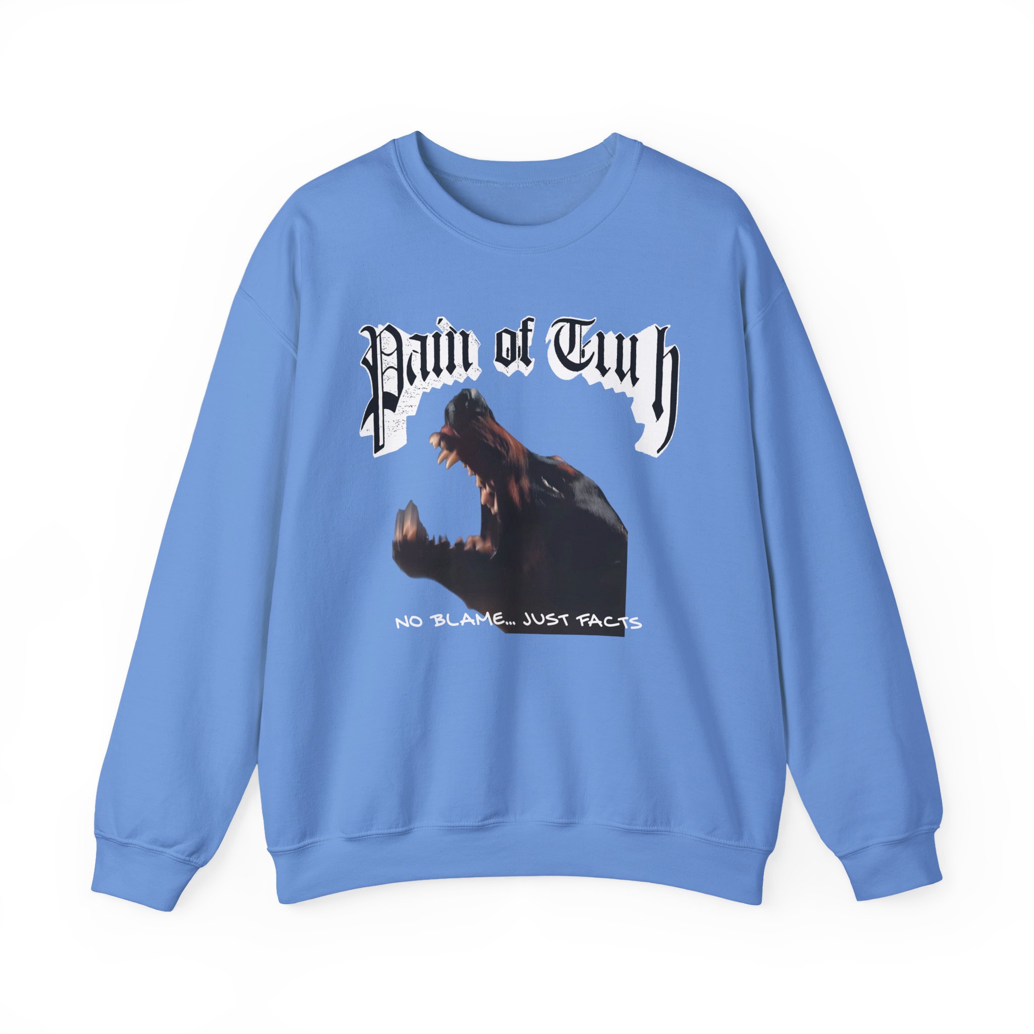 Ideal for any situation, a Pain of Truth No Blame…just Facts unisex heavy blend crewneck sweatshirt is pure comfort. These garments are made from polyester and cotton. This combination helps designs come out looking fresh and beautiful. The collar is ribbed knit, so it retains its shape even after washing. There are no itchy side seams on these sweaters.