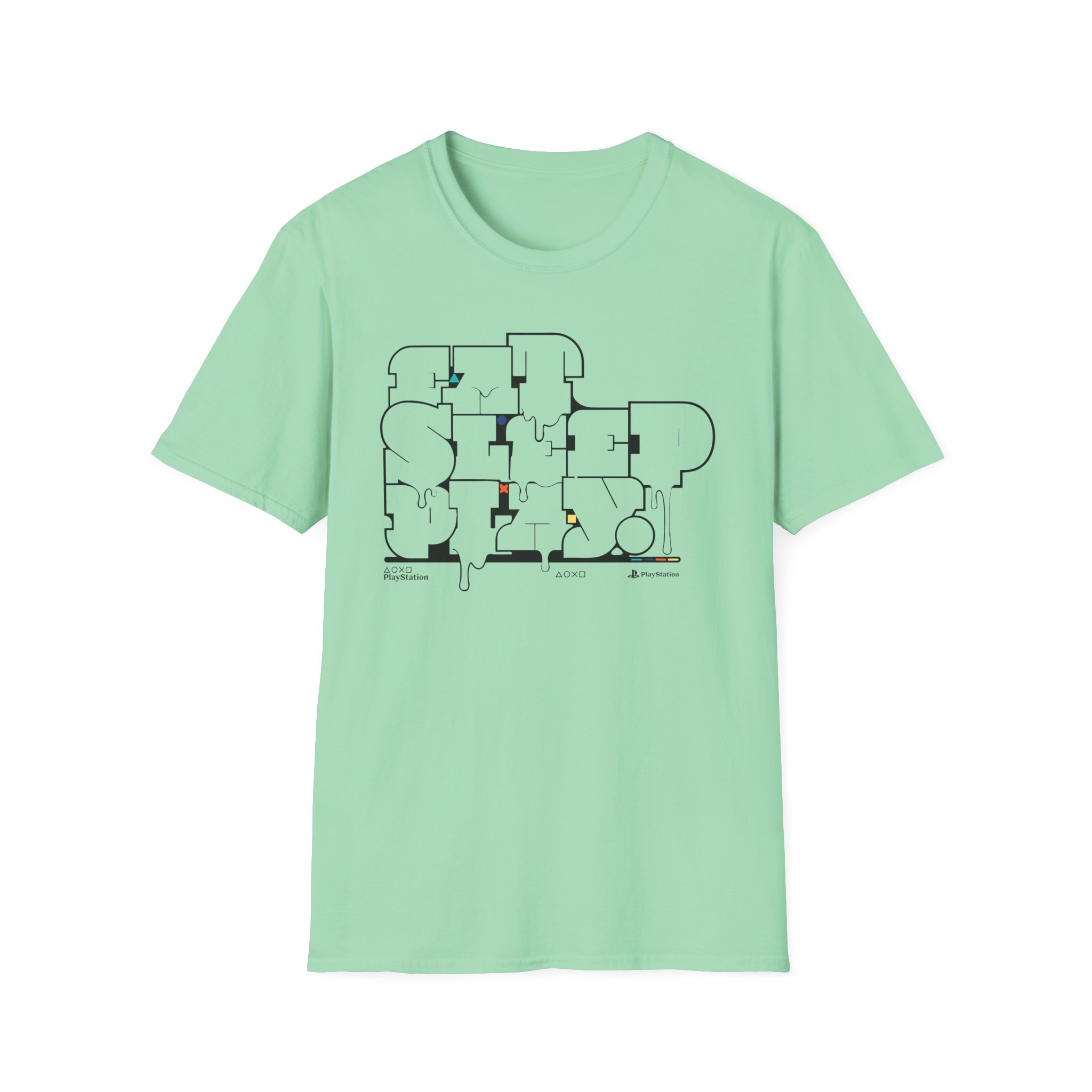 The PlayStation Eat Sleep Play unisex soft-style t-shirt puts a new spin on casual comfort. Made from very soft materials, this tee is 100% cotton for solid colors. Heather colors and sports grey include polyester. The shoulders have twill tape for improved durability. There are no side seams. The collar is made with ribbed knitting to prevent curling damage.