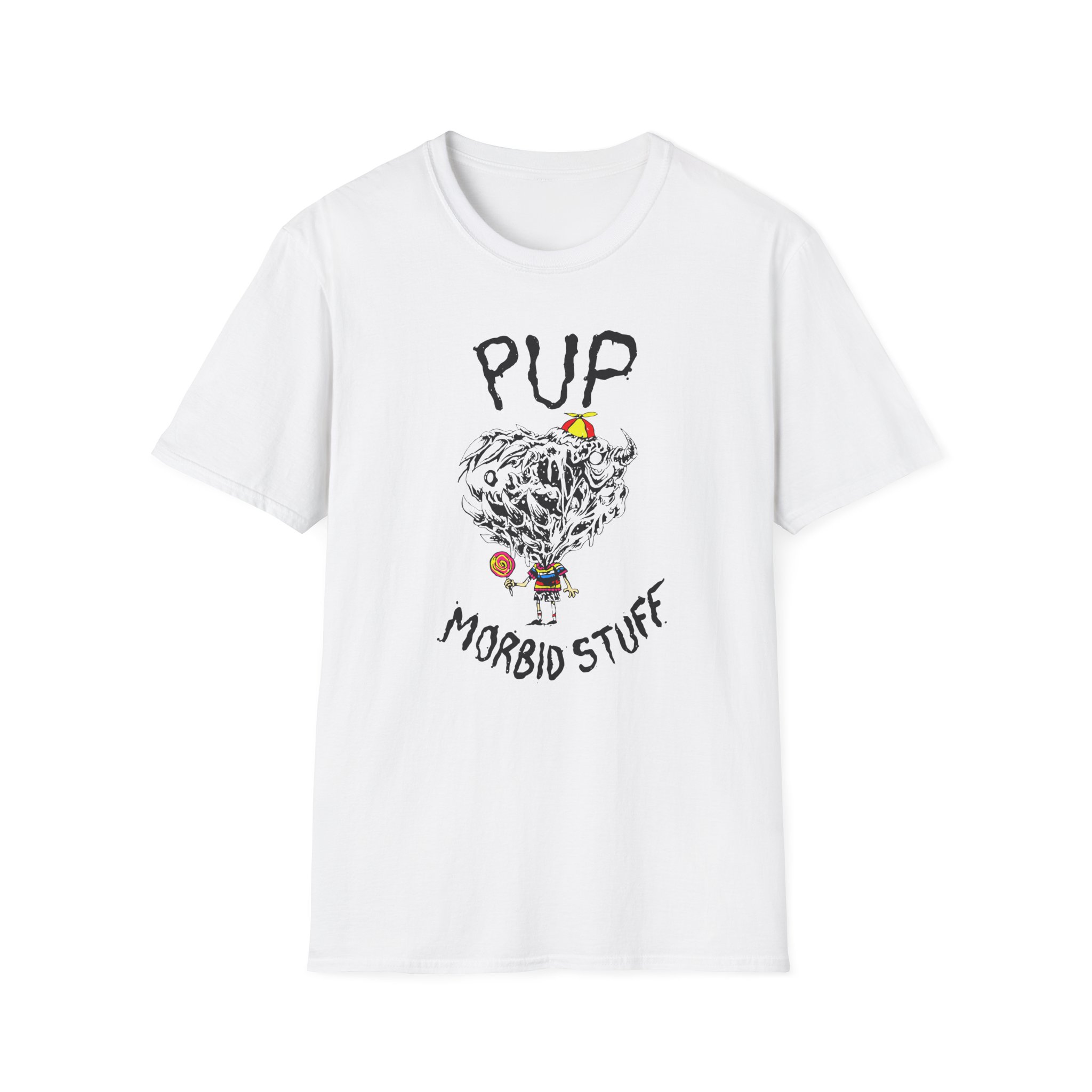 The Pup Morbid Stuff Lollipop unisex soft-style t-shirt puts a new spin on casual comfort. Made from very soft materials, this tee is 100% cotton for solid colors. Heather colors and sports grey include polyester. The shoulders have twill tape for improved durability. There are no side seams. The collar is made with ribbed knitting to prevent curling damage.