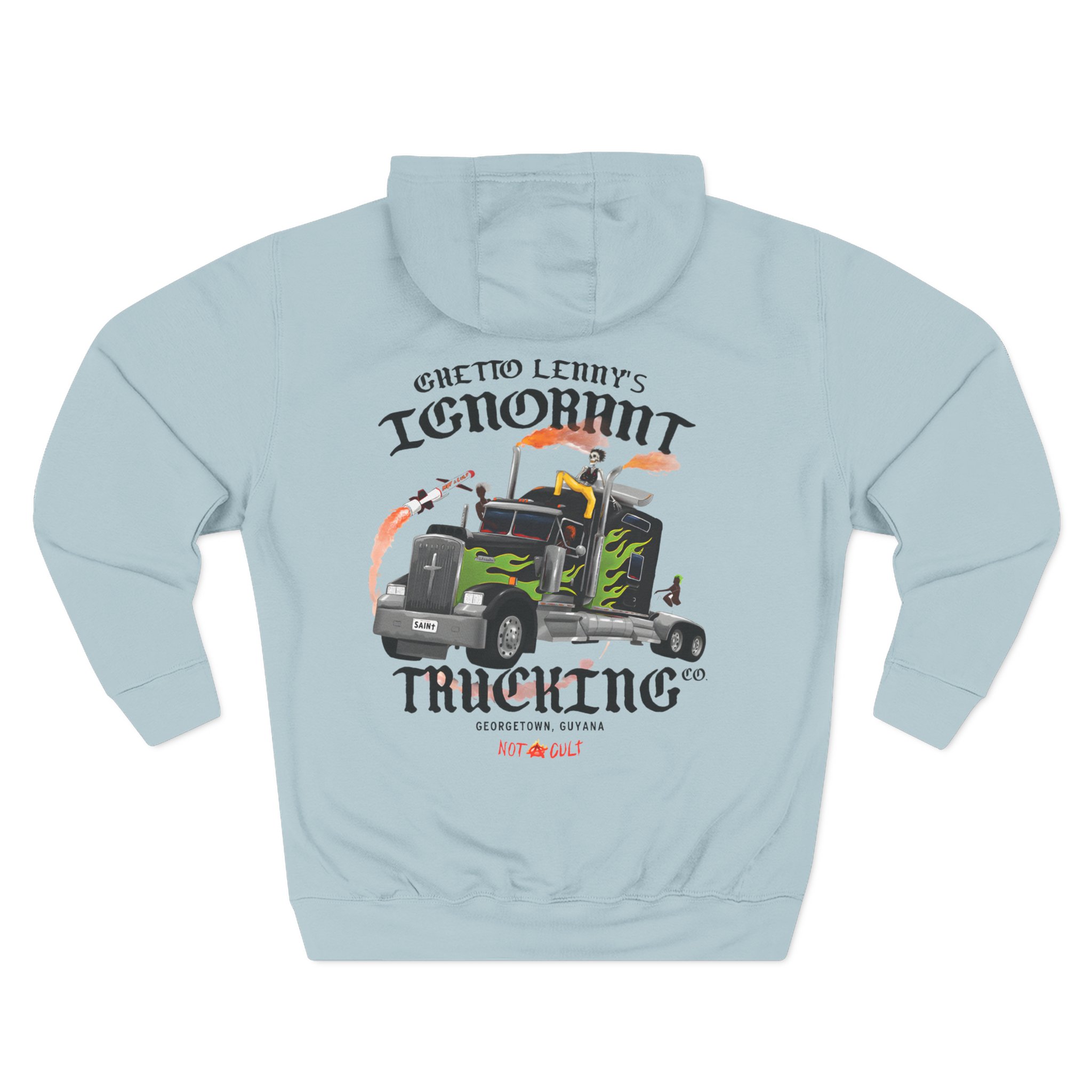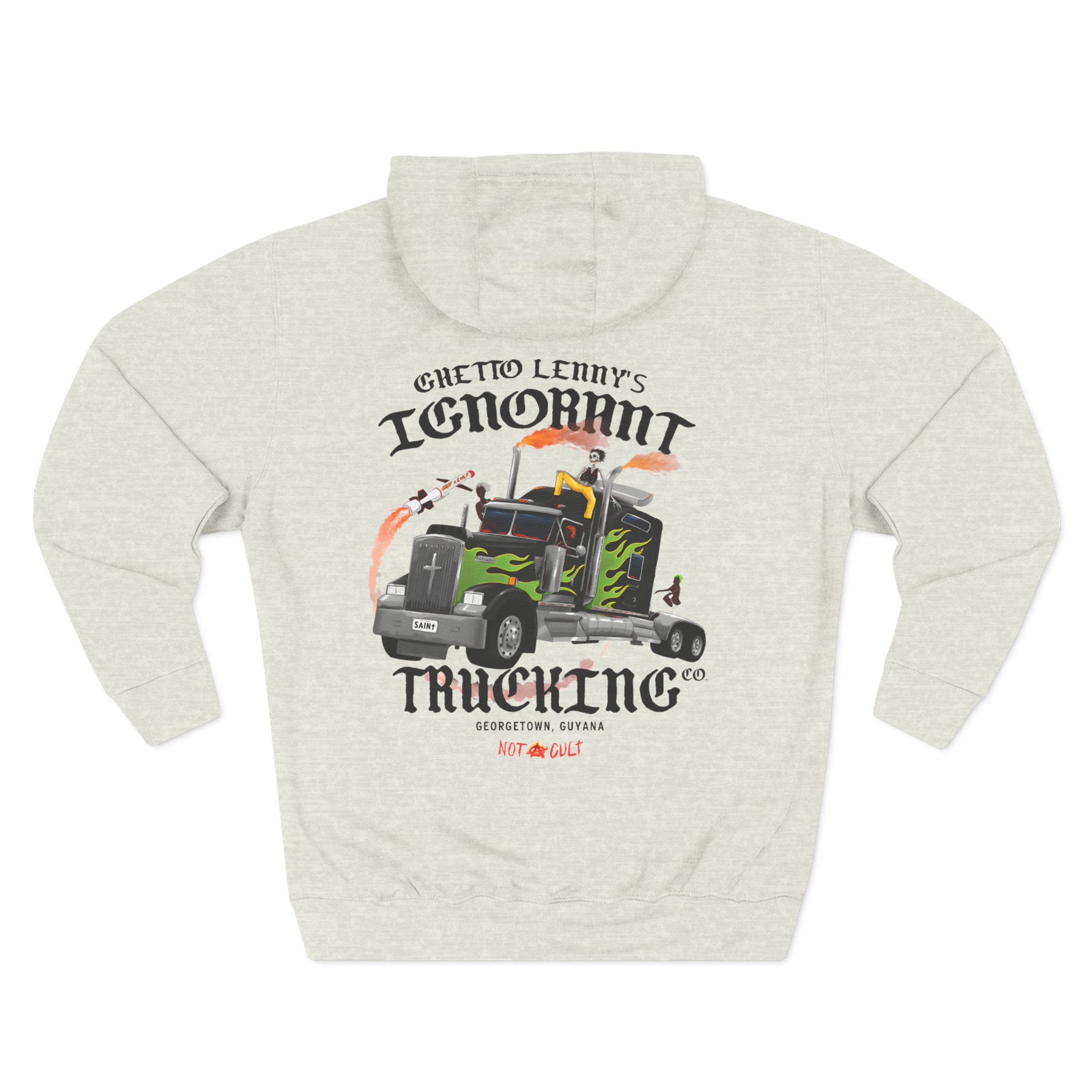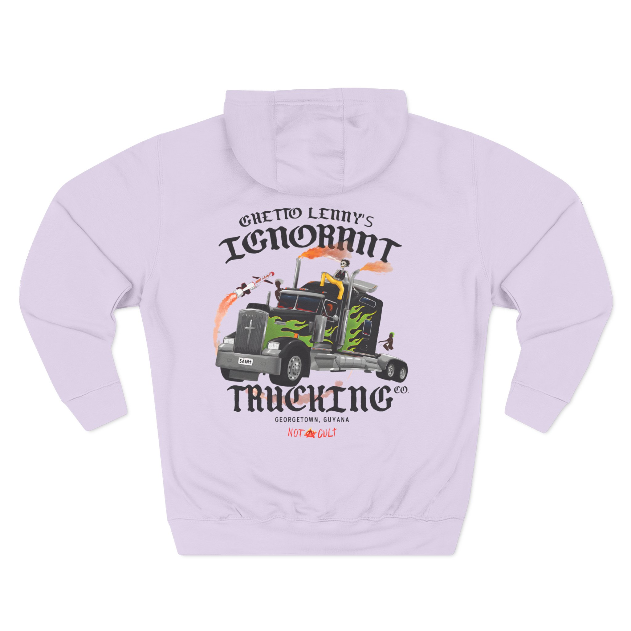 Beat the cold with this Saint Jhn Ghetto Lenny’s Trucking Co. premium pullover hoodie that’s just the right layer of warm and cozy. Made with three-panel fleece lining, this pullover is double stitched for durability and roomy. Pick one in your favorite color to match your style.