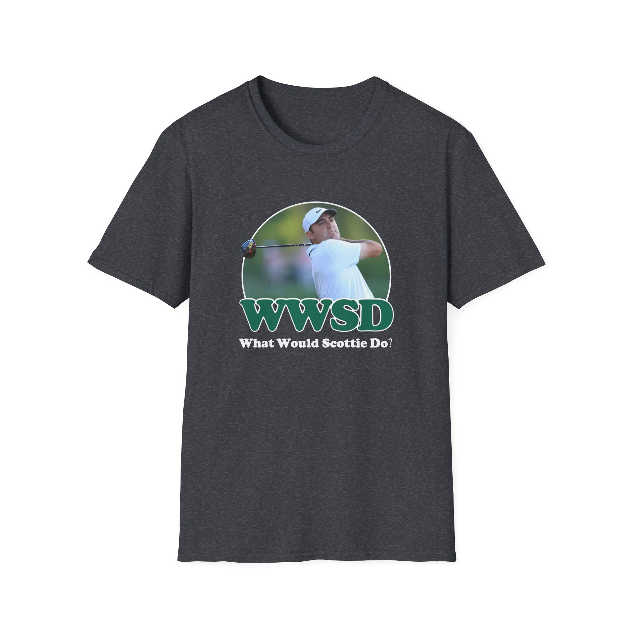 The Scottie Scheffler What Would Do Wwsd unisex soft-style t-shirt puts a new spin on casual comfort. Made from very soft materials, this tee is 100% cotton for solid colors. Heather colors and sports grey include polyester. The shoulders have twill tape for improved durability. There are no side seams. The collar is made with ribbed knitting to prevent curling damage.