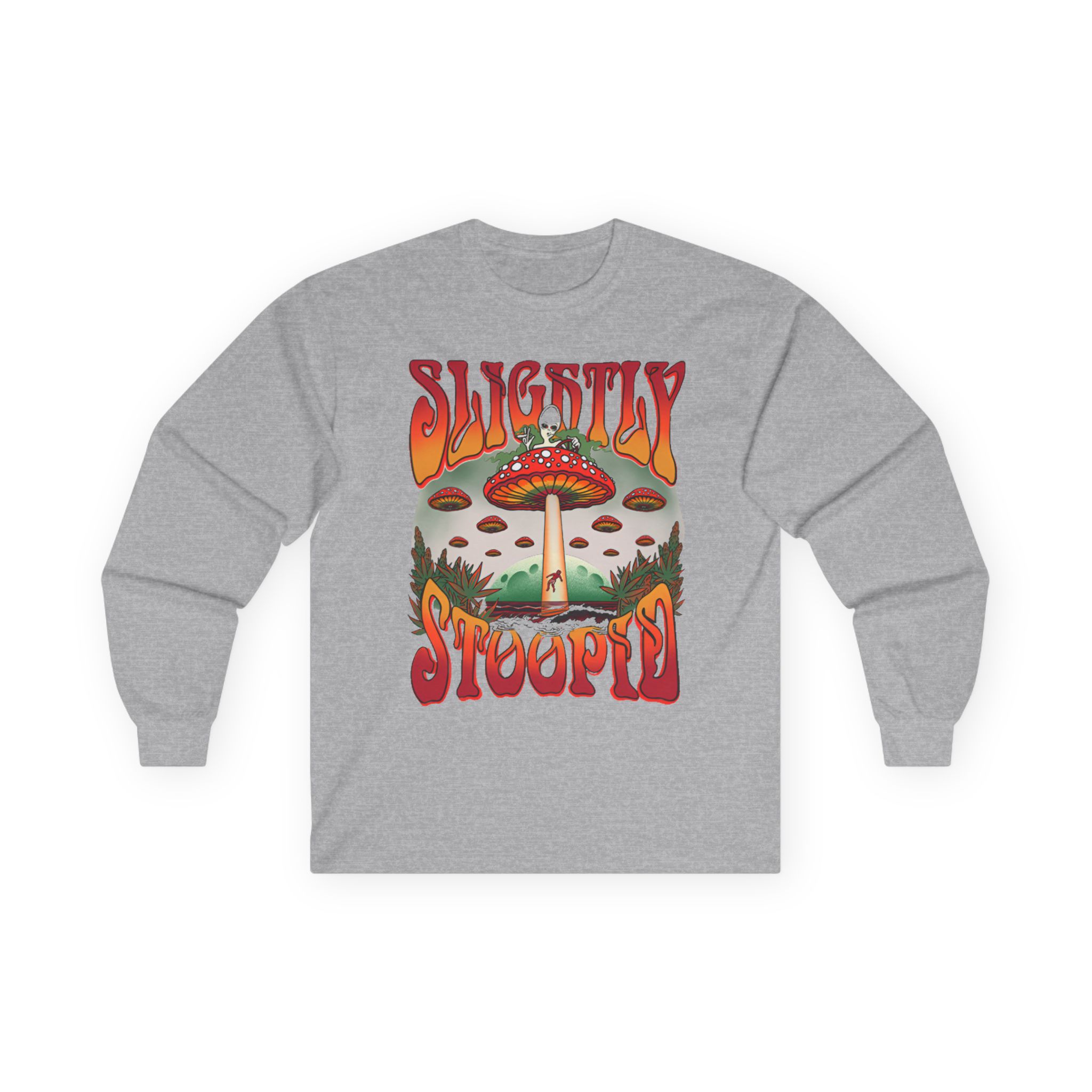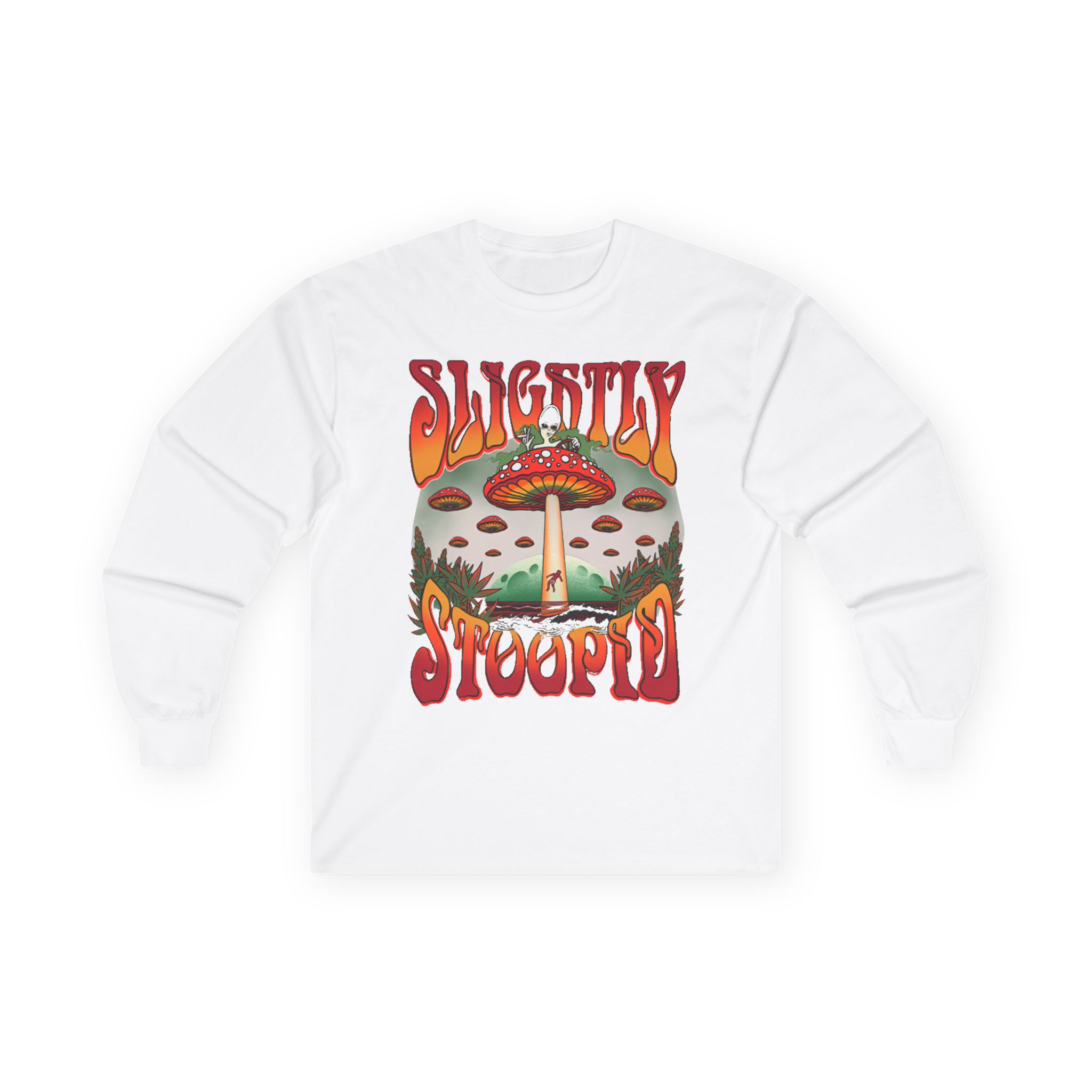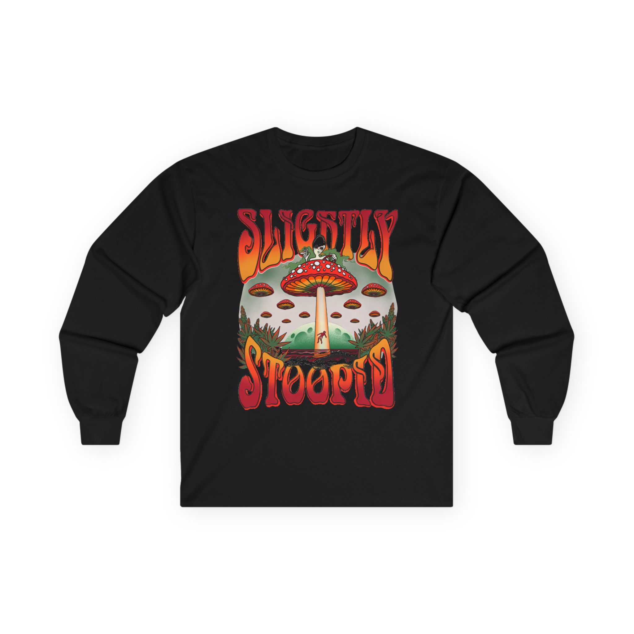 A bit more formal than a standard-issue t-shirt, the Slightly Stoopid Mushroom Ufo ultra cotton long sleeve tee is a clear comfort winner. The sleeves also act as a nice frame. There are no side seams. The shoulders are taped for improved durability. This makes for a good fitting around the shoulders and neck. The cotton used for these shirts is environmentally friendly.