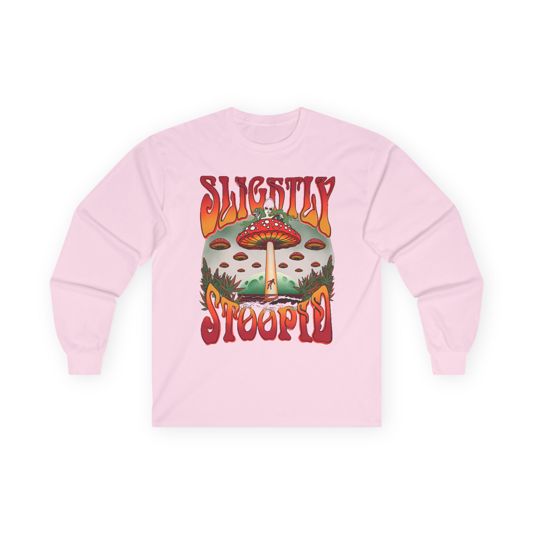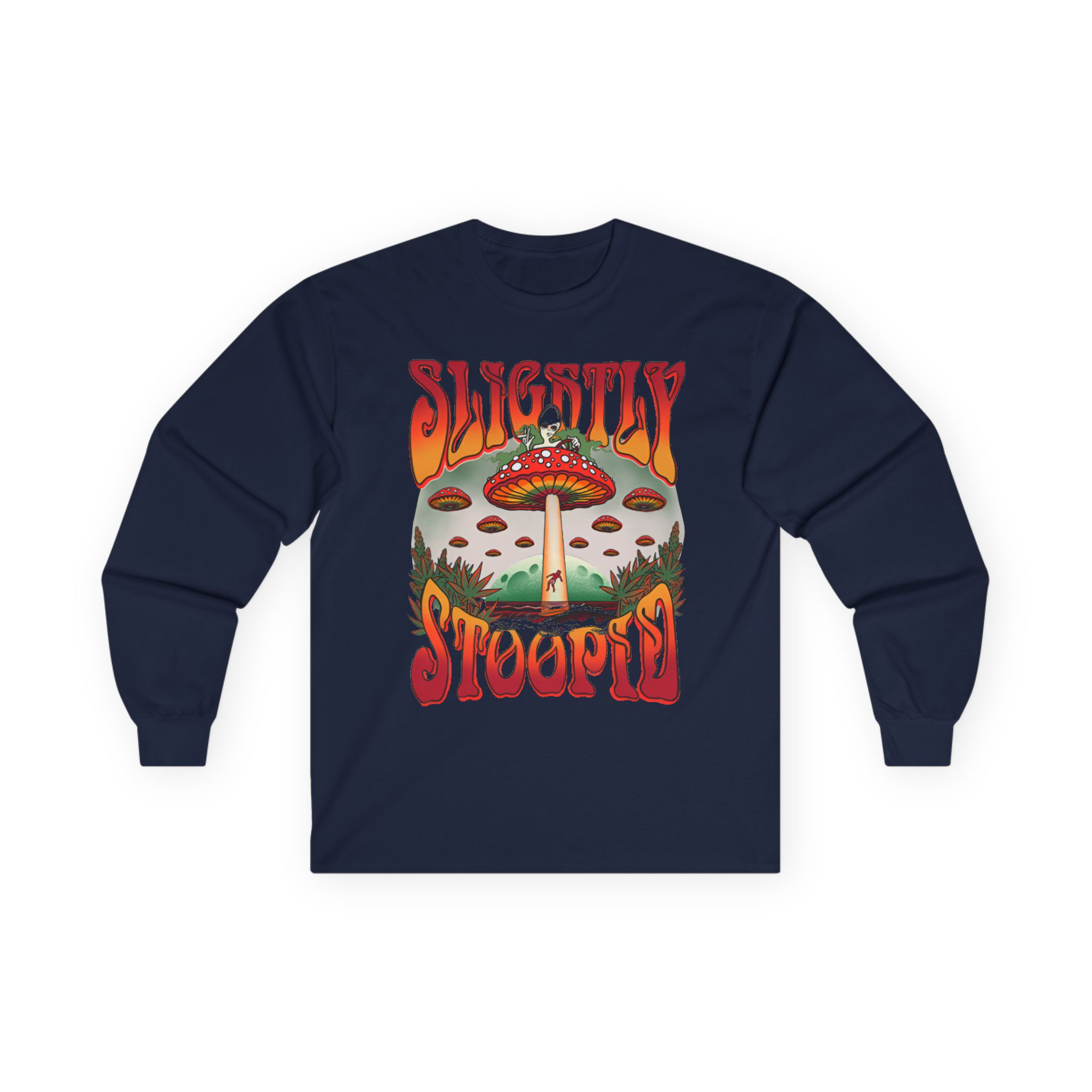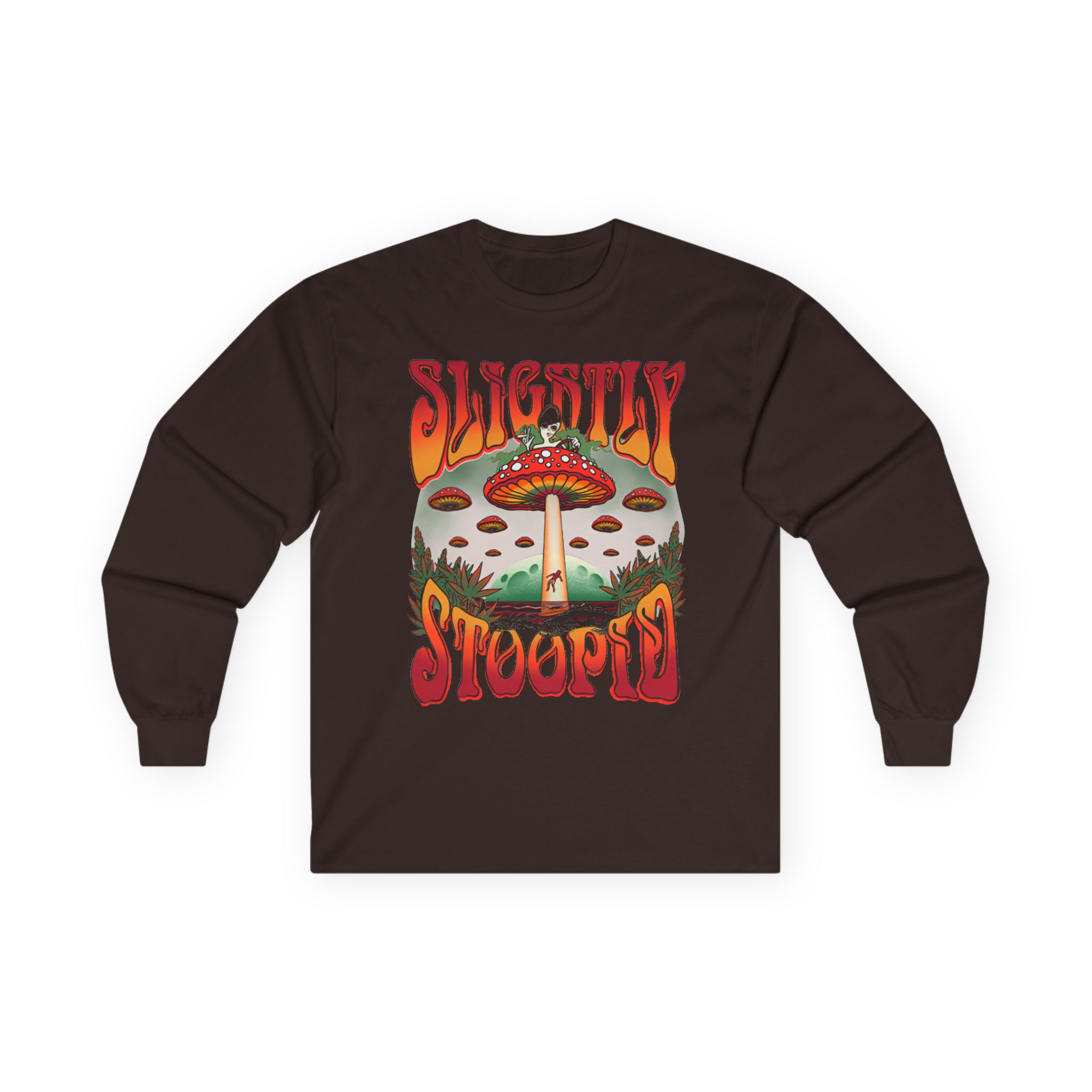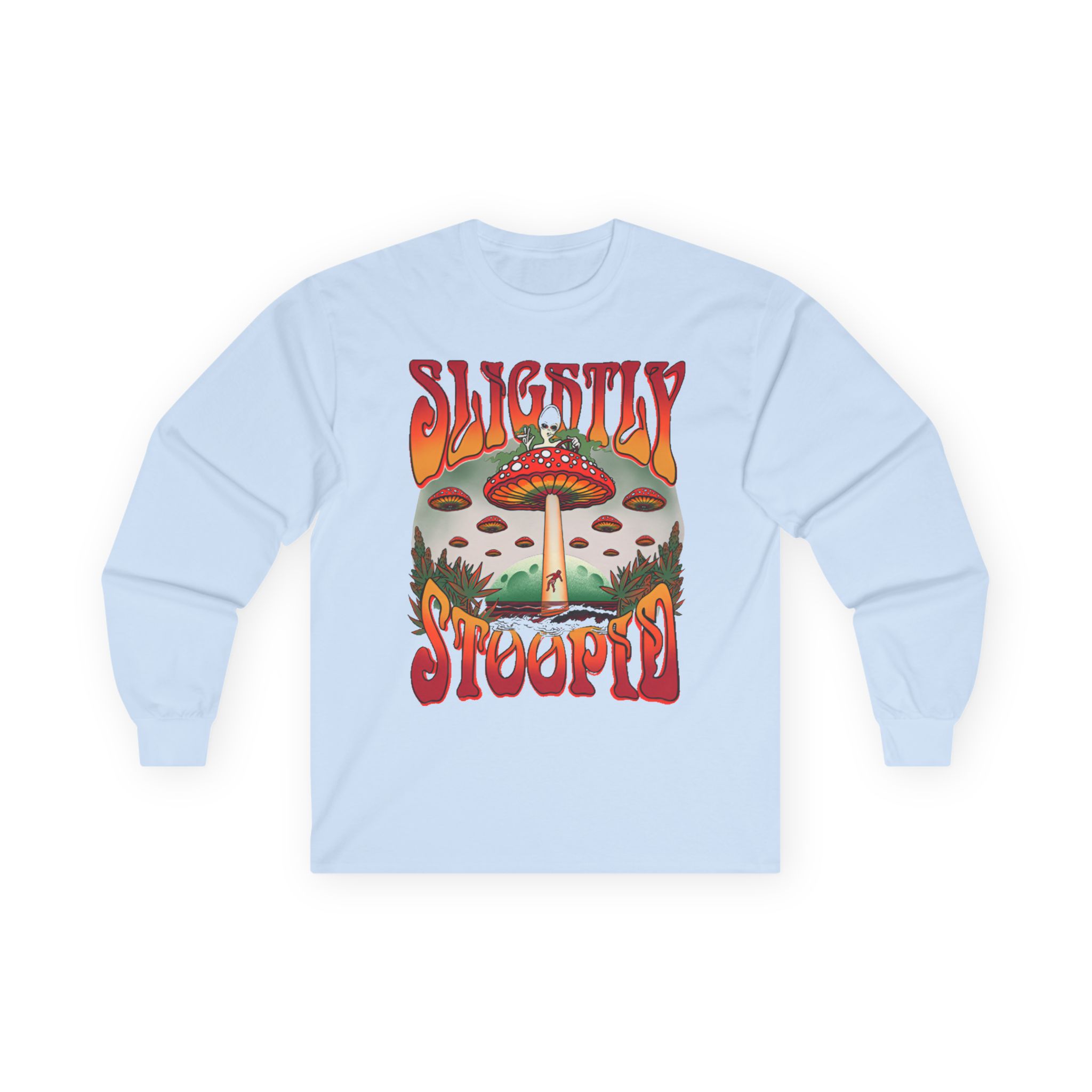 A bit more formal than a standard-issue t-shirt, the Slightly Stoopid Mushroom Ufo ultra cotton long sleeve tee is a clear comfort winner. The sleeves also act as a nice frame. There are no side seams. The shoulders are taped for improved durability. This makes for a good fitting around the shoulders and neck. The cotton used for these shirts is environmentally friendly.