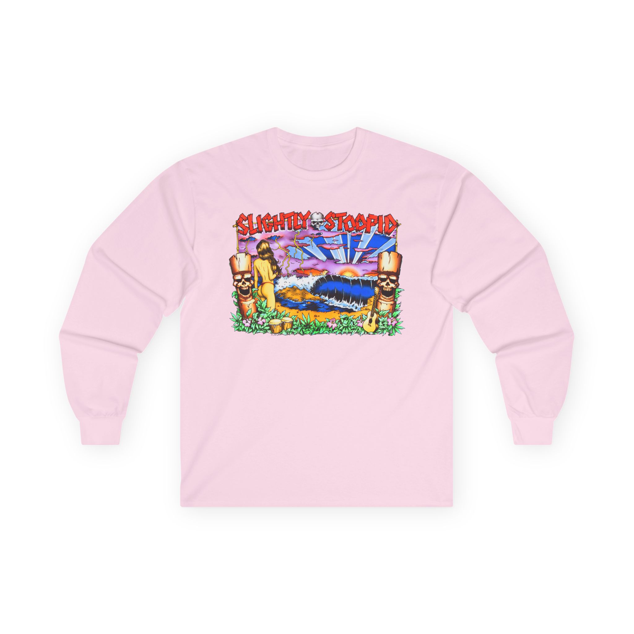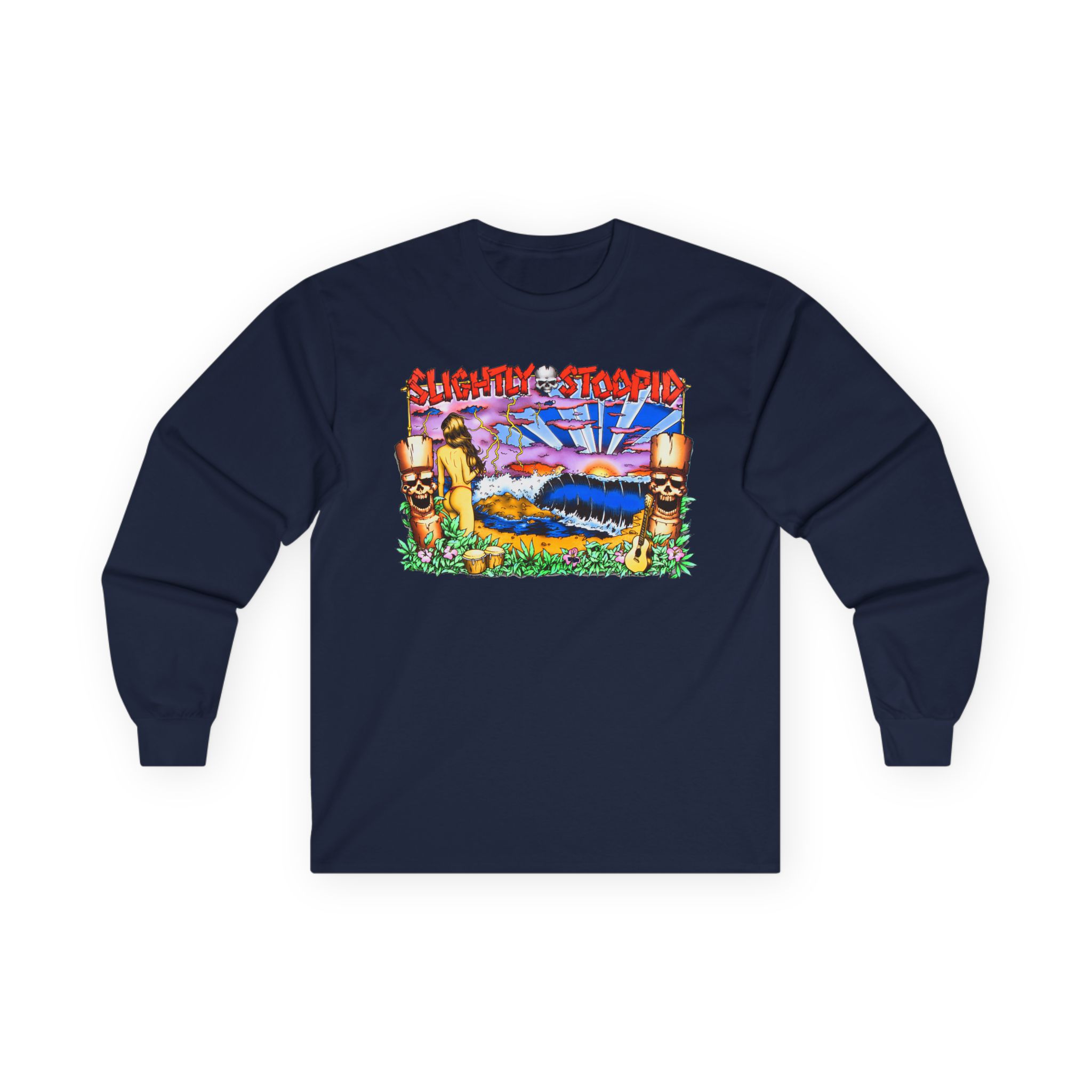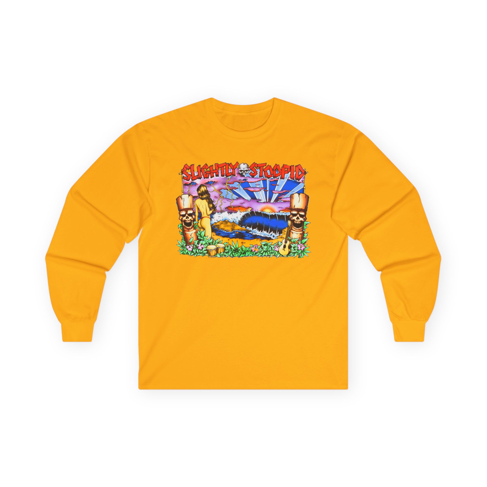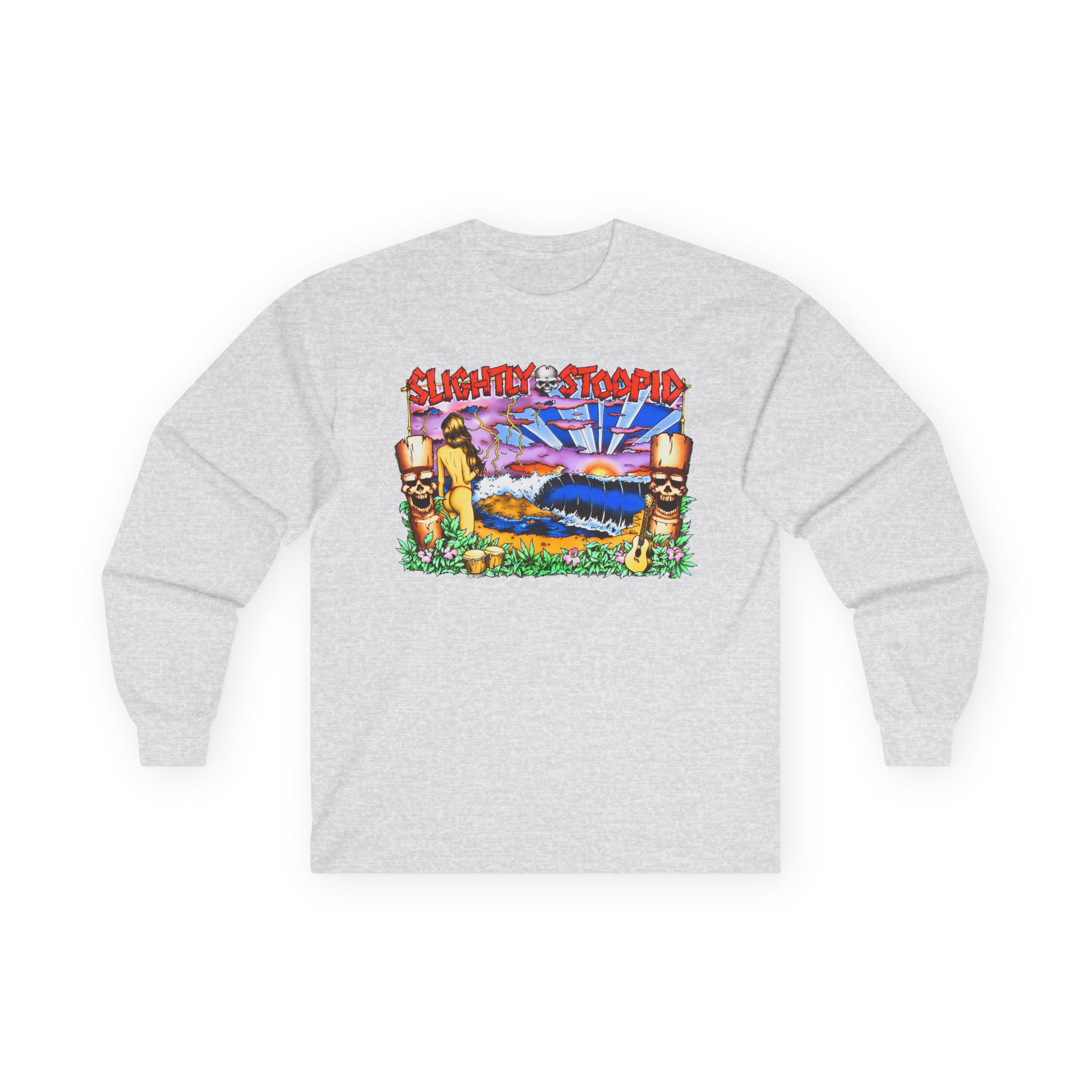 A bit more formal than a standard-issue t-shirt, the Slightly Stoopid Tiki ultra cotton long sleeve tee is a clear comfort winner. The sleeves also act as a nice frame. There are no side seams. The shoulders are taped for improved durability. This makes for a good fitting around the shoulders and neck. The cotton used for these shirts is environmentally friendly.