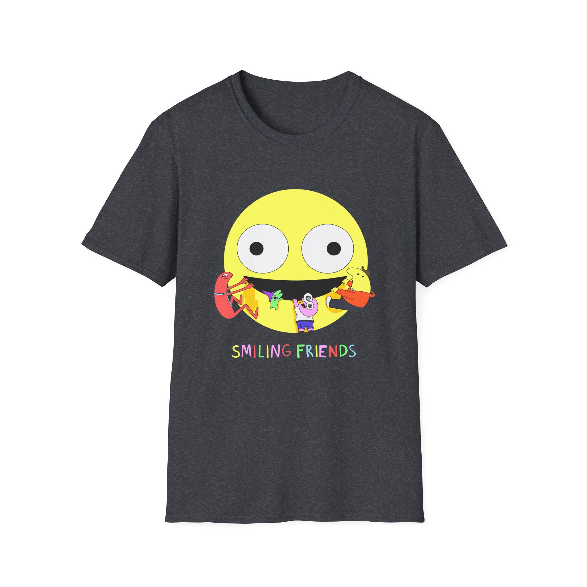 The Smiling Friends unisex soft-style t-shirt puts a new spin on casual comfort. Made from very soft materials, this tee is 100% cotton for solid colors. Heather colors and sports grey include polyester. The shoulders have twill tape for improved durability. There are no side seams. The collar is made with ribbed knitting to prevent curling damage.