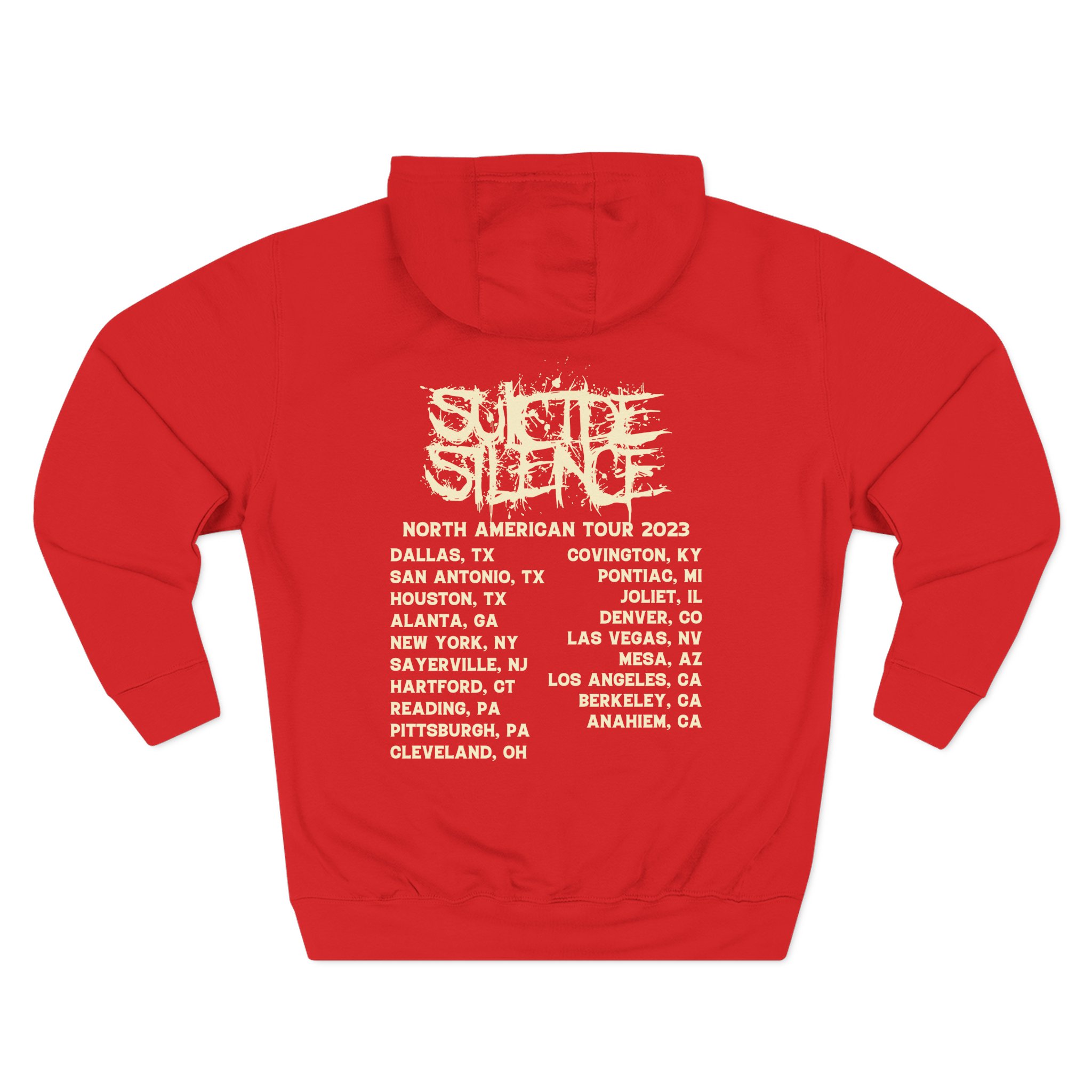 Beat the cold with this Suicide Silence Rymd Cover Tour 2023 premium pullover hoodie that’s just the right layer of warm and cozy. Made with three-panel fleece lining, this pullover is double stitched for durability and roomy. Pick one in your favorite color to match your style.