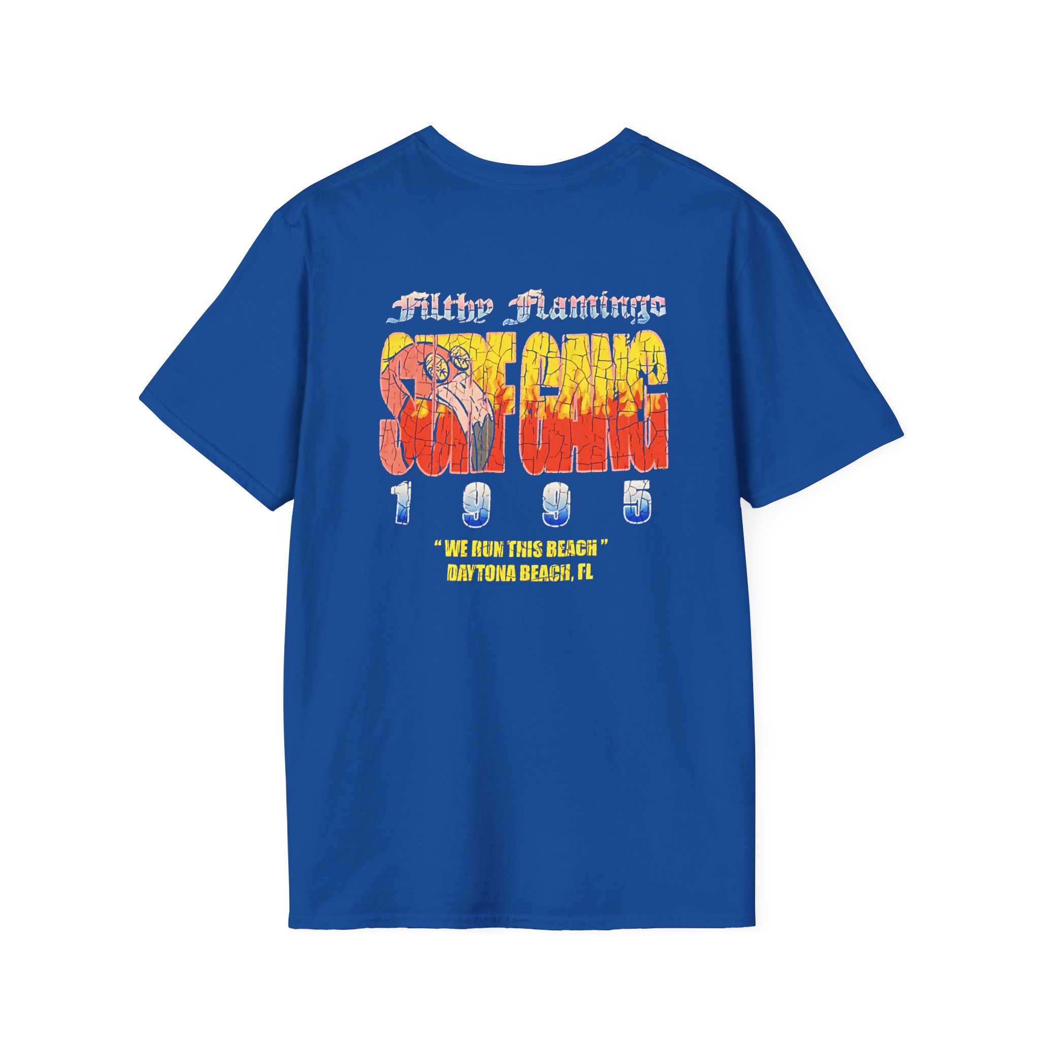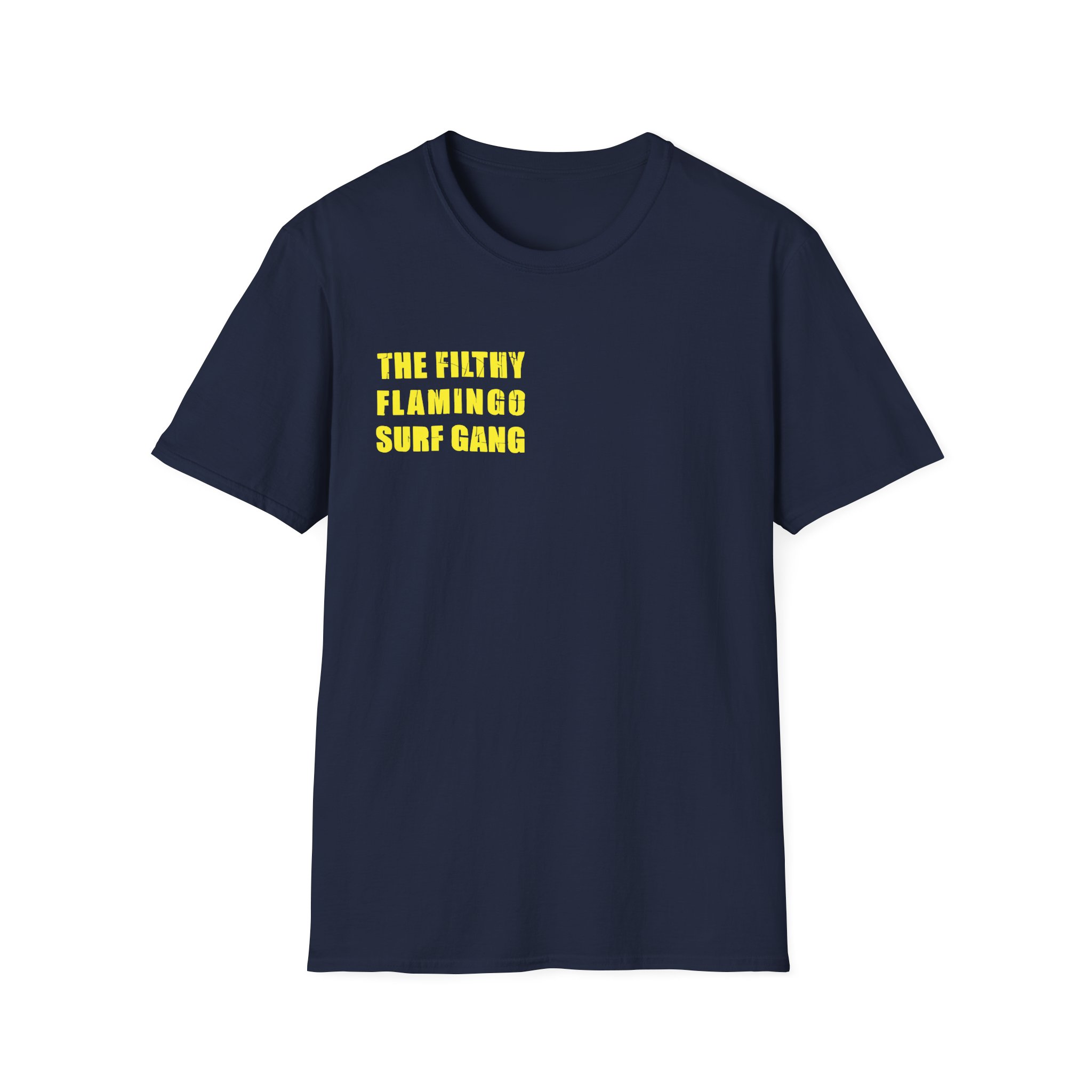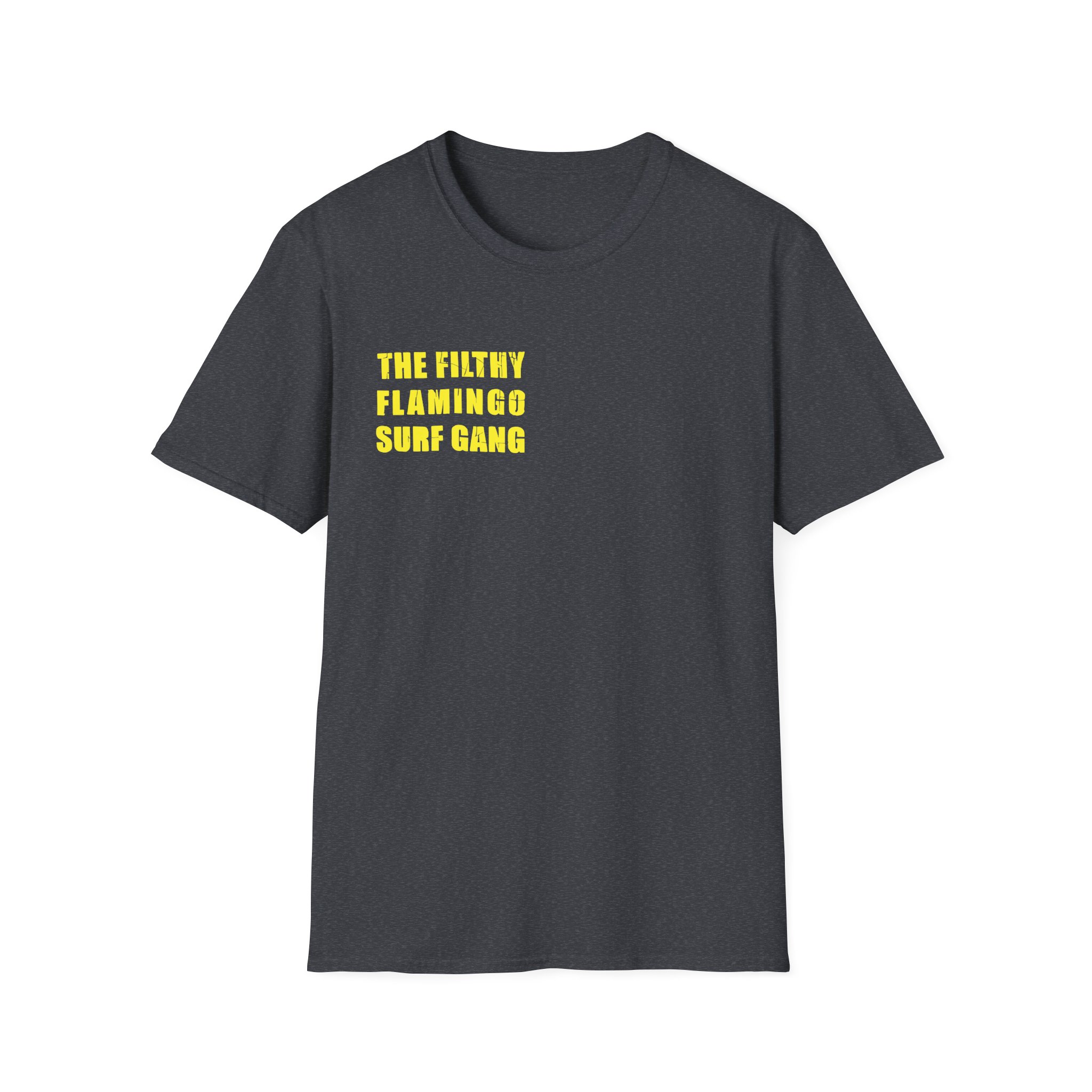 The Surf Gang Filthy Flamingo unisex soft-style t-shirt puts a new spin on casual comfort. Made from very soft materials, this tee is 100% cotton for solid colors. Heather colors and sports grey include polyester. The shoulders have twill tape for improved durability. There are no side seams. The collar is made with ribbed knitting to prevent curling damage.