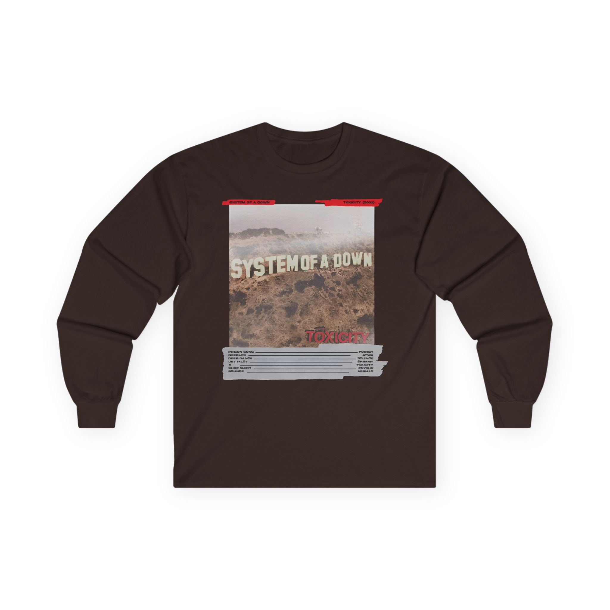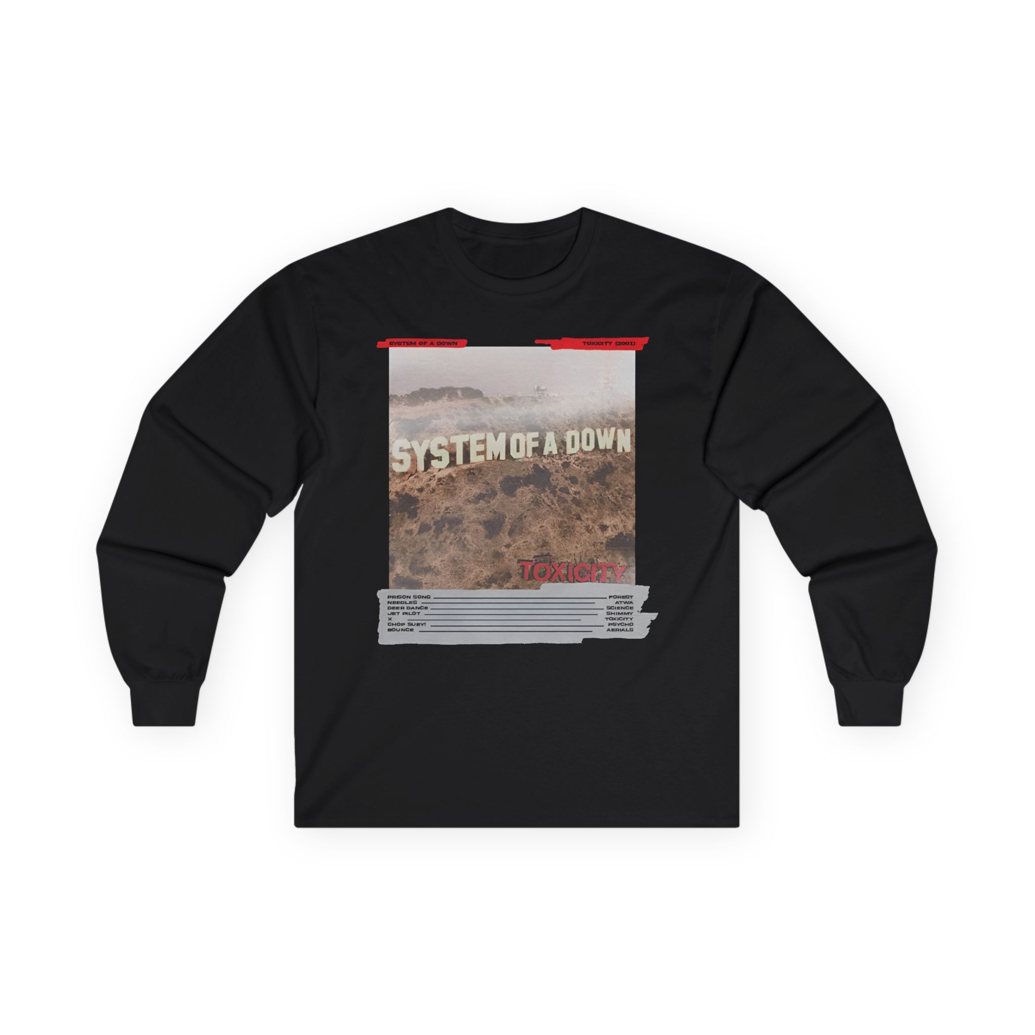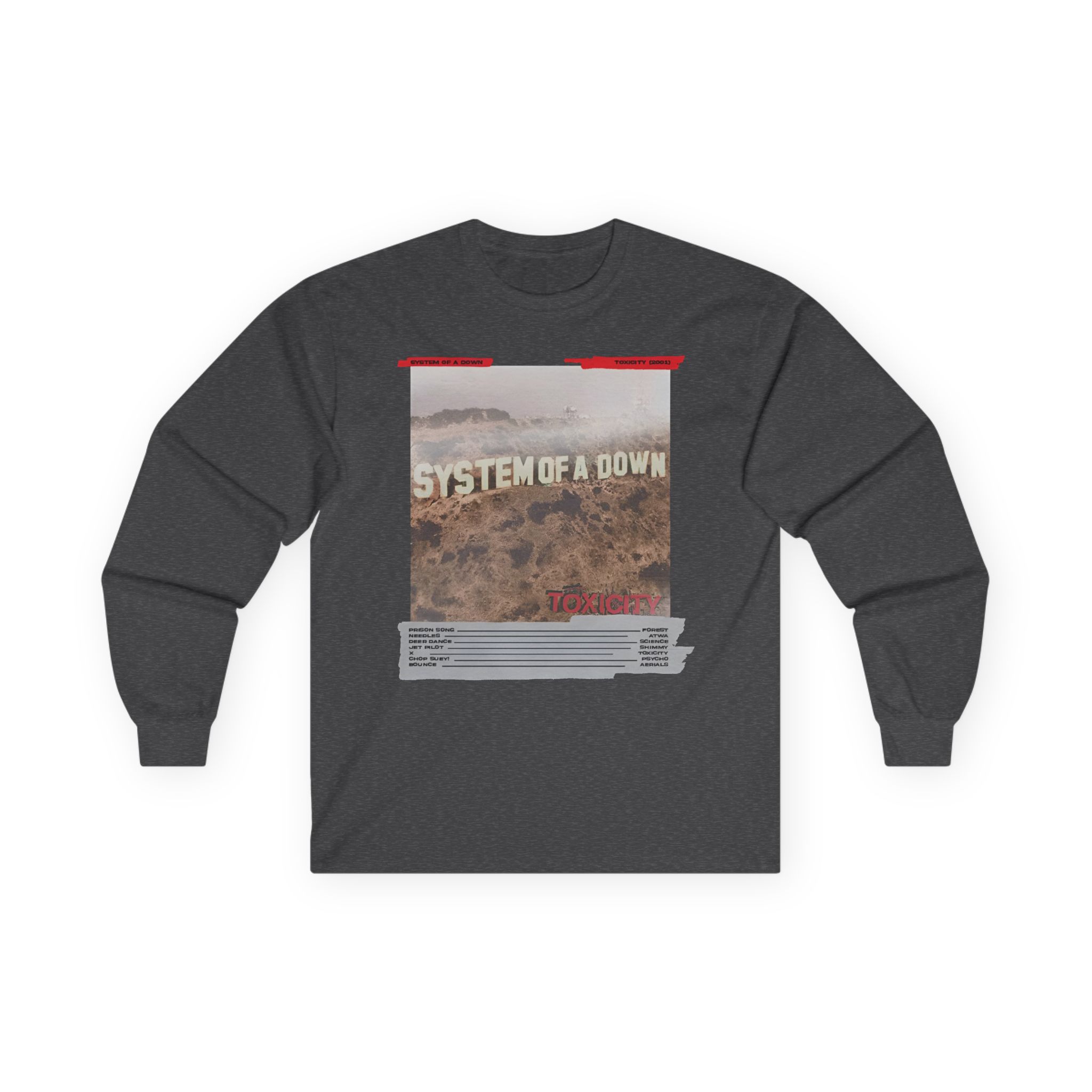 A bit more formal than a standard-issue t-shirt, the System of a Down Mixing Board ultra cotton long sleeve tee is a clear comfort winner. The sleeves also act as a nice frame. There are no side seams. The shoulders are taped for improved durability. This makes for a good fitting around the shoulders and neck. The cotton used for these shirts is environmentally friendly.