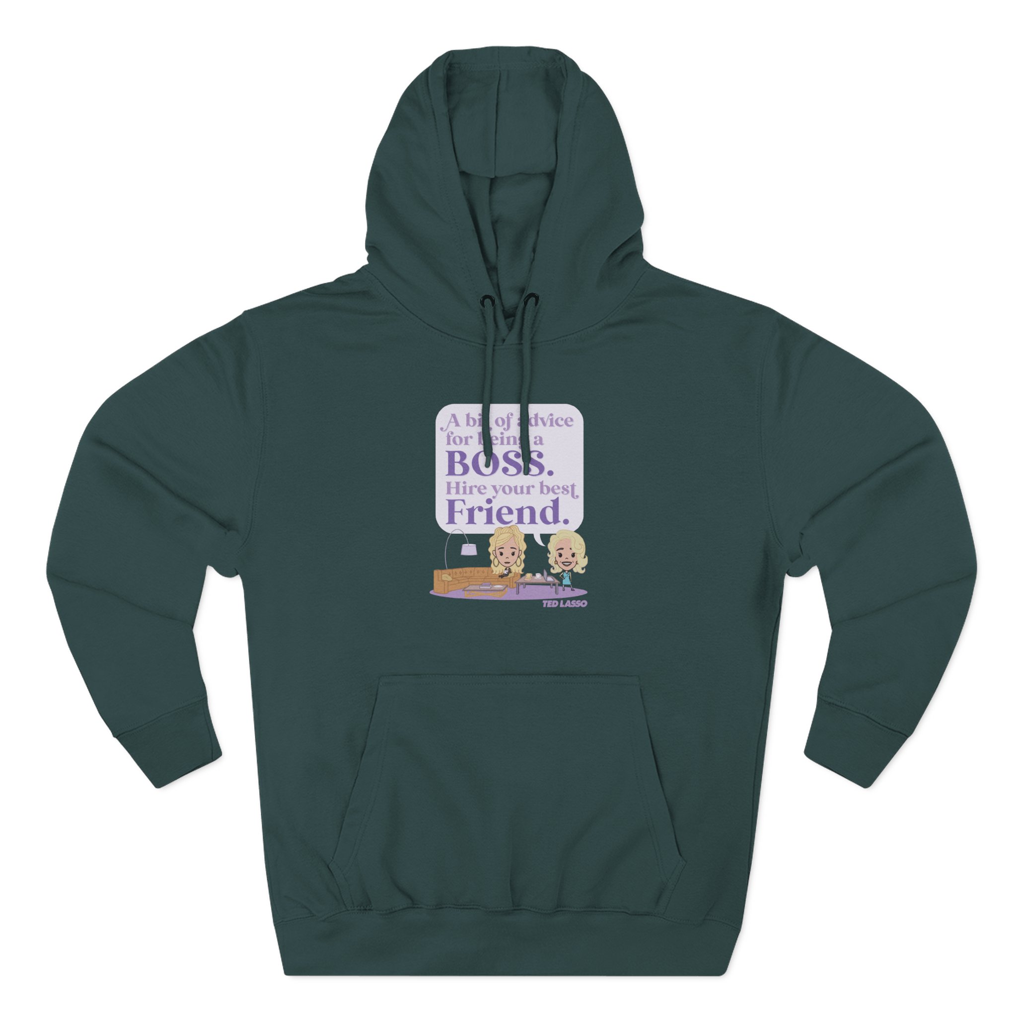 Beat the cold with this Ted Lasso Hire Your Best Friend premium pullover hoodie that’s just the right layer of warm and cozy. Made with three-panel fleece lining, this pullover is double stitched for durability and roomy. Pick one in your favorite color to match your style.