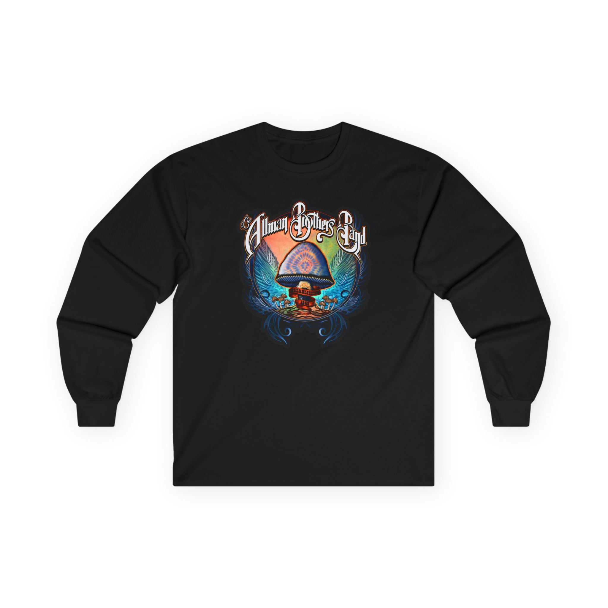 A bit more formal than a standard-issue t-shirt, the The Allman Brothers Psychedelic Mushroom ultra cotton long sleeve tee is a clear comfort winner. The sleeves also act as a nice frame. There are no side seams. The shoulders are taped for improved durability. This makes for a good fitting around the shoulders and neck. The cotton used for these shirts is environmentally friendly.