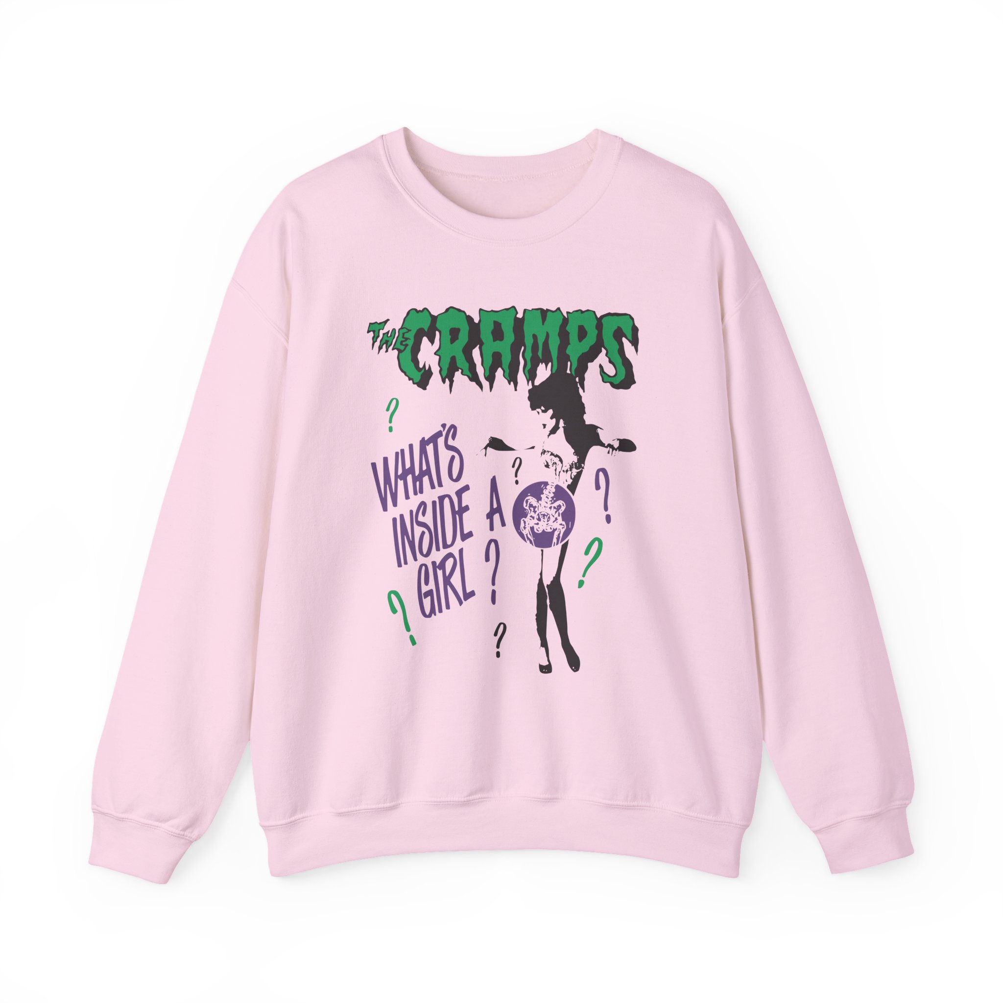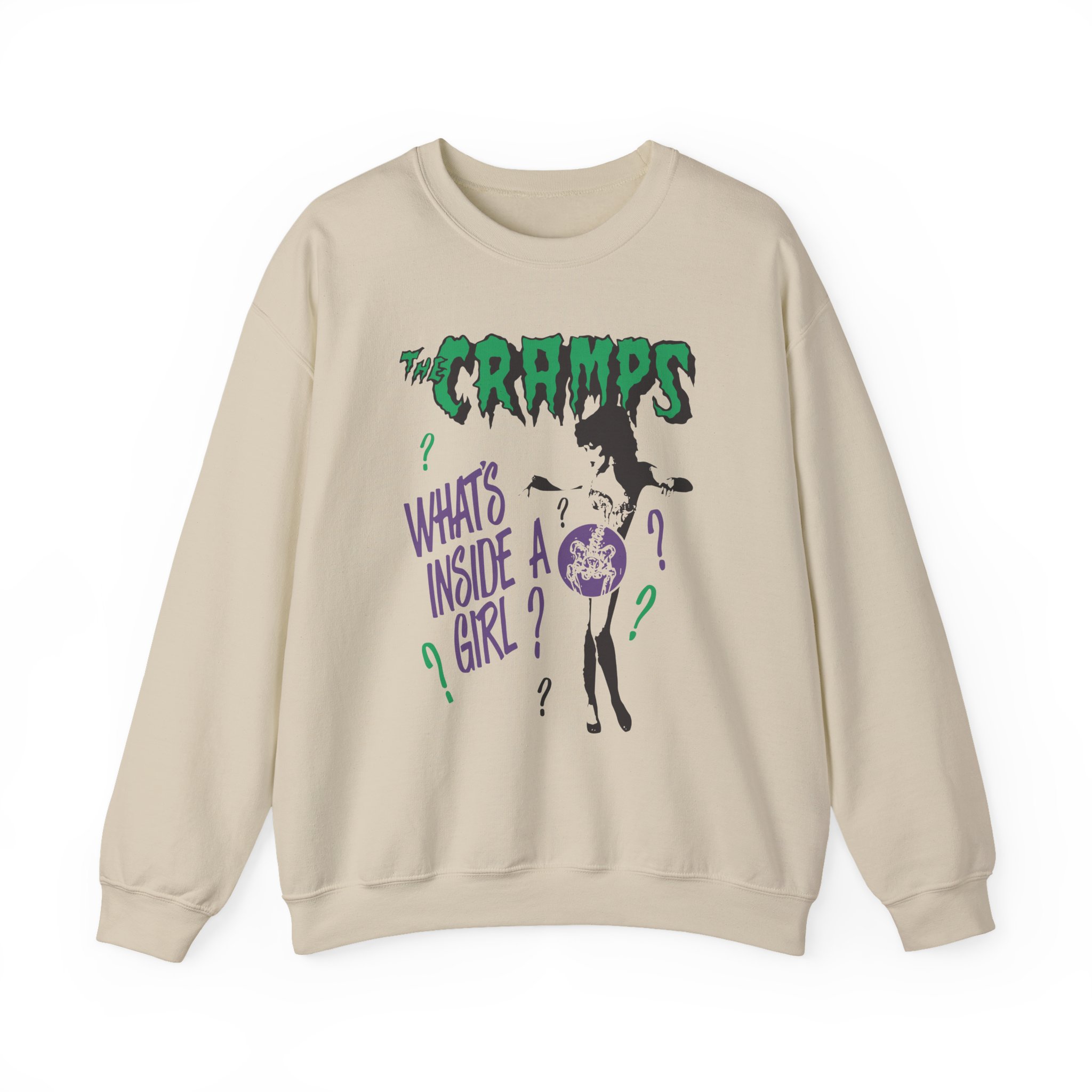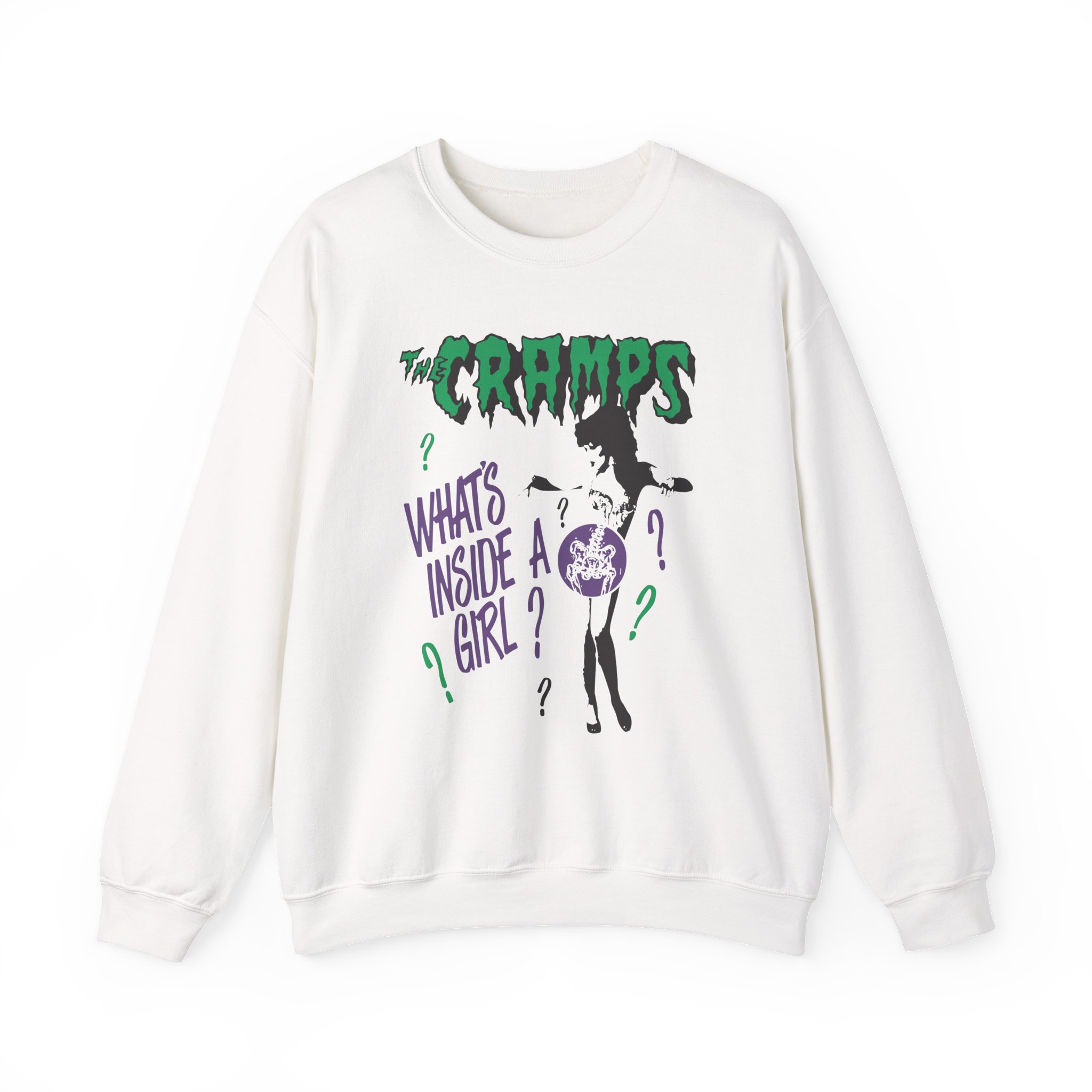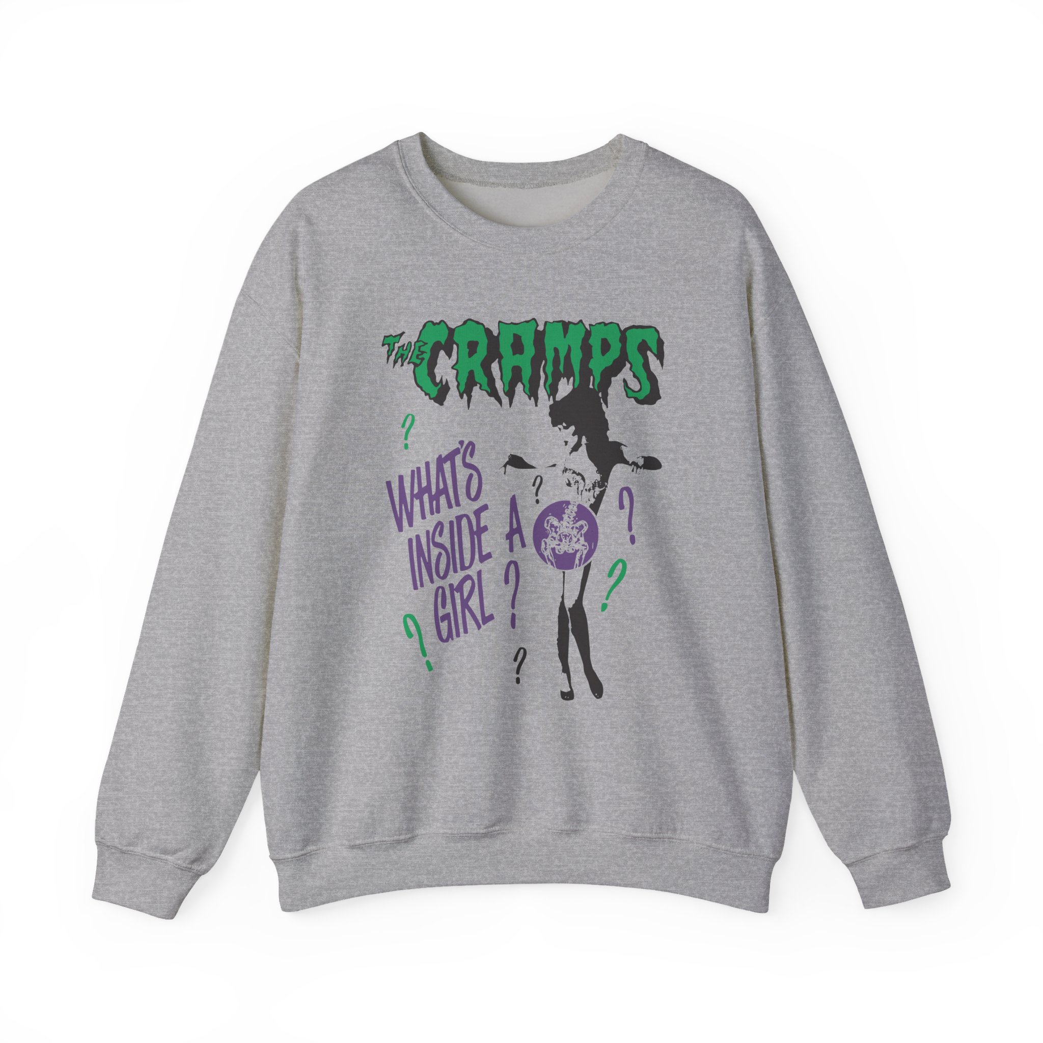 Ideal for any situation, a The Cramps What’s Inside a Girl unisex heavy blend crewneck sweatshirt is pure comfort. These garments are made from polyester and cotton. This combination helps designs come out looking fresh and beautiful. The collar is ribbed knit, so it retains its shape even after washing. There are no itchy side seams on these sweaters.