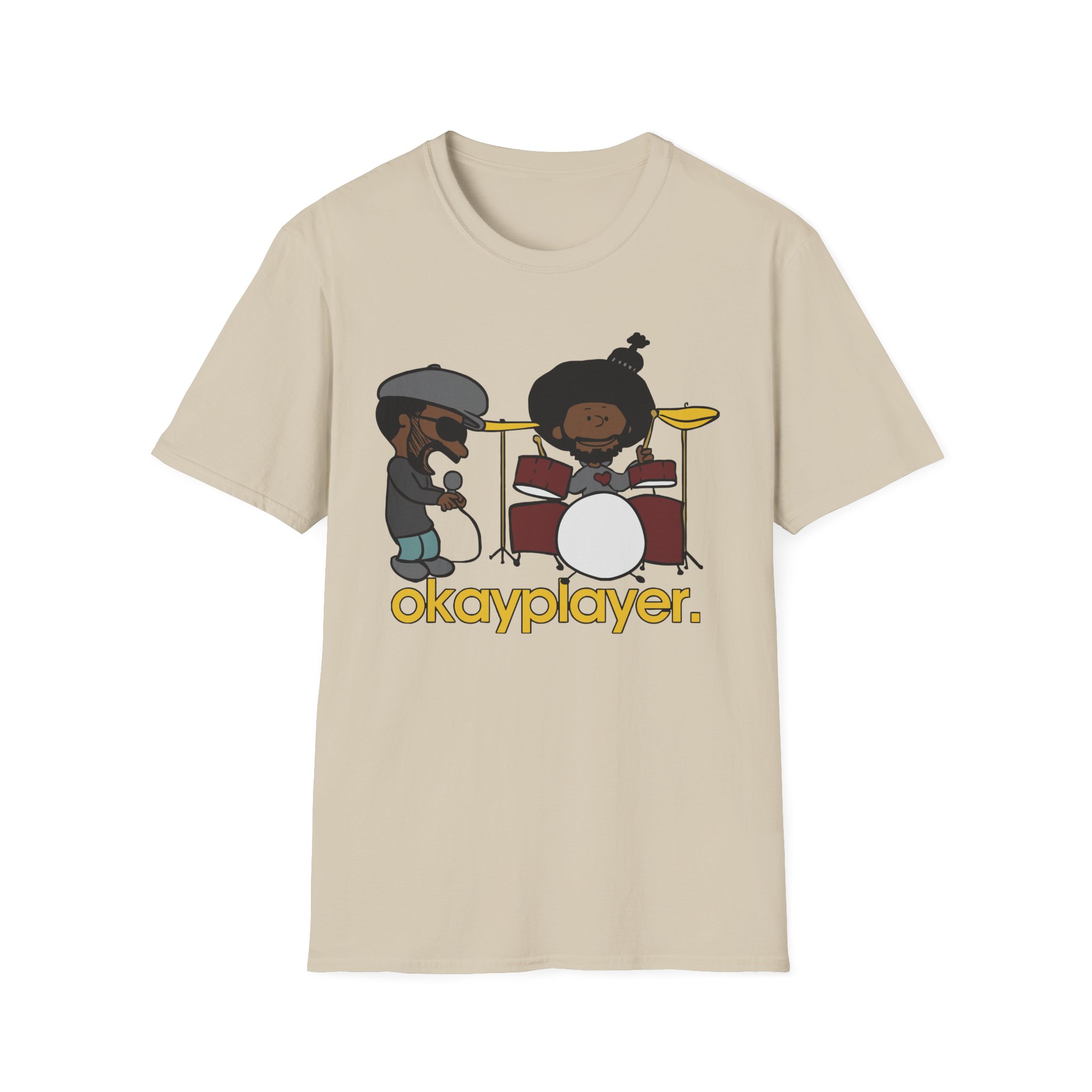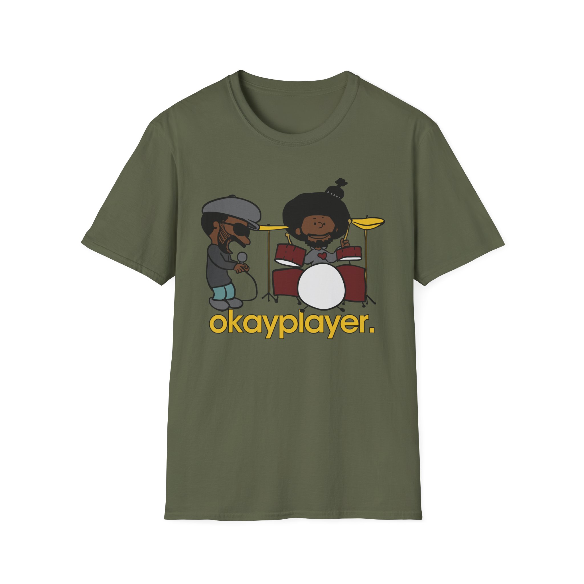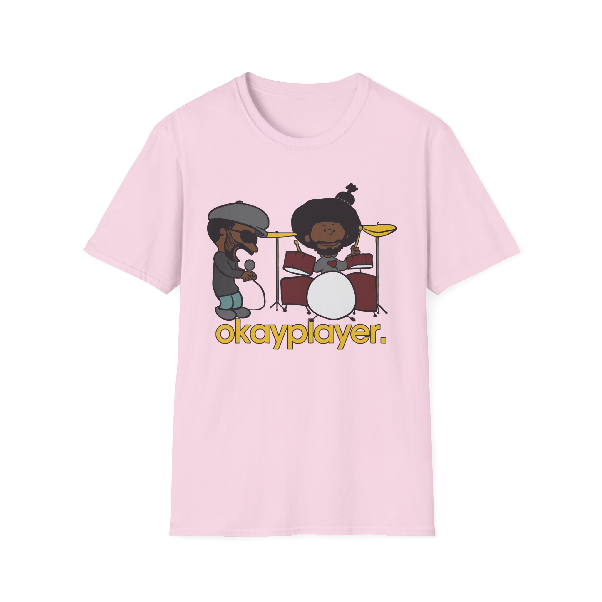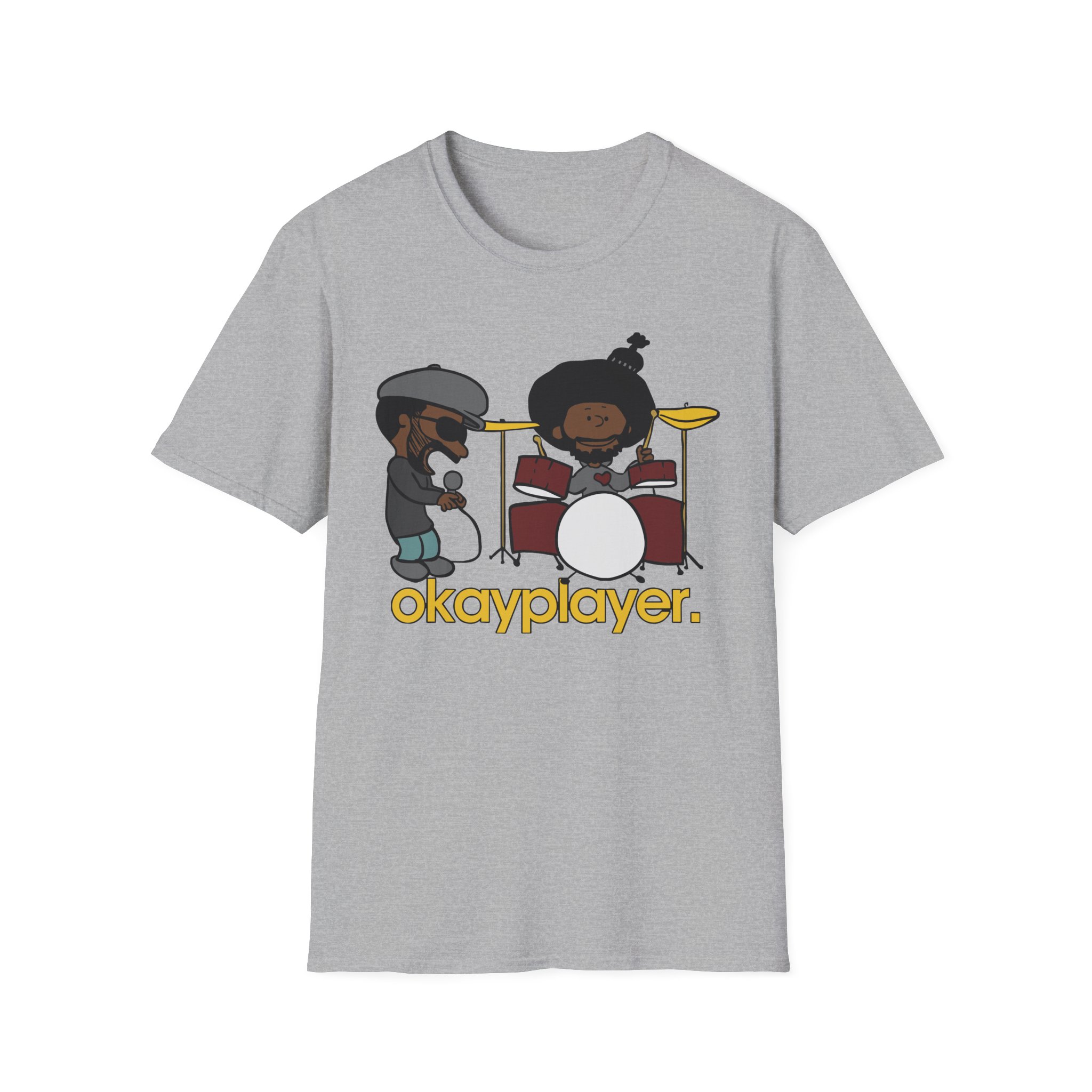 The Roots Black Thought & Questlove Okayplayer unisex soft-style t-shirt puts a new spin on casual comfort. Made from very soft materials, this tee is 100% cotton for solid colors. Heather colors and sports grey include polyester. The shoulders have twill tape for improved durability. There are no side seams. The collar is made with ribbed knitting to prevent curling damage.